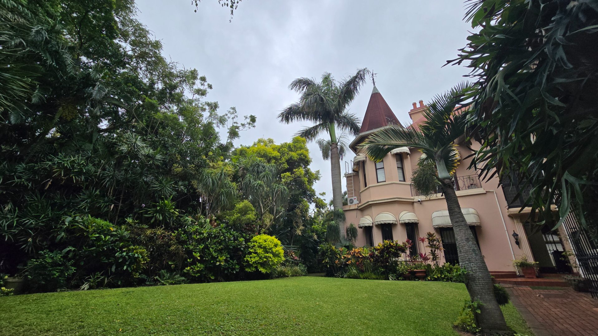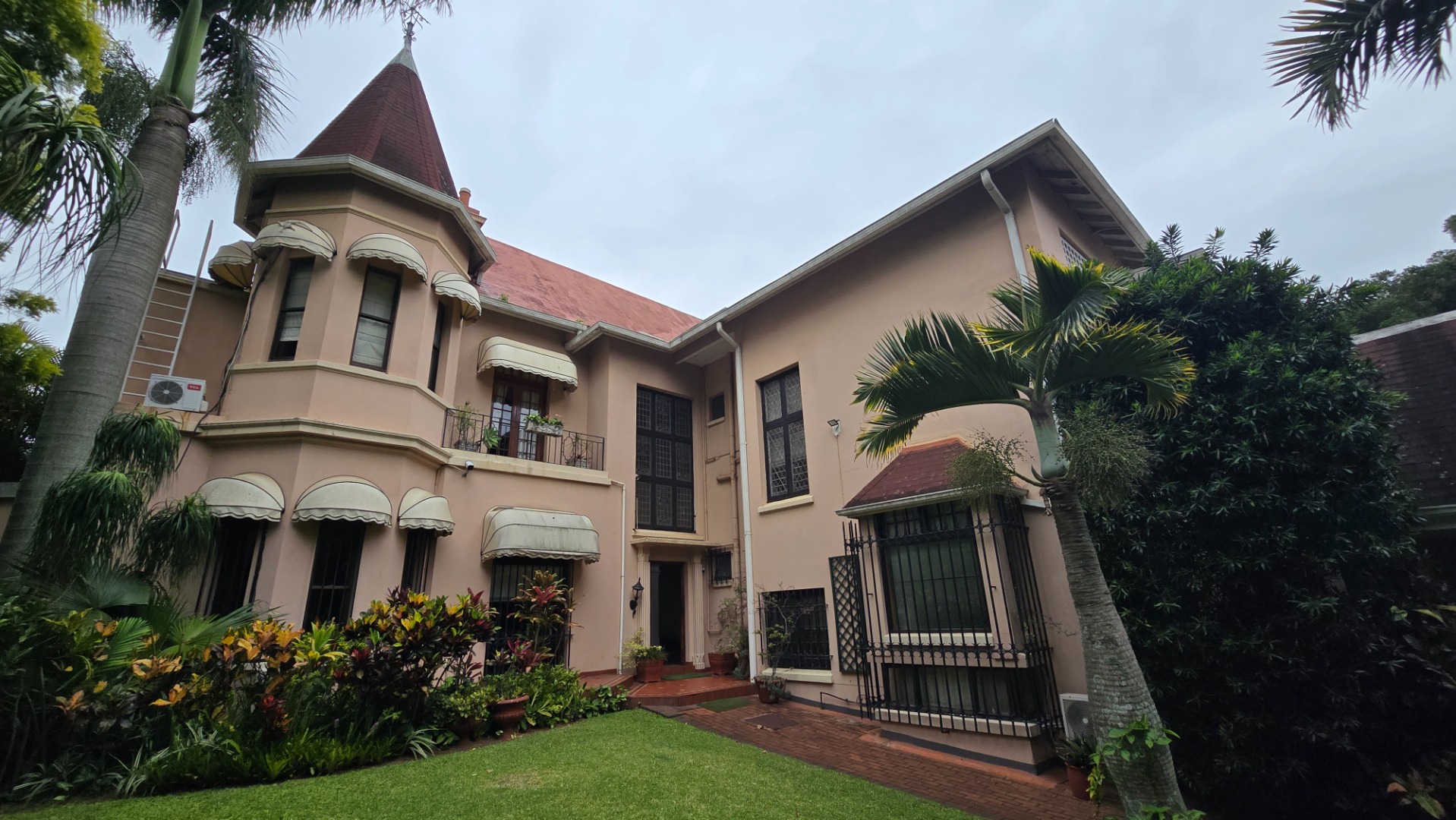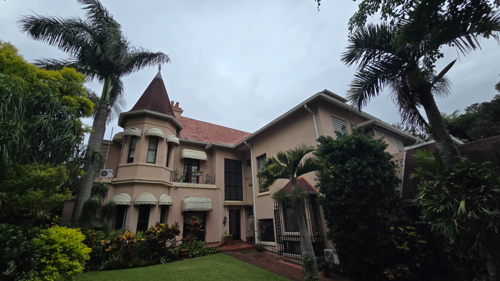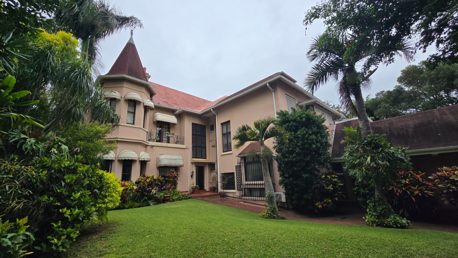 A distinctive multi-story residence in Essenwood, Durban, immediately captivates with its unique architectural style, featuring a prominent red-roofed turret and decorative window awnings. Surrounded by lush, mature tropical landscaping and a well-maintained lawn, this substantial property offers a grand and private feel, promising a home of character.