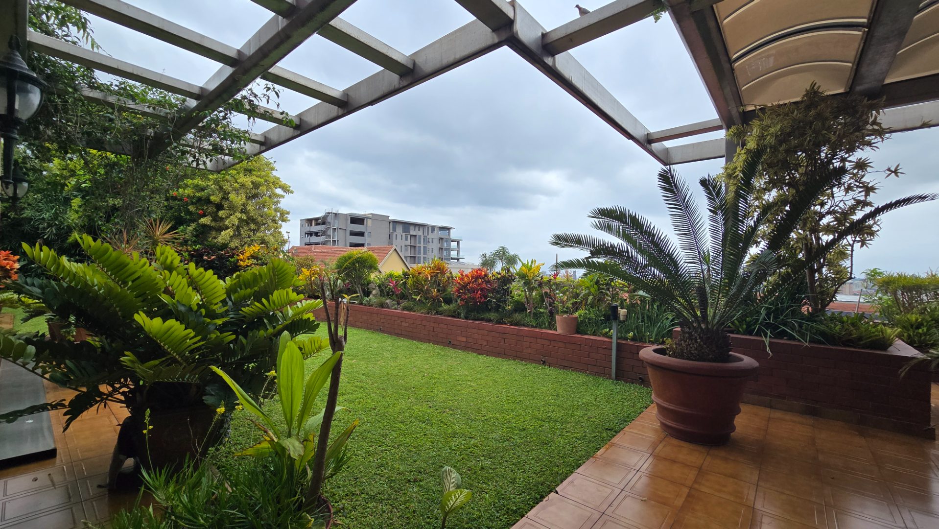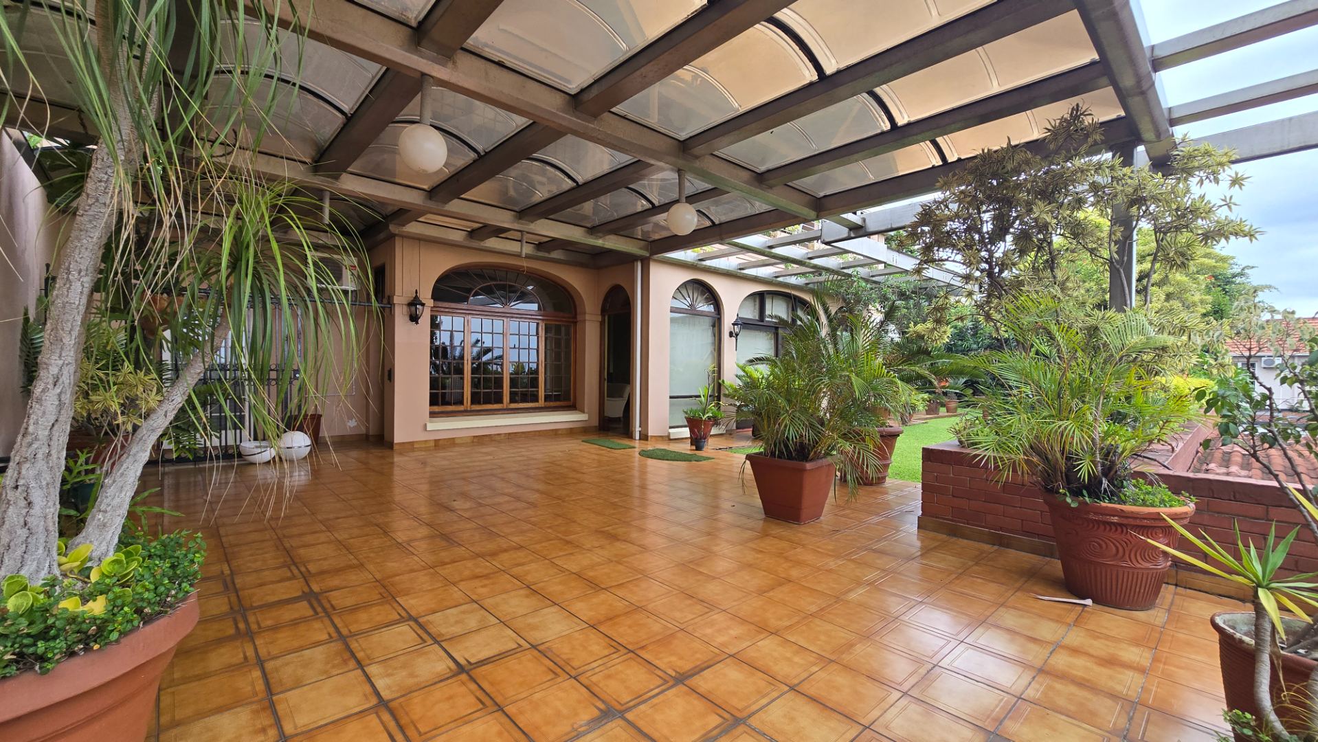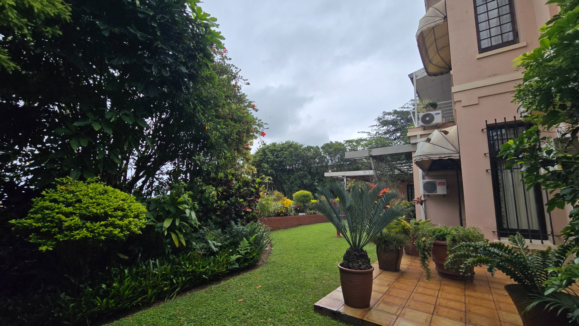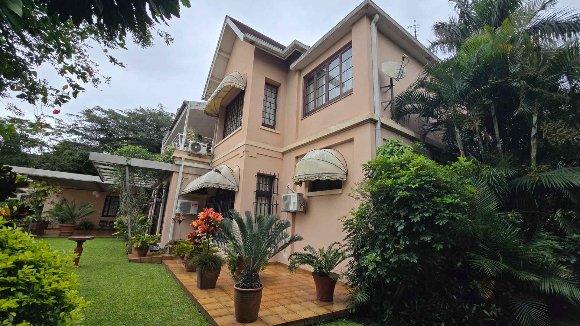 A distinctive multi-story residence in Essenwood, Durban, immediately captivates with its unique architectural style, featuring a prominent red-roofed turret and decorative window awnings. Surrounded by lush, mature tropical landscaping and a well-maintained lawn, this substantial property offers a grand and private feel, promising a home of character.