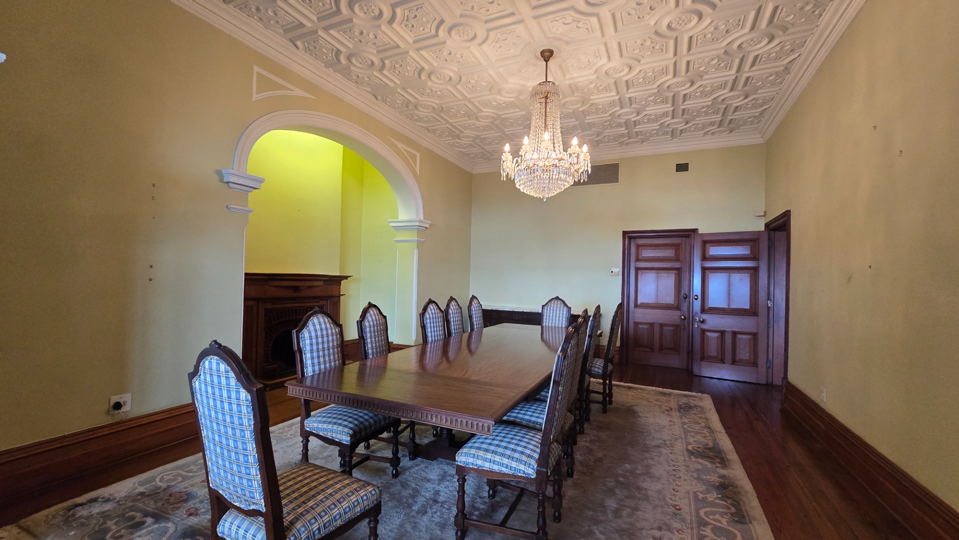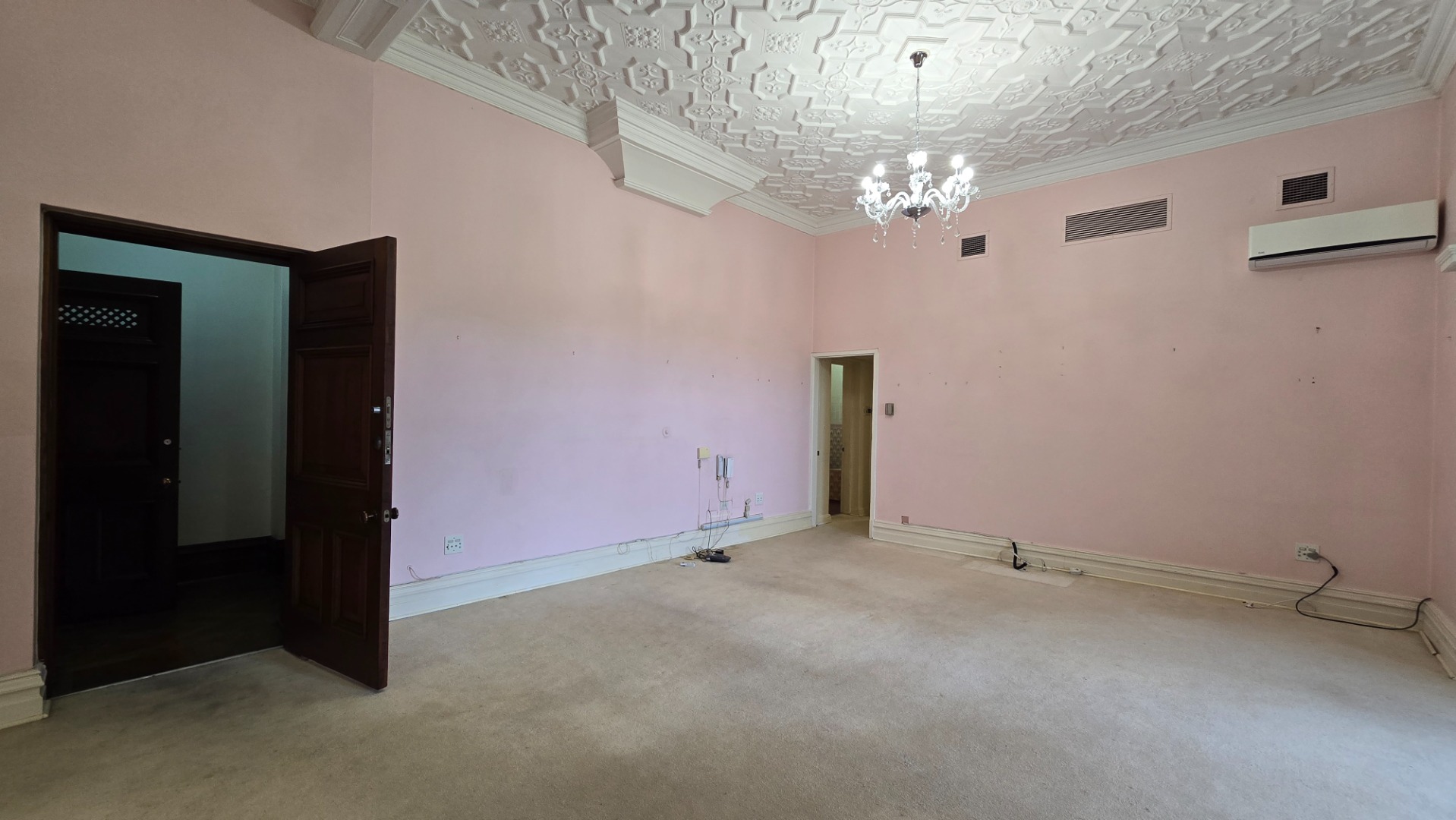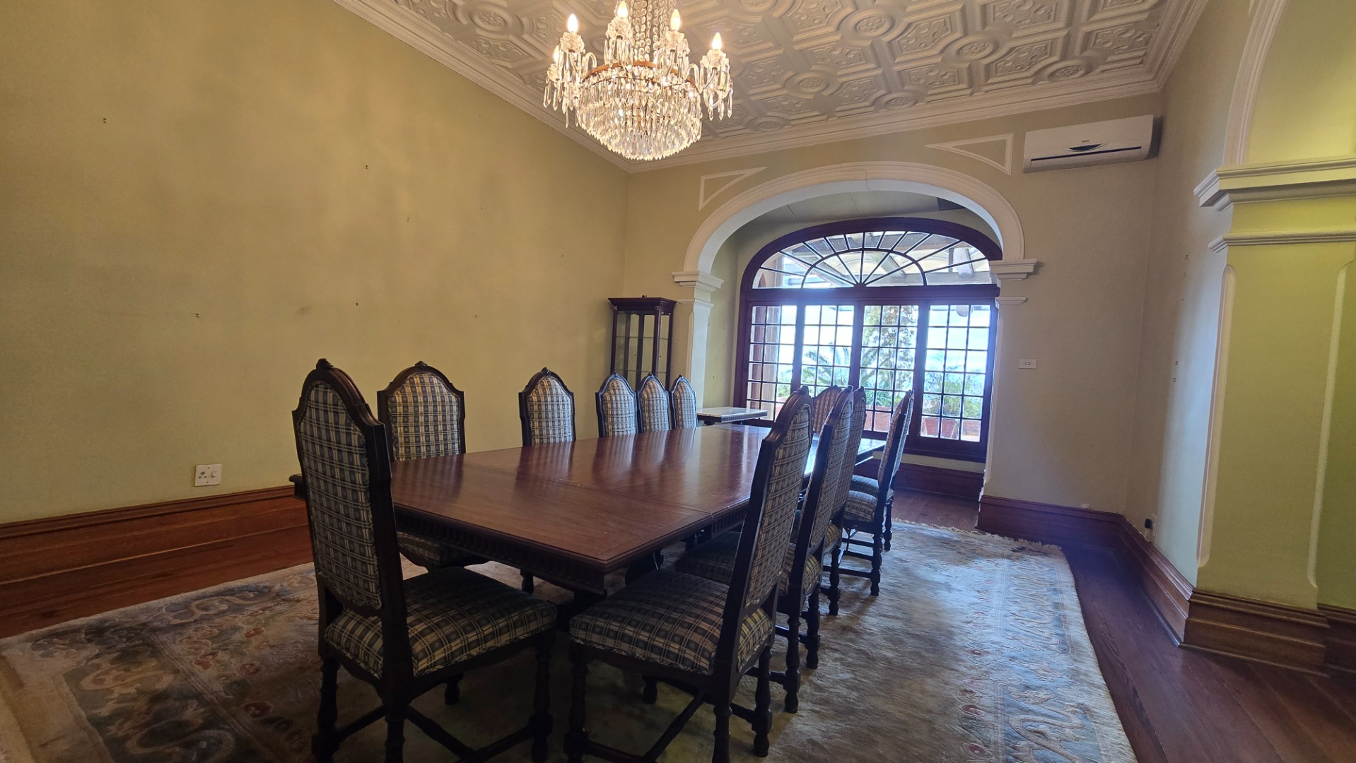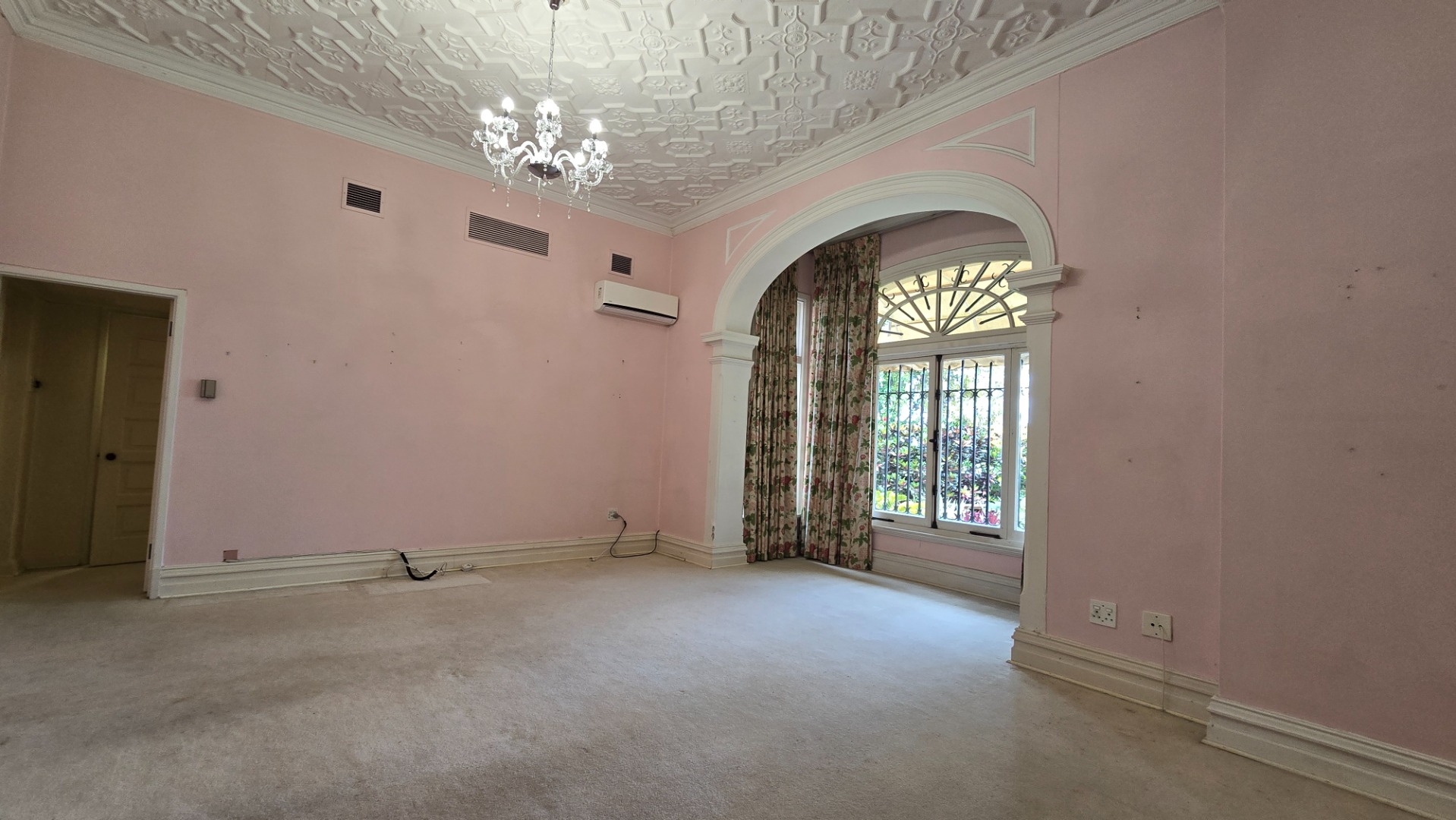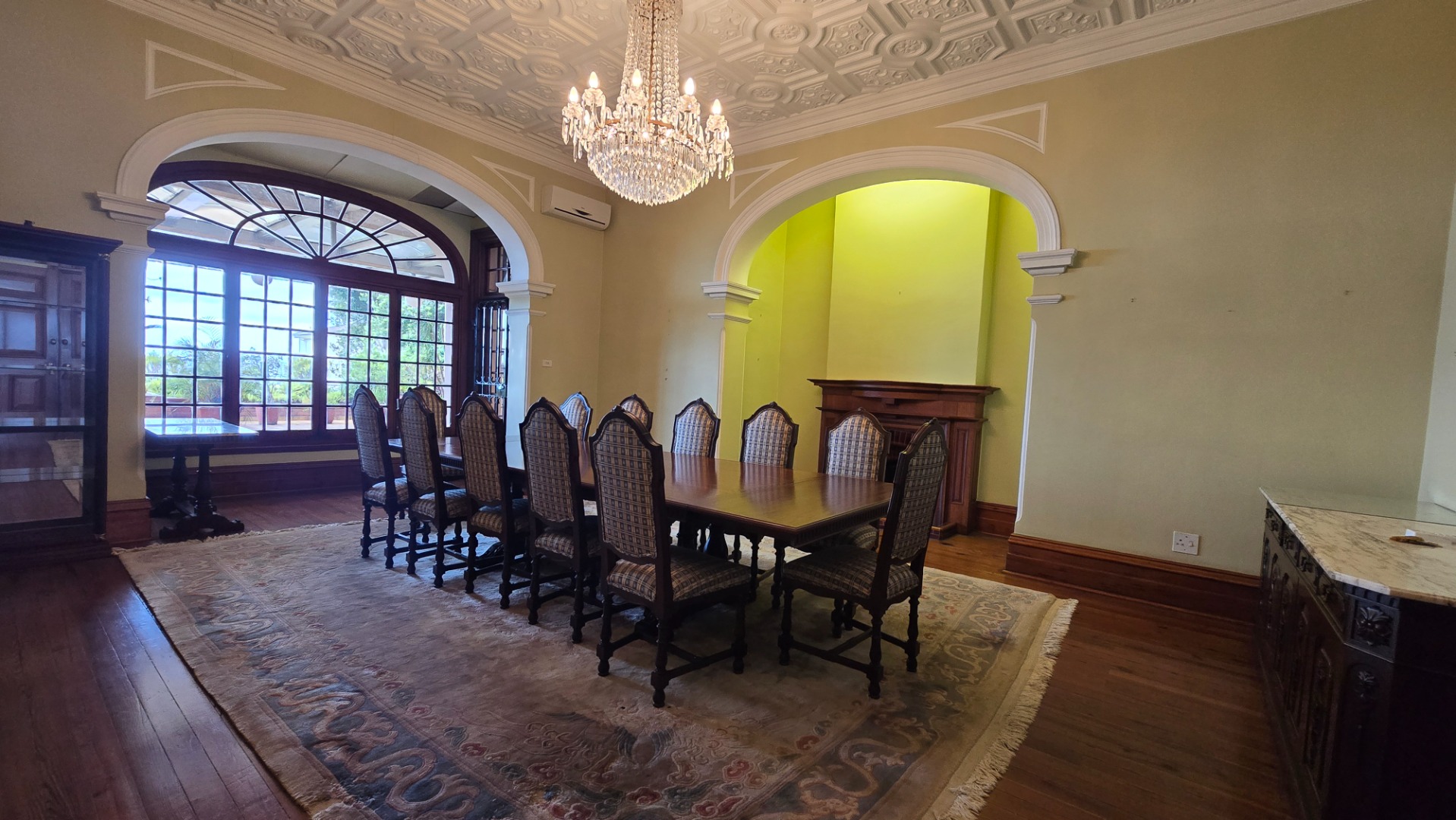 Step inside to beautiful open foyer. Ornate dark wood ceiling beams and trim, alongside architectural arches and large arched windows, infuse each space with timeless character. The residence includes a dedicated lounge which is large enough to be a formal lounge and TV lounge. The dining room is very spacious with stunning Victorian style ceiling with crystal chandelier and original fireplace., While the property presents a canvas for modernization, its classic features like a fireplace, pantry, and air conditioning units offer a solid foundation for a dream renovation.