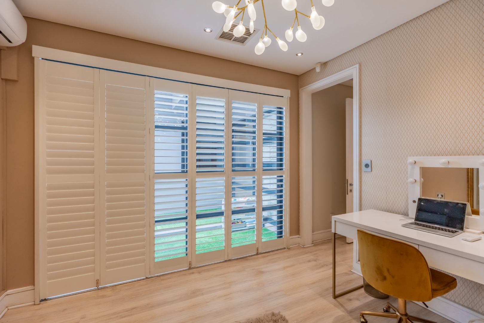 Polished light-coloured porcelain flooring, high ceilings with skylight creating abundant natural light create a bright, airy atmosphere throughout. Large glass doors and windows are complemented by plantation shutters for both style and privacy.