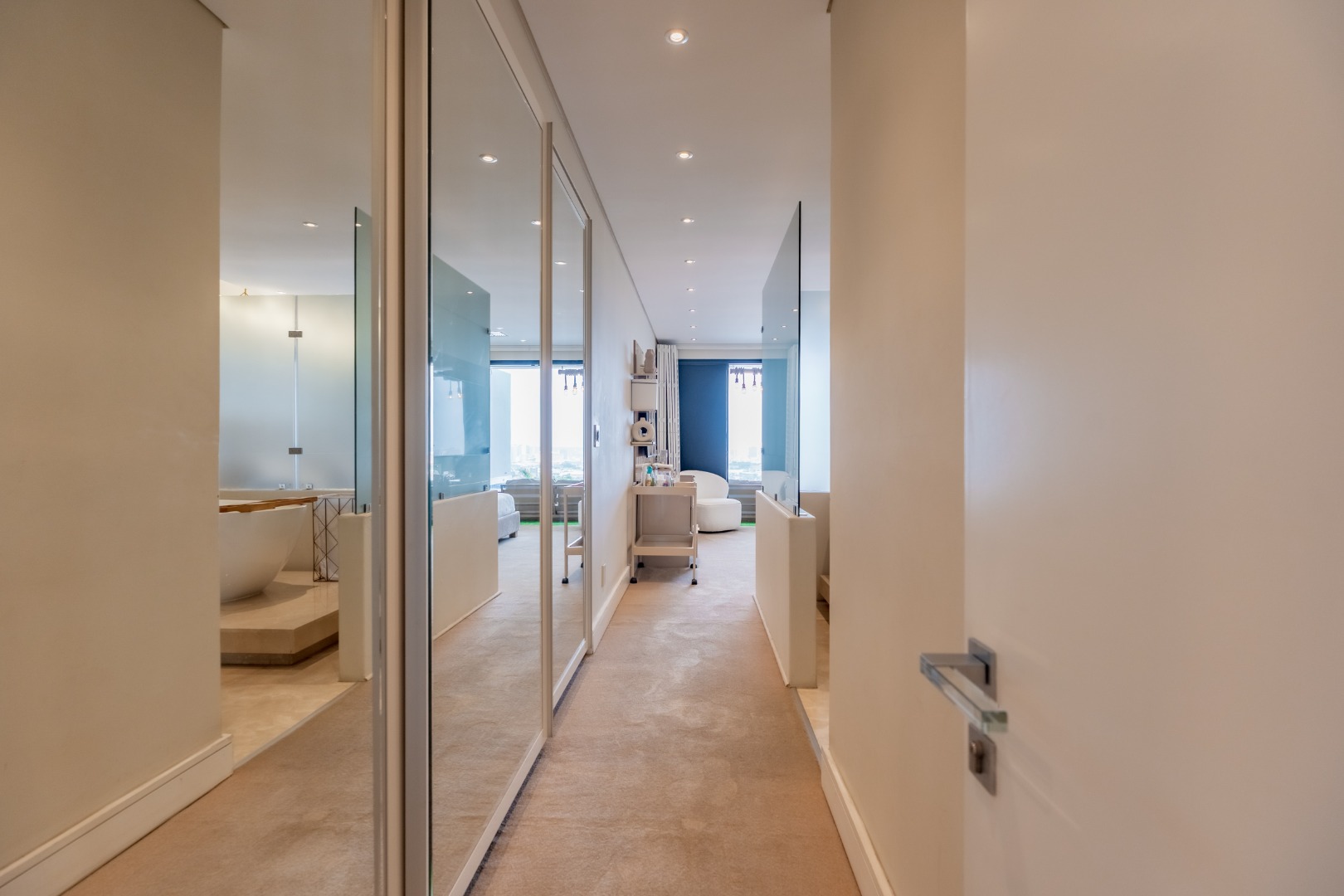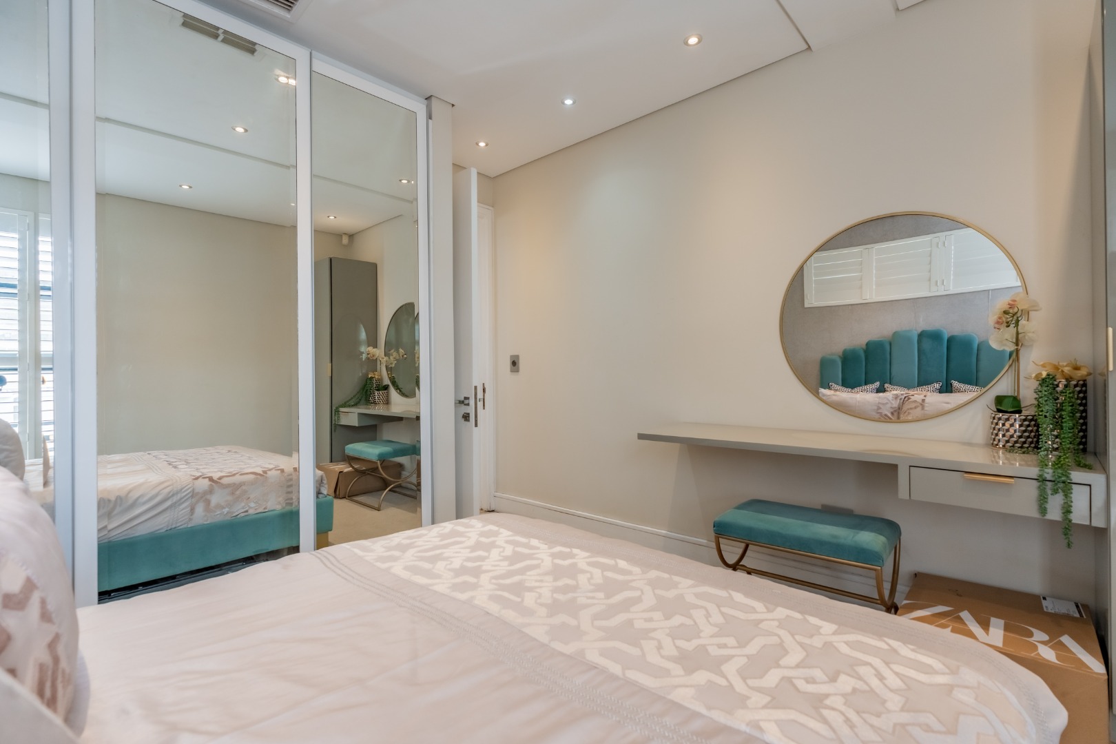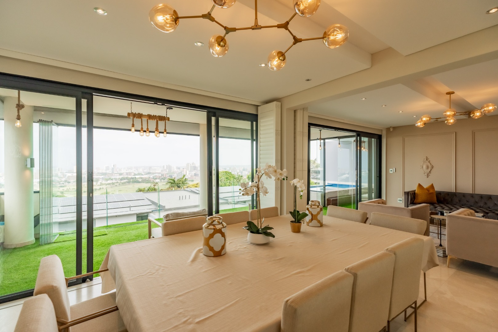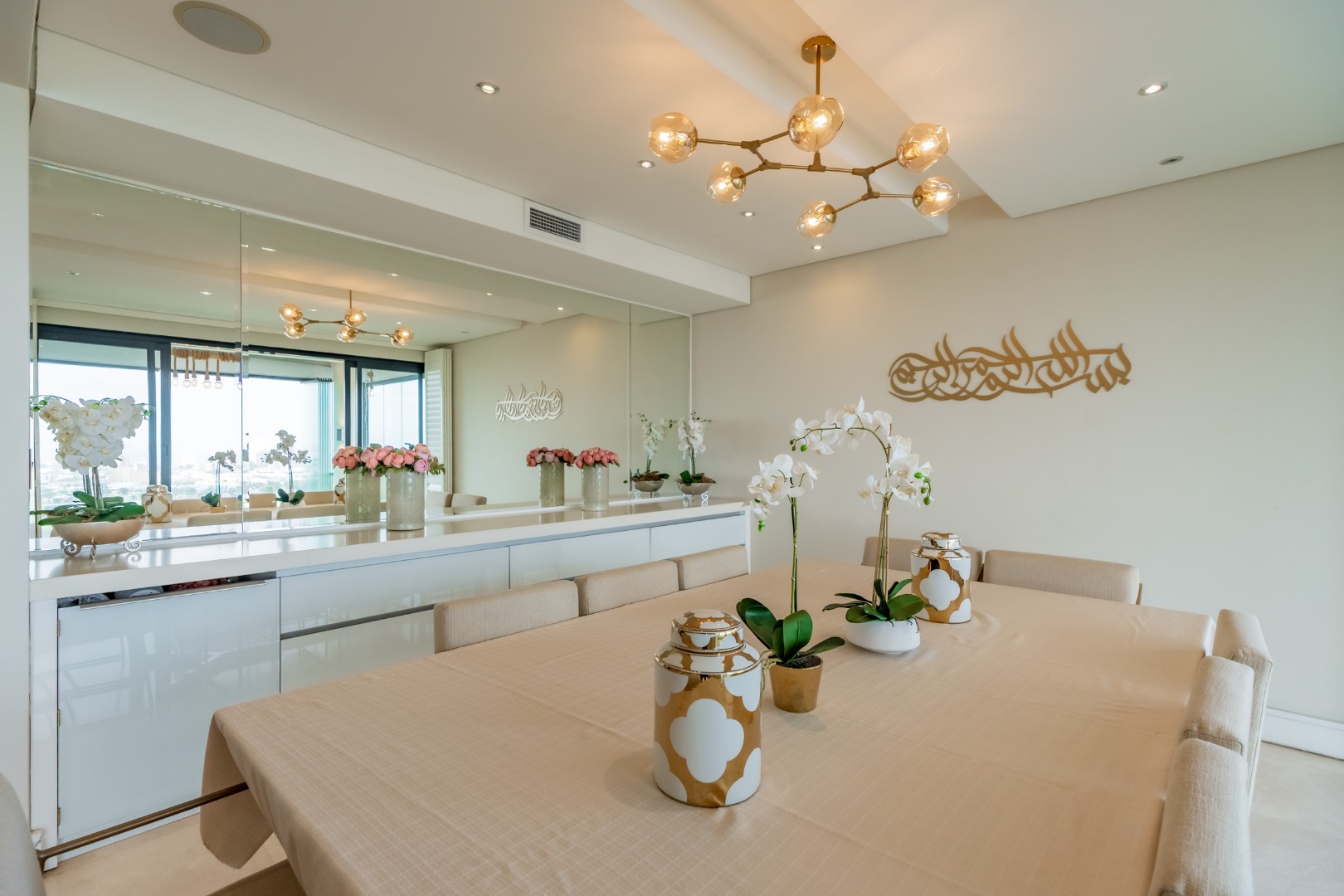 The elegant dining room features custom built-in cupboards and also opens onto the balcony, enhancing the seamless indoor-outdoor flow. A private rim-flow swimming pool completes the entertainment area, offering the same magnificent views over Durban.