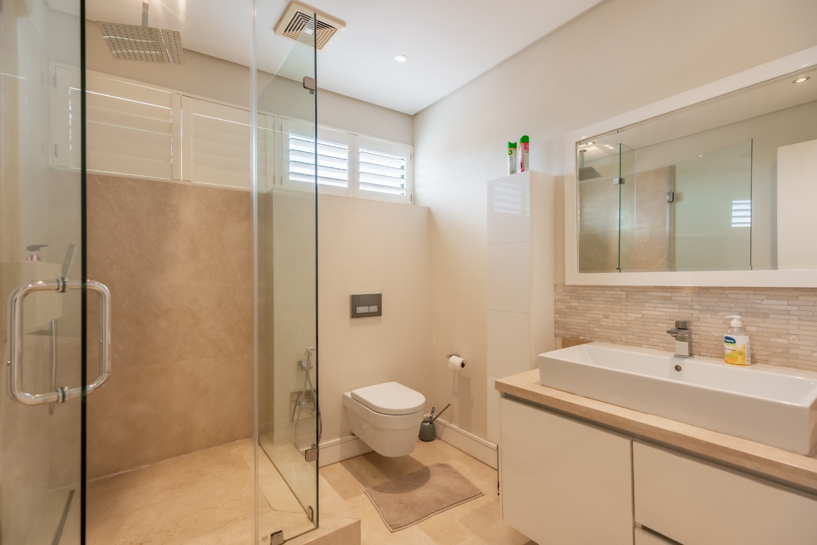 The home offers four spacious bedrooms, all with built-in cupboards, and three bathrooms, including two en-suite bathrooms. Two bathrooms feature showers, while the main en-suite includes both a bath and shower. Modern finishes and quality fixtures are evident throughout.