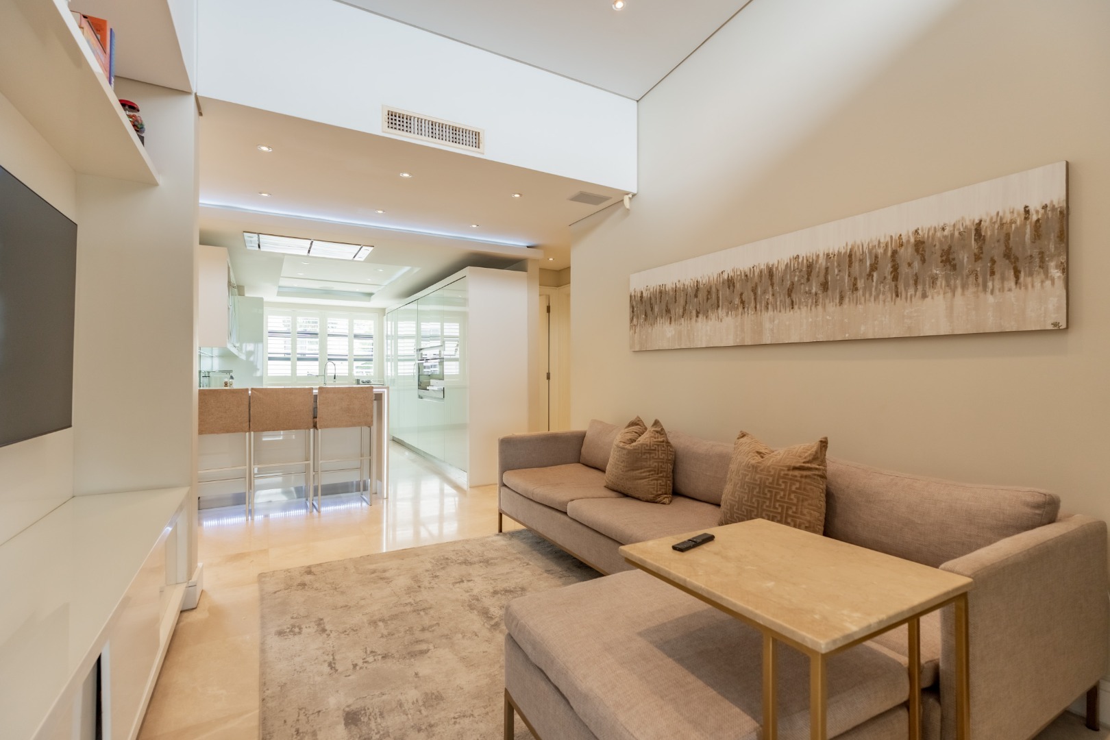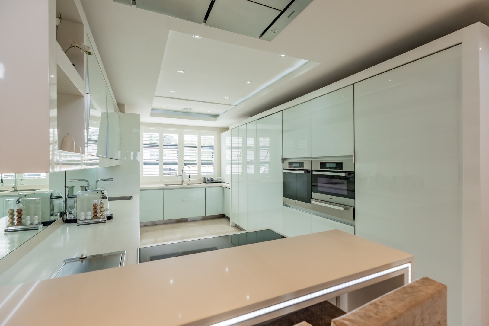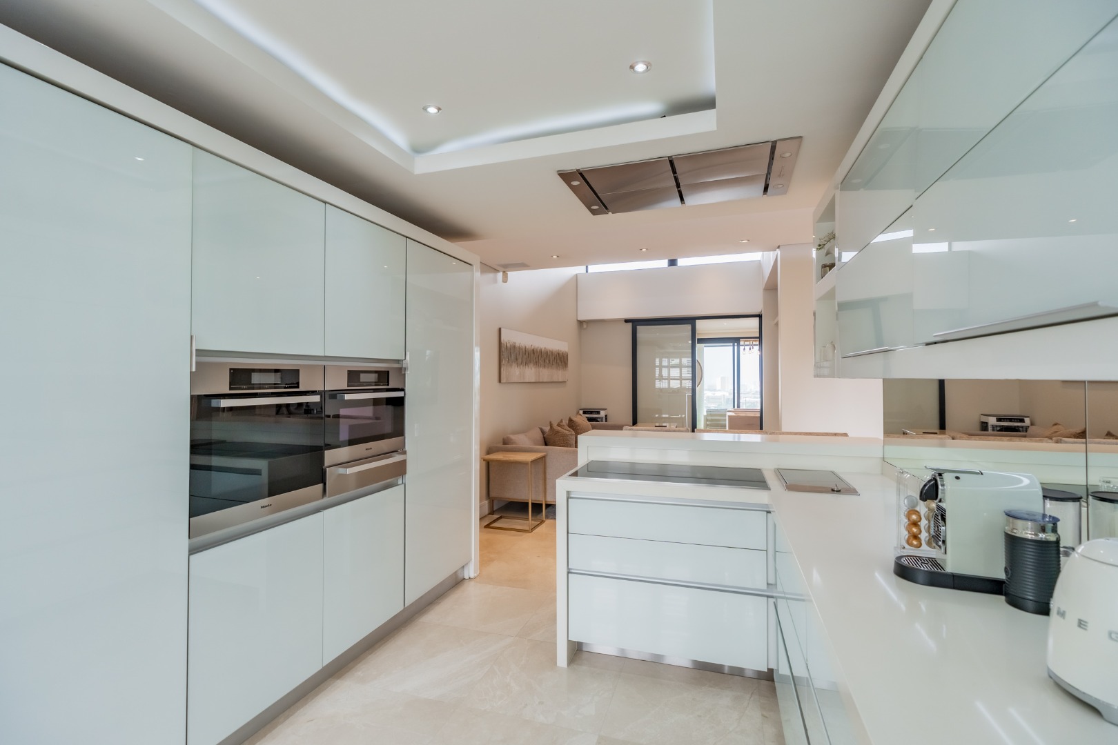 The modern open plan kitchen is fitted with Caesarstone countertops and a breakfast nook and includes high-end integrated appliances: Miele stove and oven, extractor fan, and built-in fridge and freezer for a sleek, uncluttered finish.