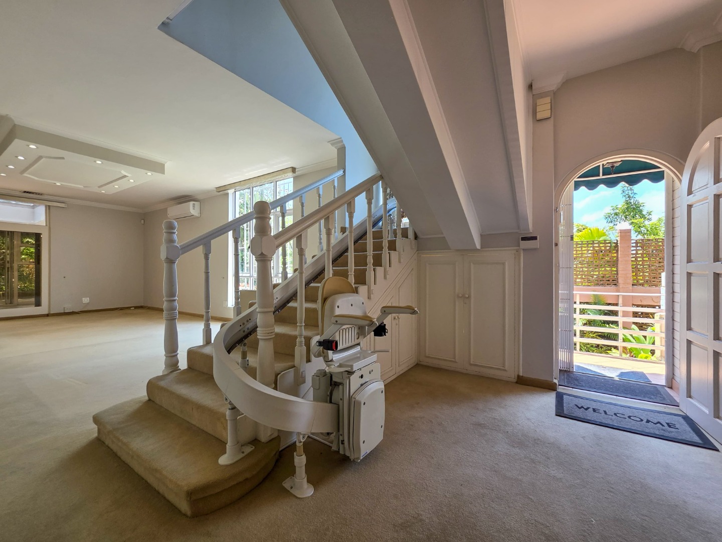 Modern comforts include ducted air-conditioning and split units throughout (including the kitchen). Security is paramount, with an on-site night guard, remote-access driveway gate, electric perimeter fencing, and a fitted chair lift for easy second-floor access. Skylights further enhance the natural light, helping to reduce electricity consumption.