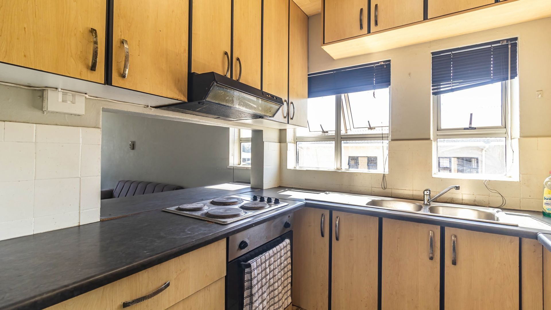 Inside, the apartment offers a well-designed open-plan lounge and dining area, enhanced by air-conditioning for year-round comfort. The fully fitted kitchen provides ample cupboard space and functionality, ideal for easy everyday living.