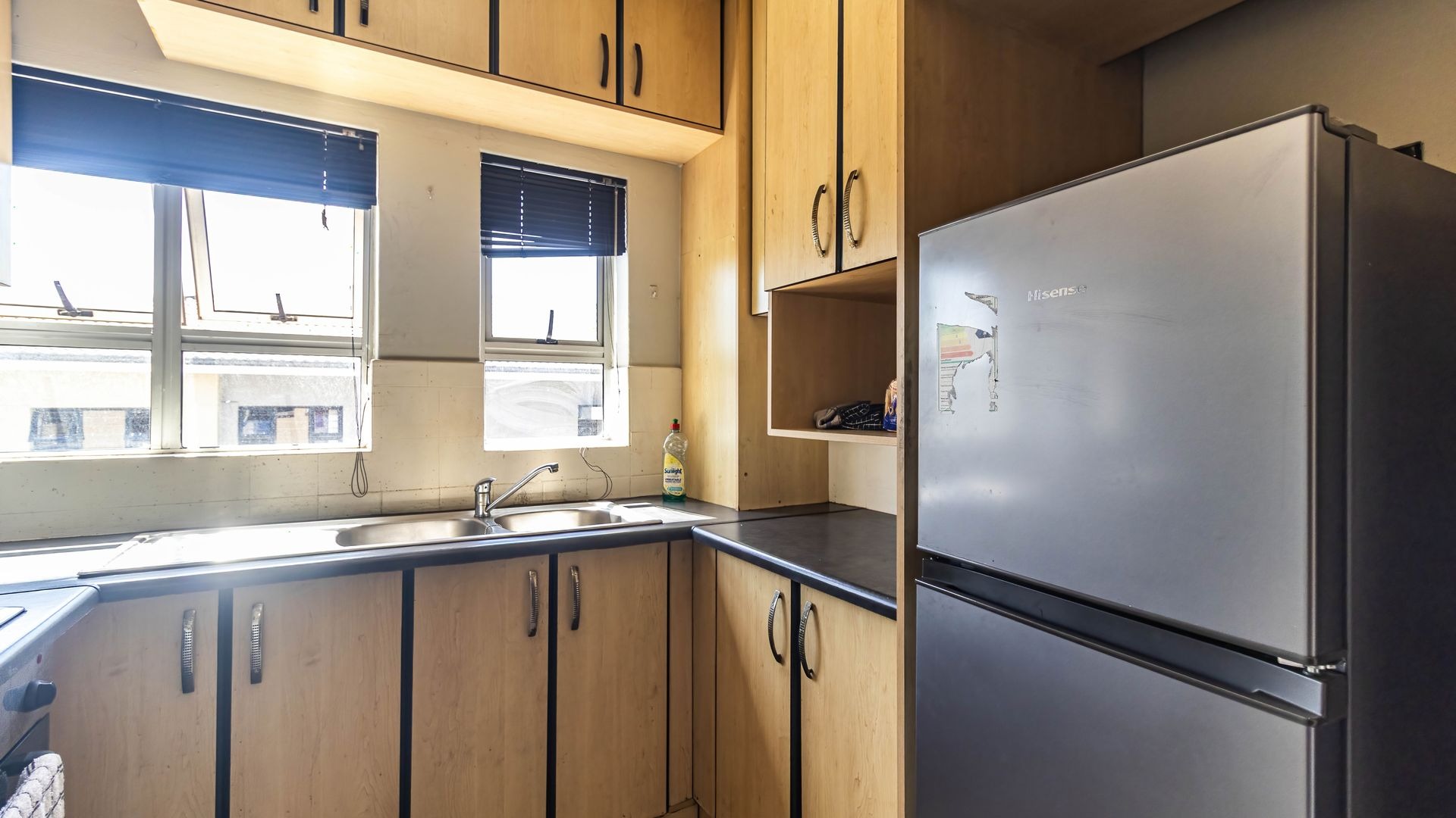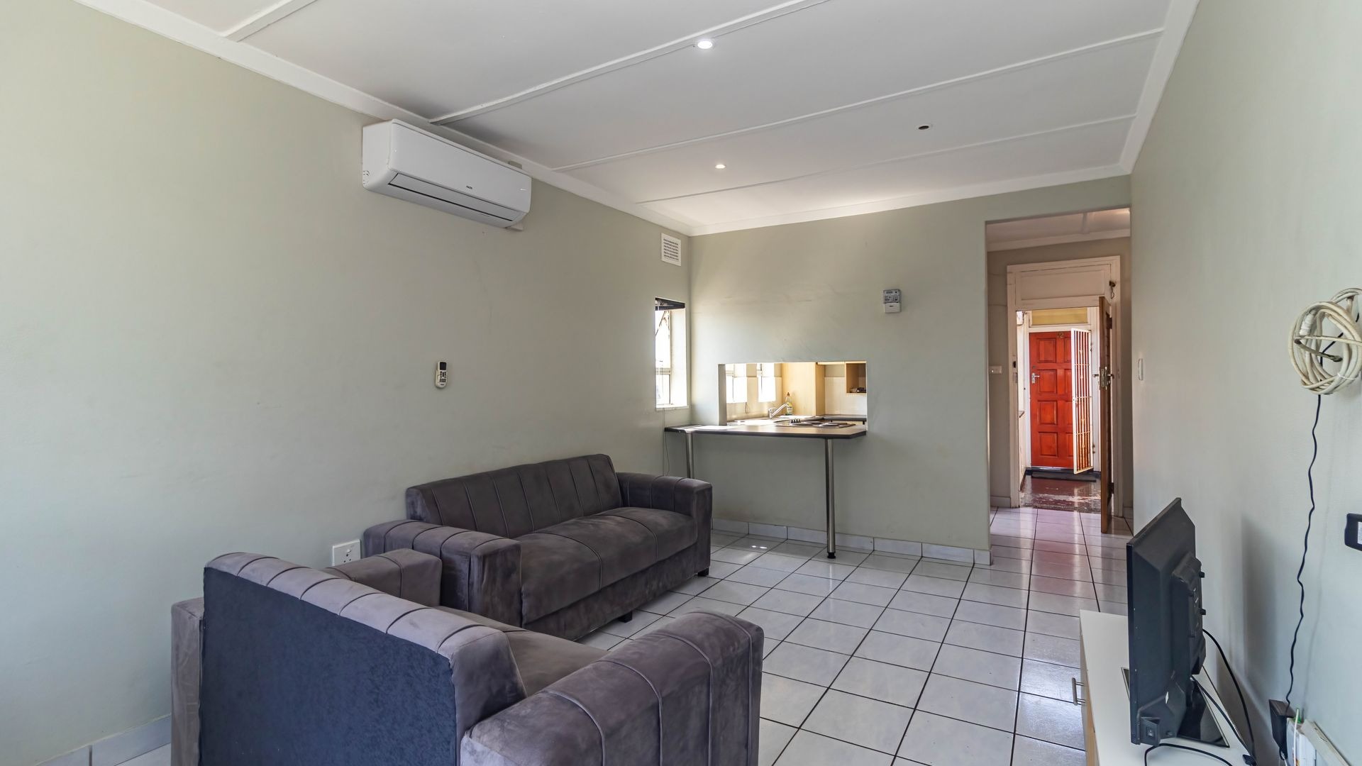 Inside, the apartment offers a well-designed open-plan lounge and dining area, enhanced by air-conditioning for year-round comfort. The fully fitted kitchen provides ample cupboard space and functionality, ideal for easy everyday living.