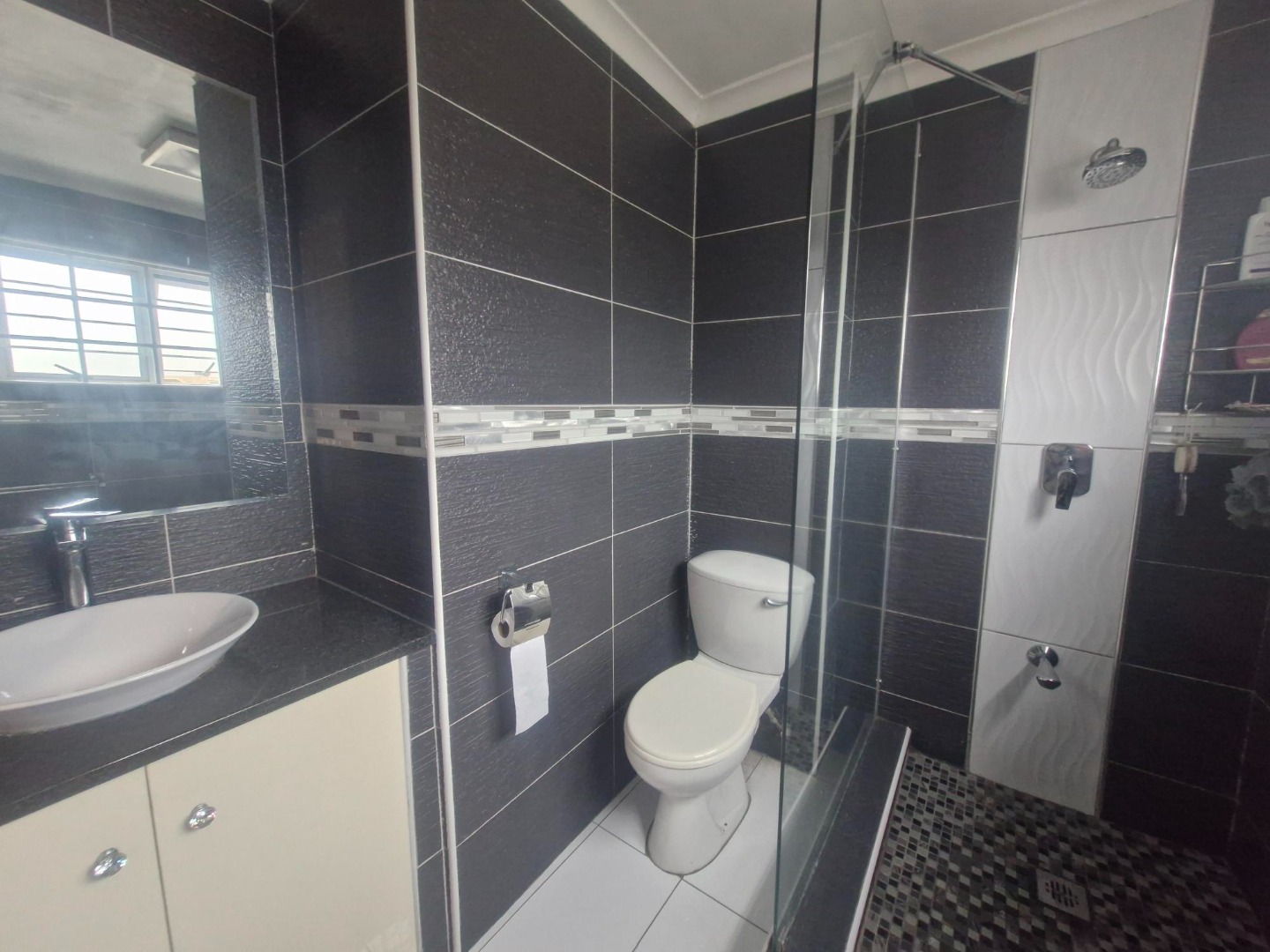 Downstairs, you'll find a modern Caesarstone kitchen leading to open-plan living areas. The spacious, maintenance-free outside entertainment area is perfect for braaing and sipping sundowners. There's even a guest loo downstairs!