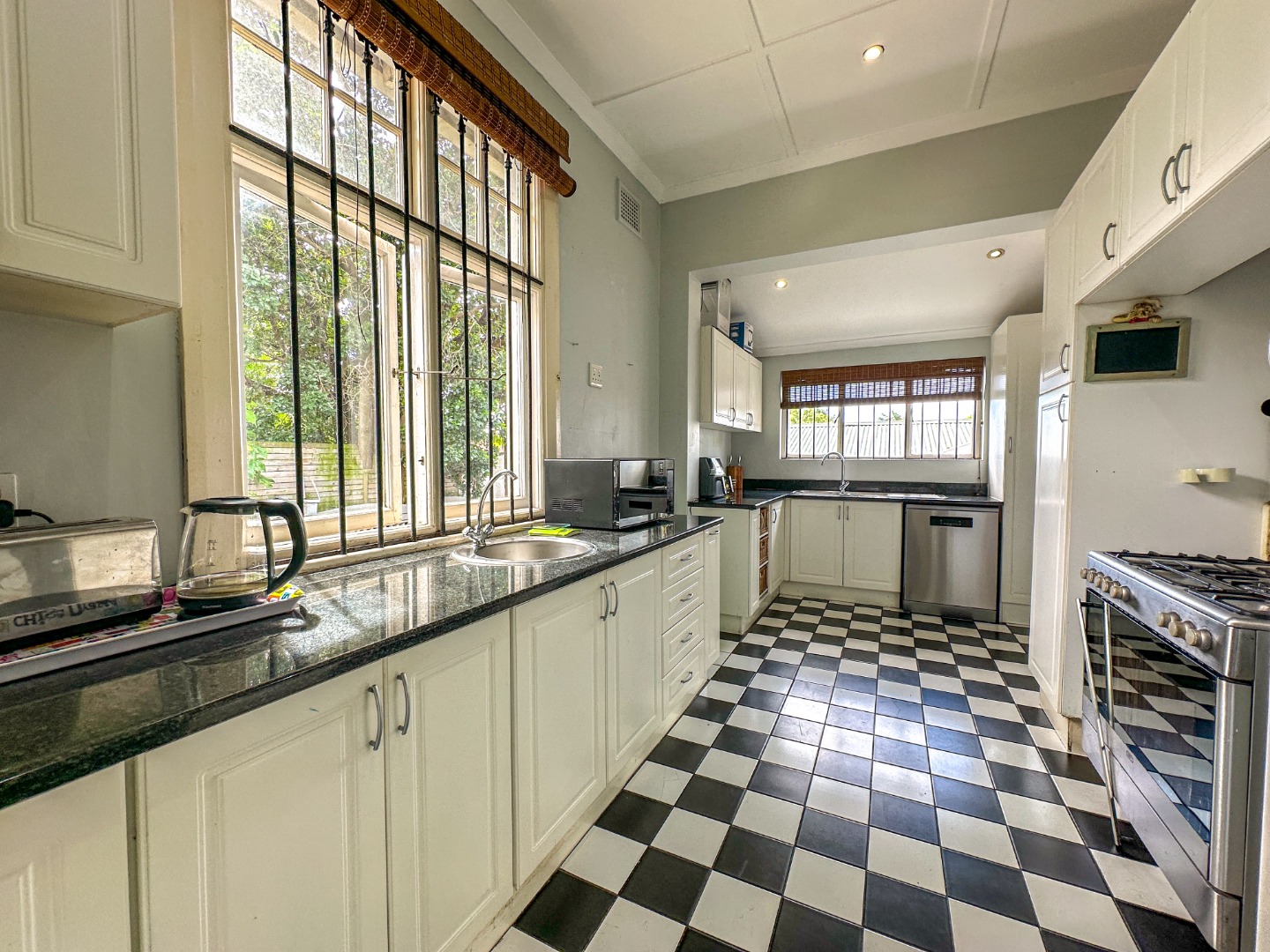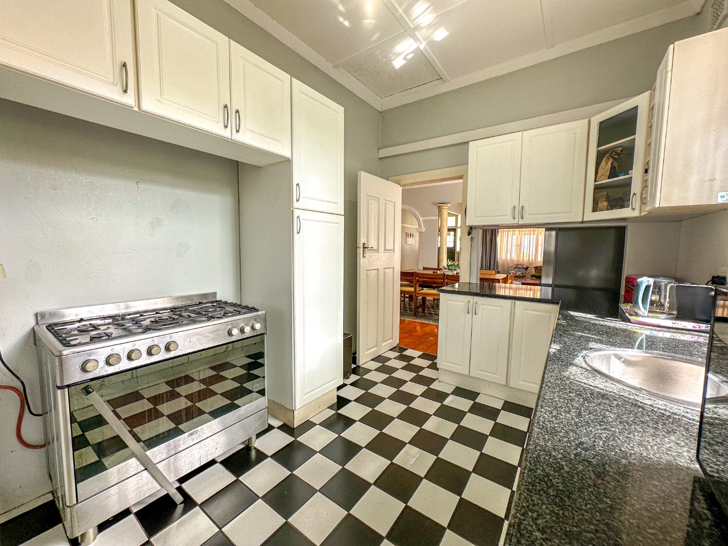Step inside to an inviting open-plan layout defined by polished wooden floorboards and impressive high coffered ceilings, creating an airy and elegant atmosphere. The living and dining areas are bright, benefiting from large windows, recessed lighting, and air conditioning. The well-appointed kitchen features extensive white cabinetry, dark granite countertops, a large gas stove, and a distinctive black and white checkered floor, flowing seamlessly into the main living spaces.
