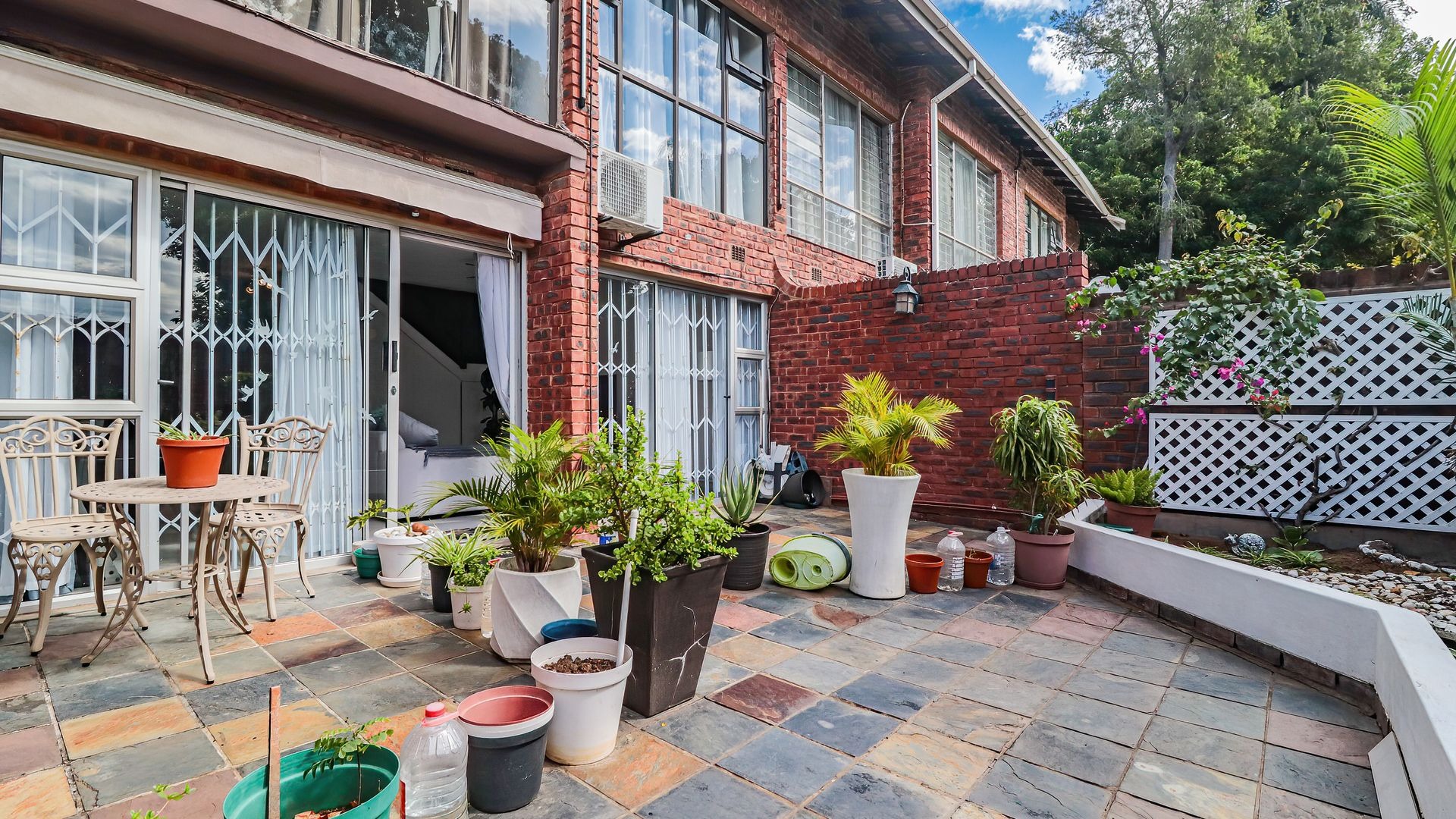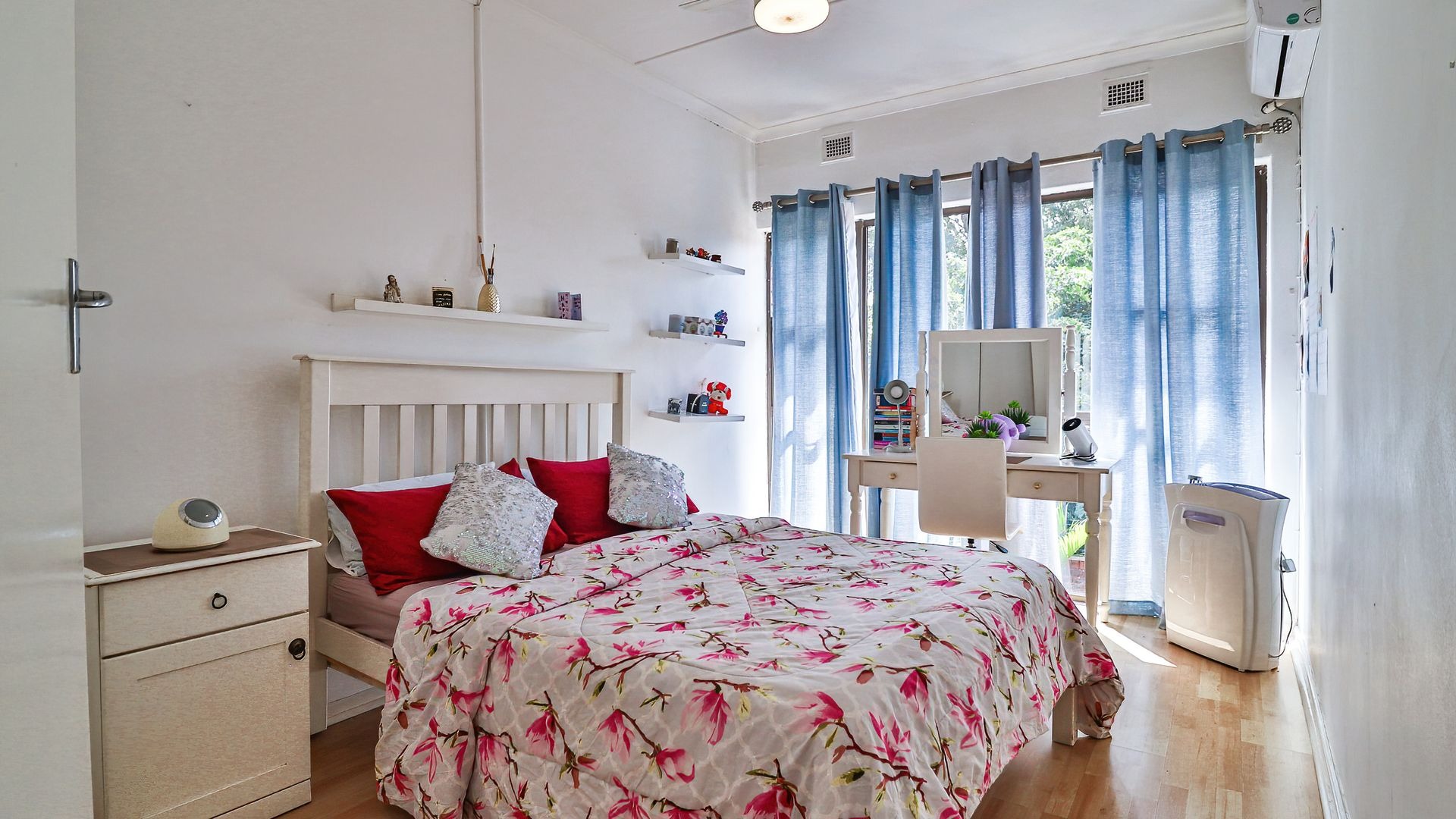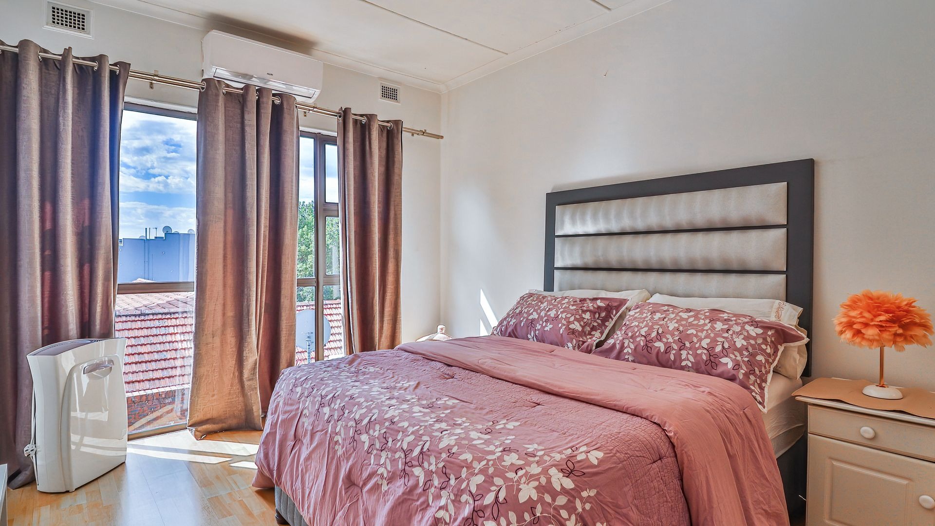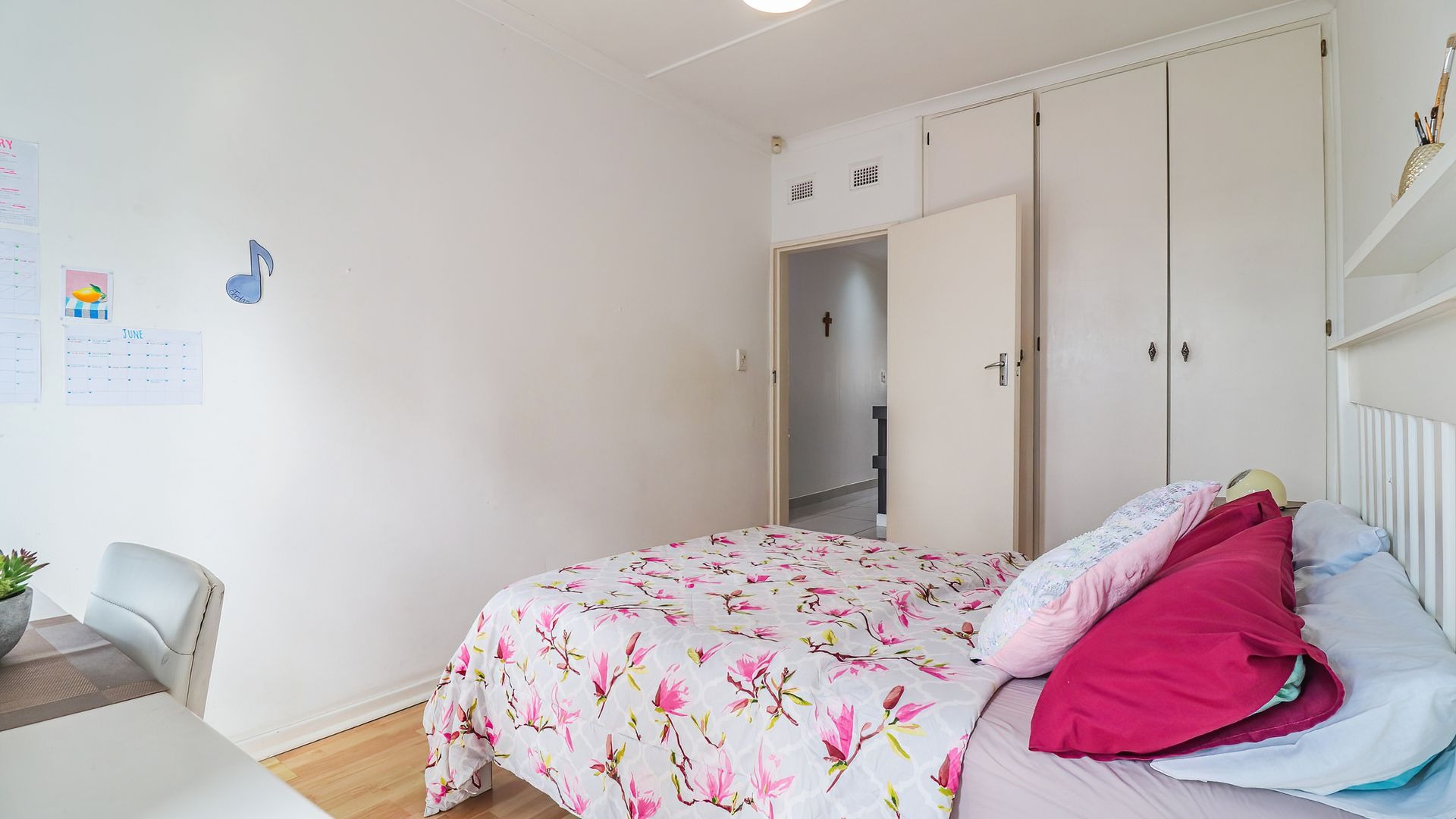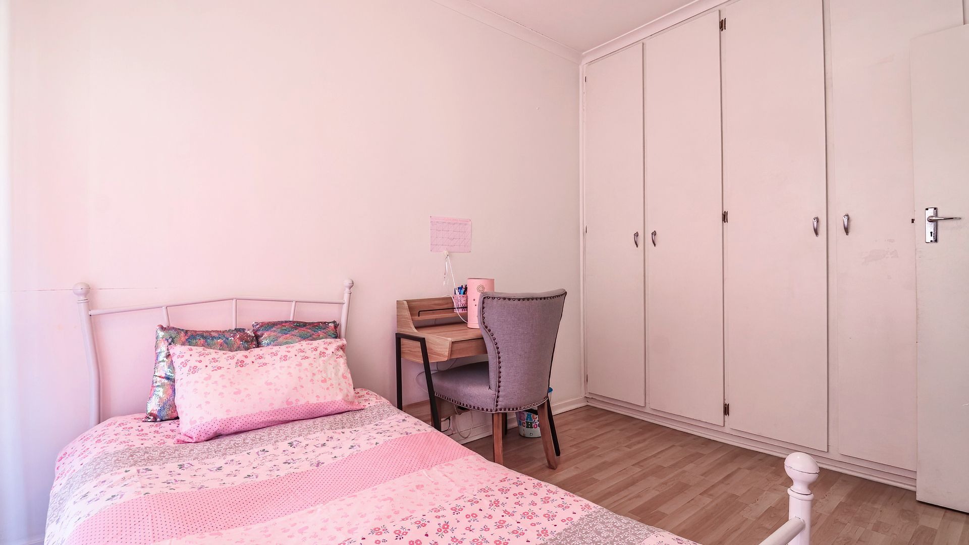 The property features three generously sized bedrooms, all fitted with built-in cupboards. The main bedroom includes a private en-suite bathroom, providing added comfort and privacy. Two of the bedrooms are air-conditioned, ensuring year-round comfort.