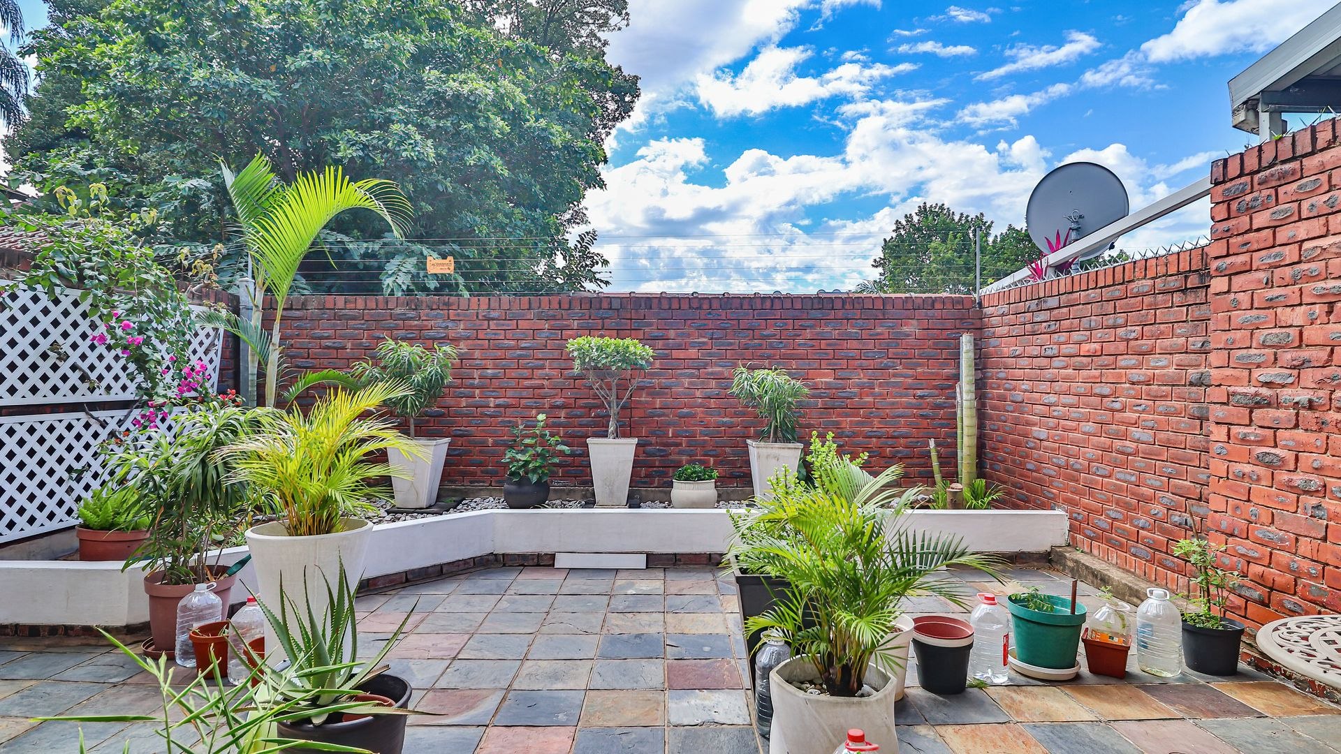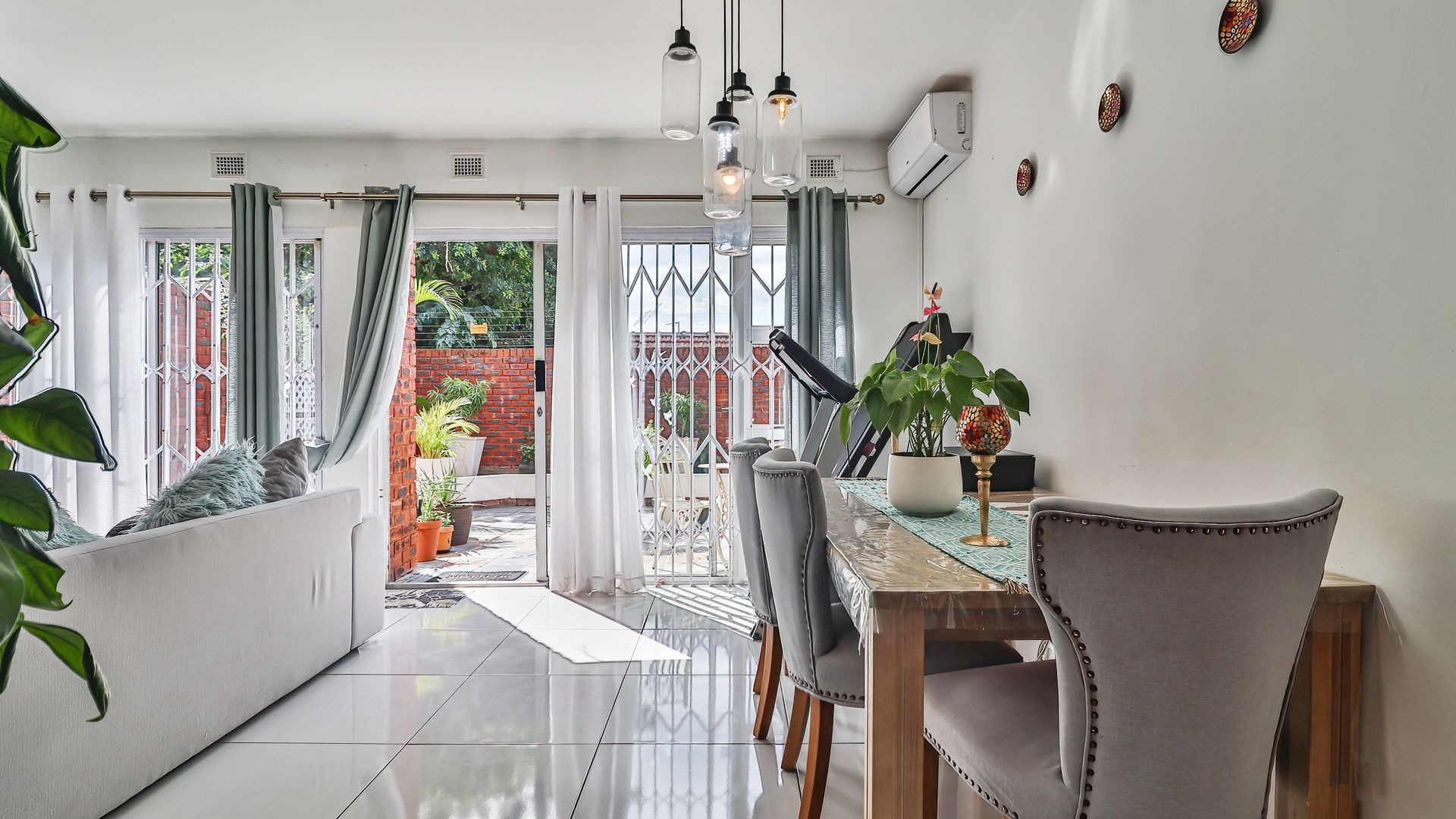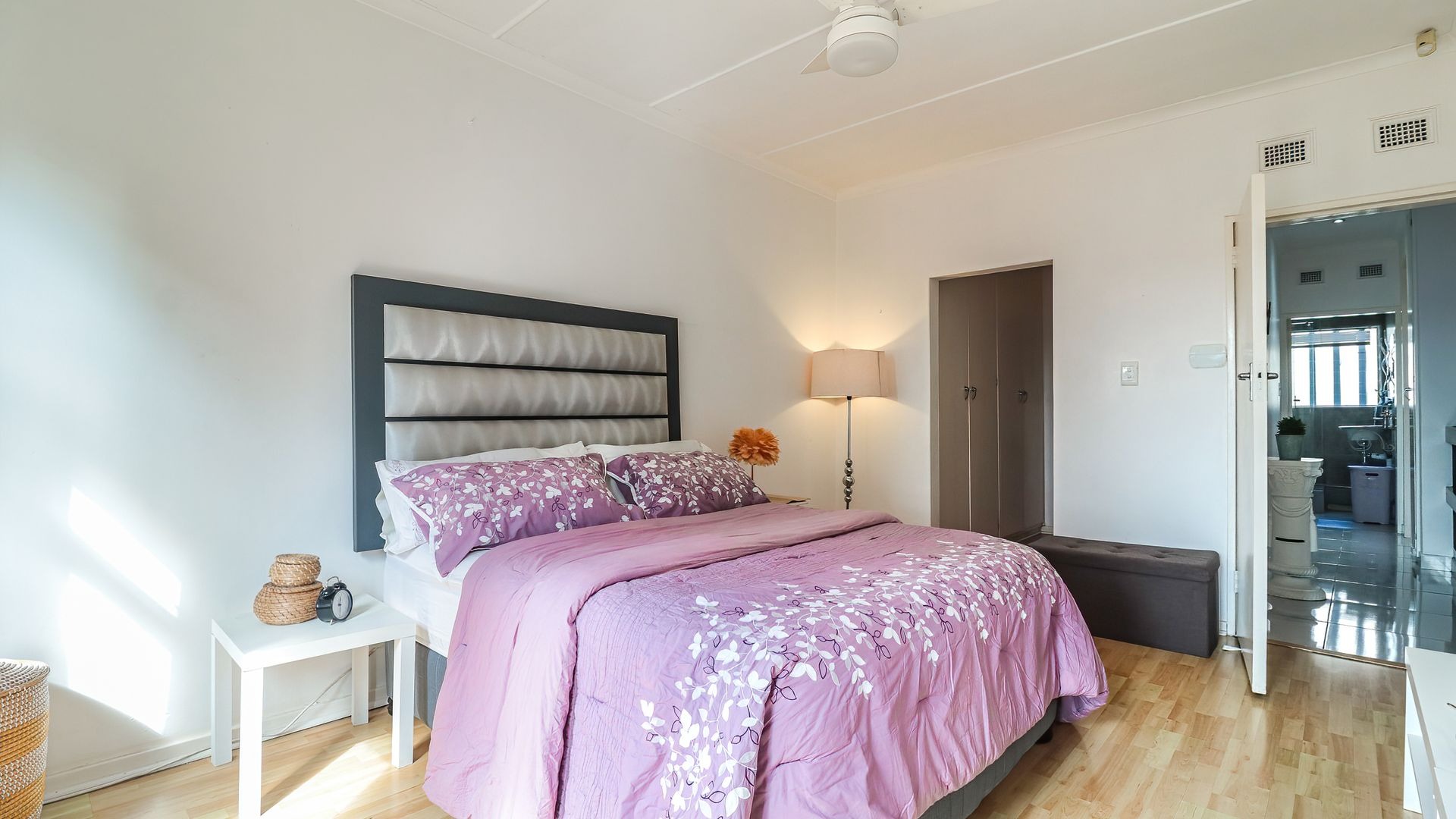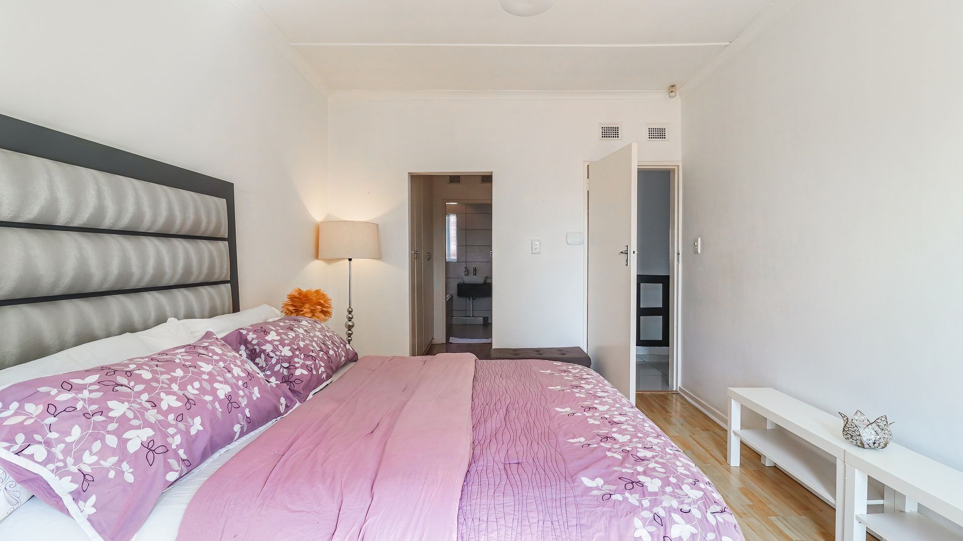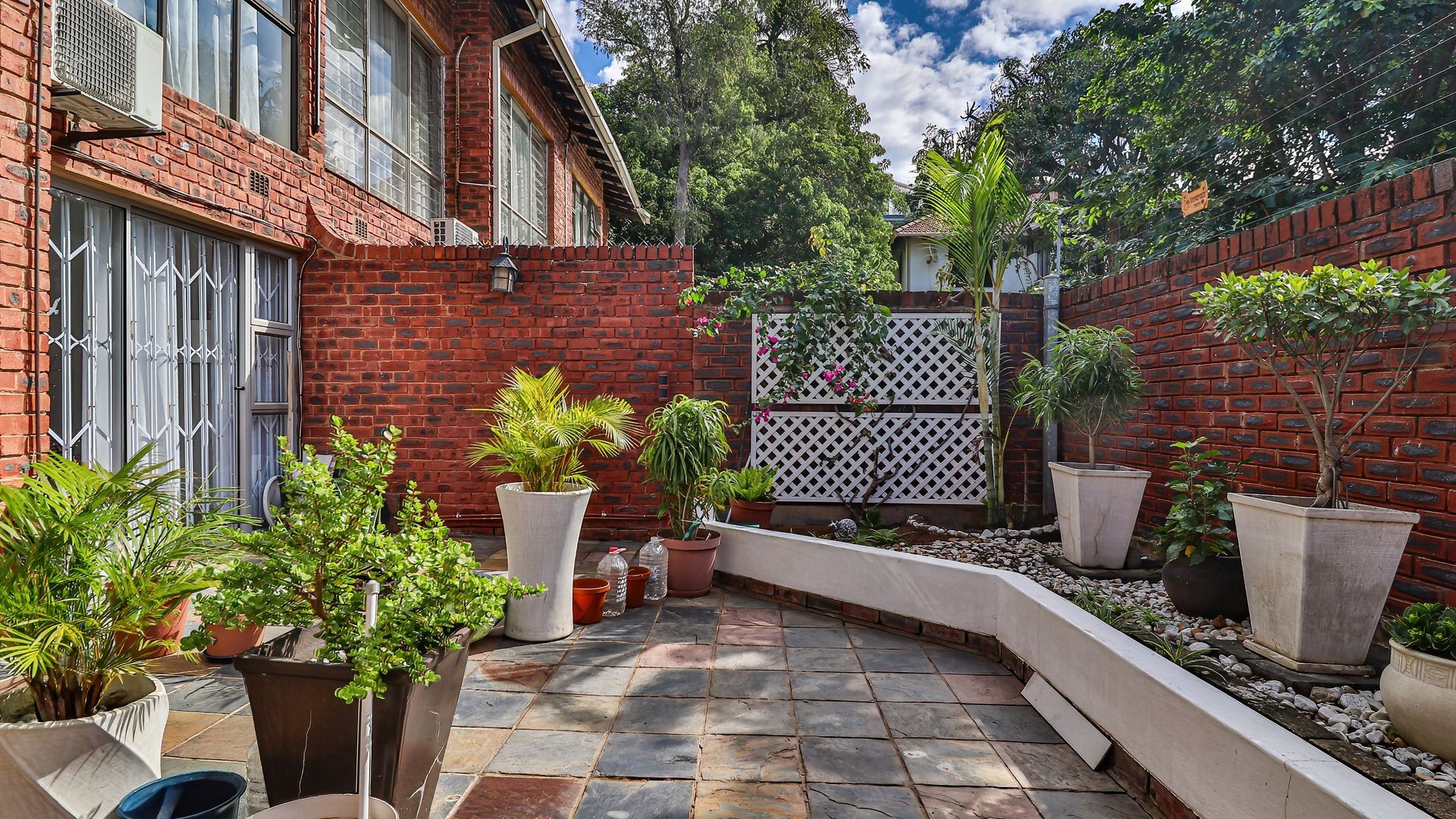 The property features three generously sized bedrooms, all fitted with built-in cupboards. The main bedroom includes a private en-suite bathroom, providing added comfort and privacy. Two of the bedrooms are air-conditioned, ensuring year-round comfort.