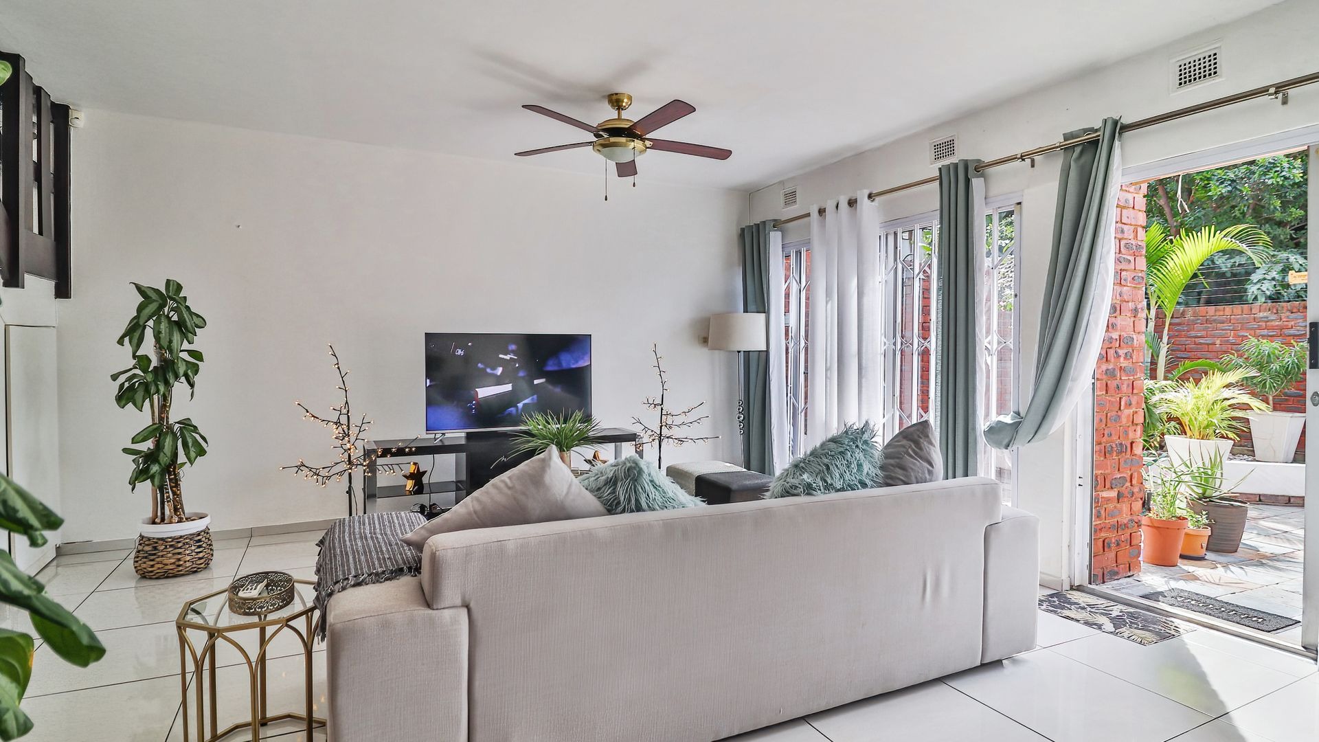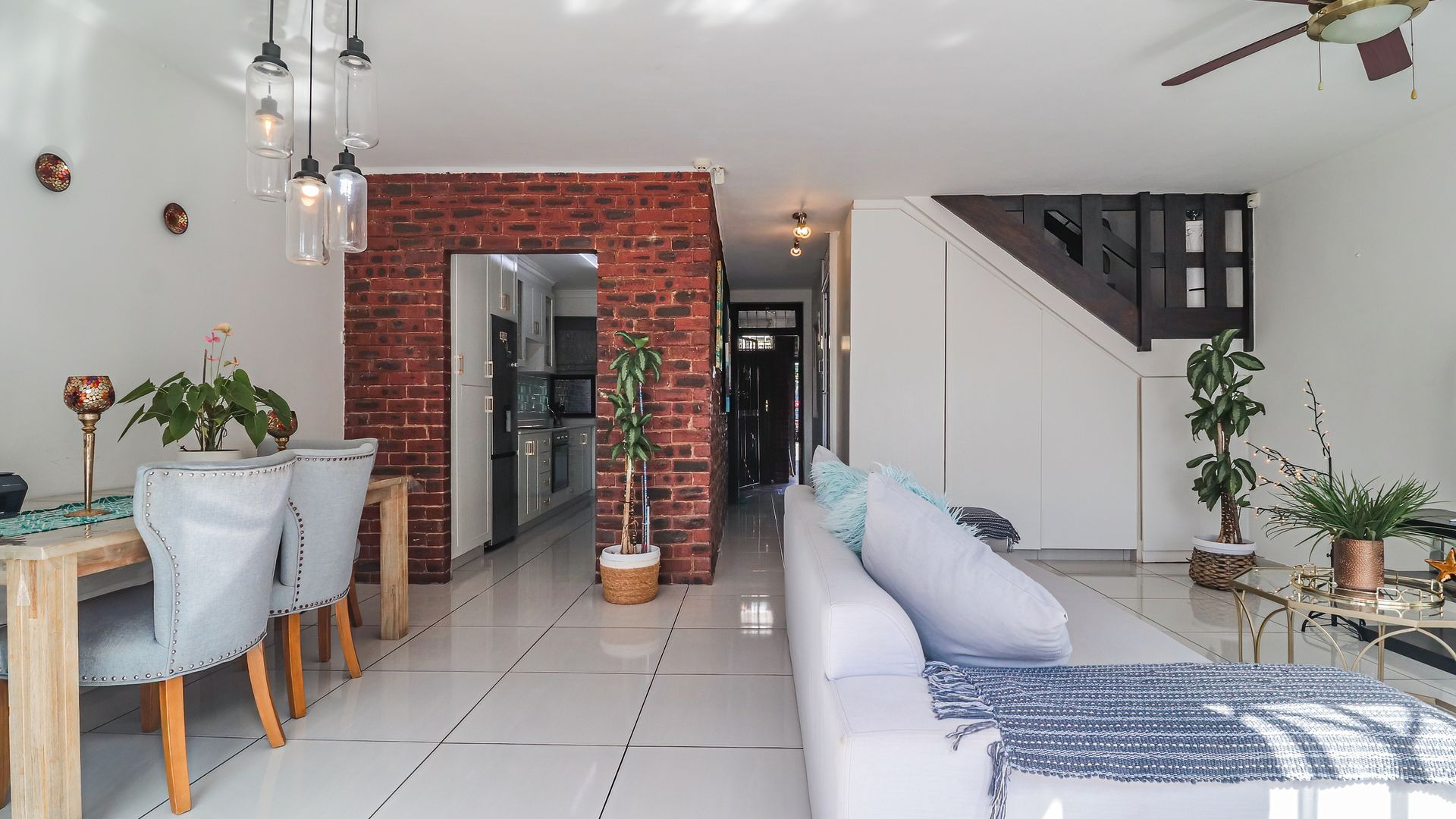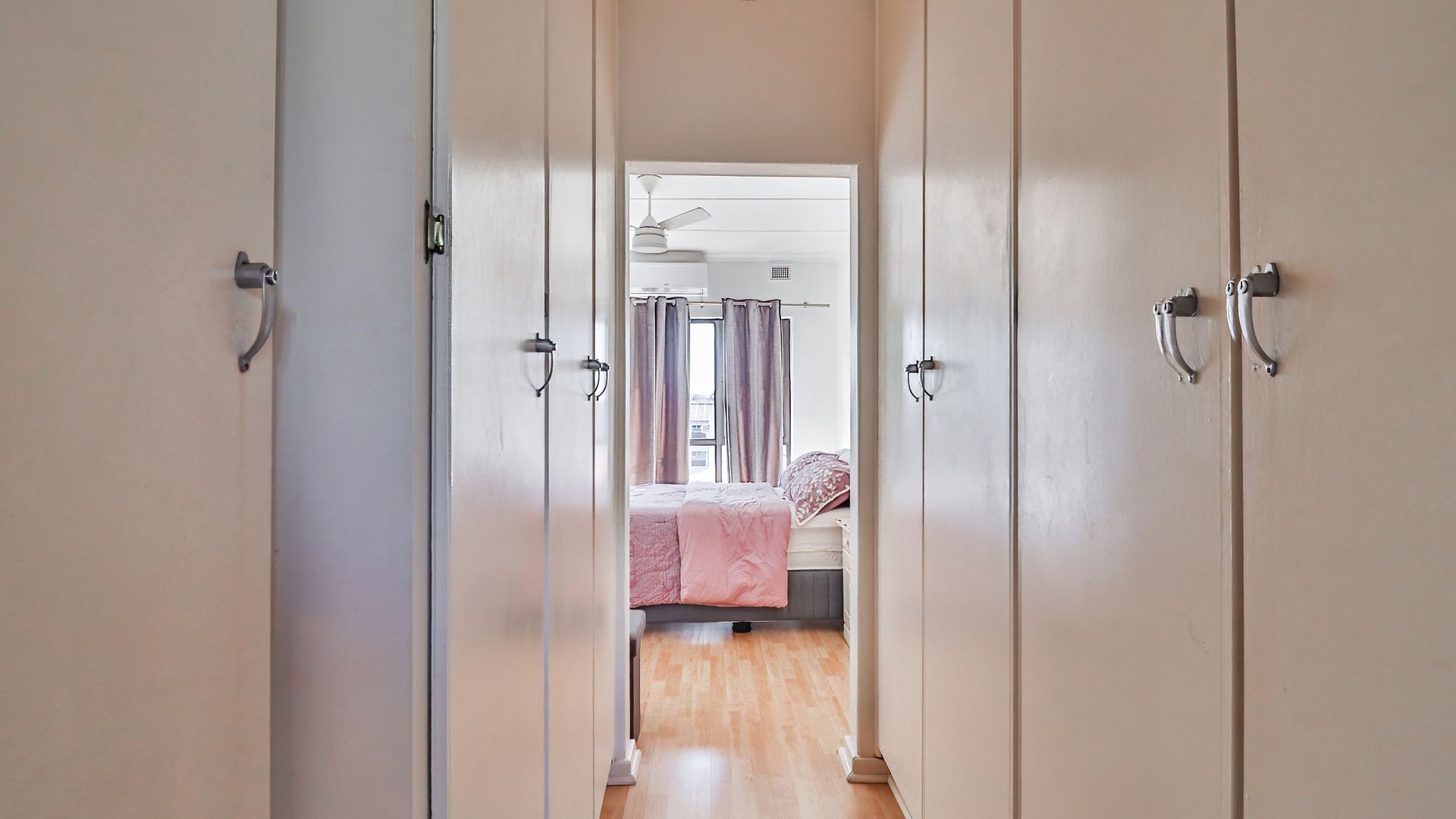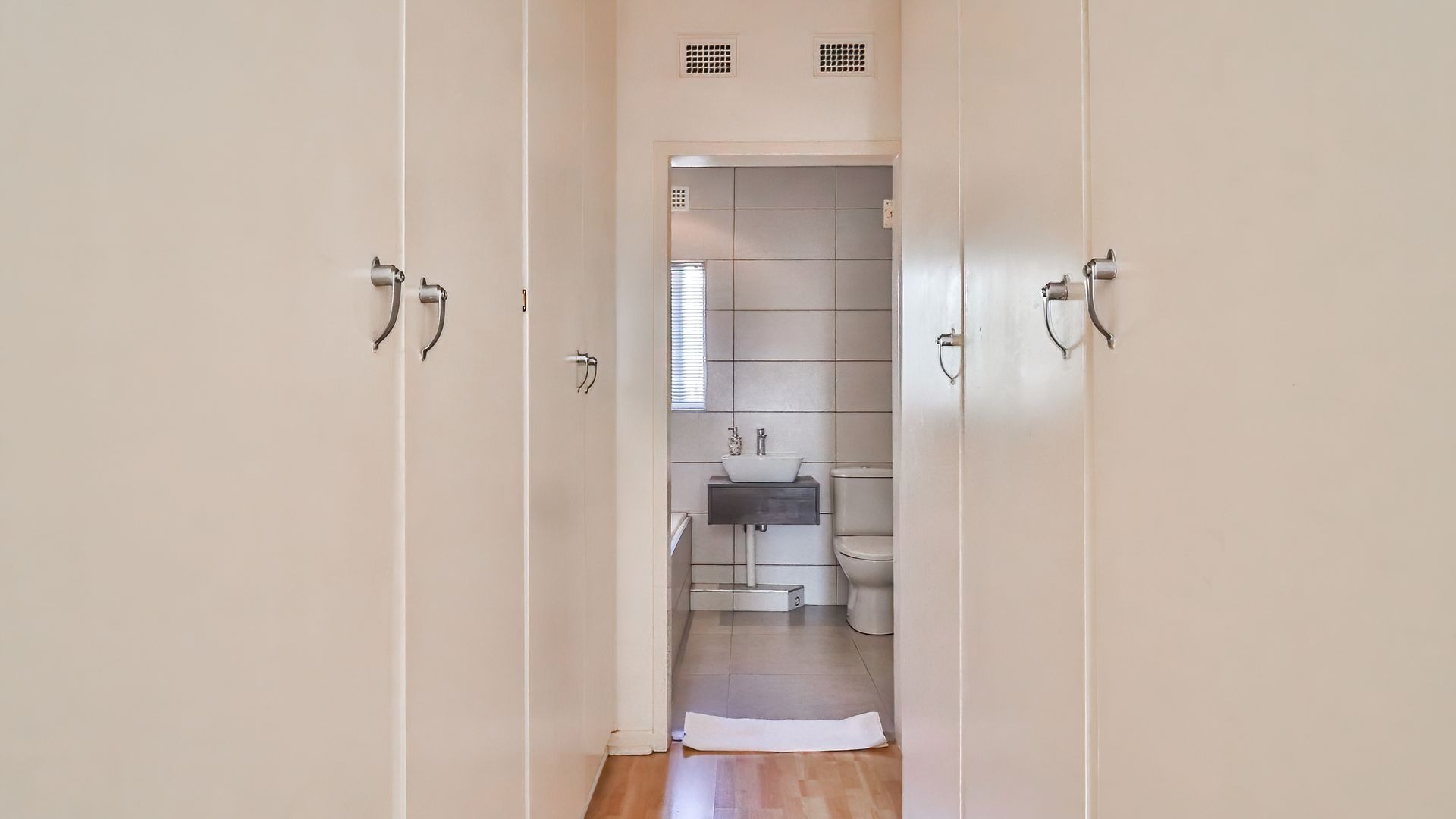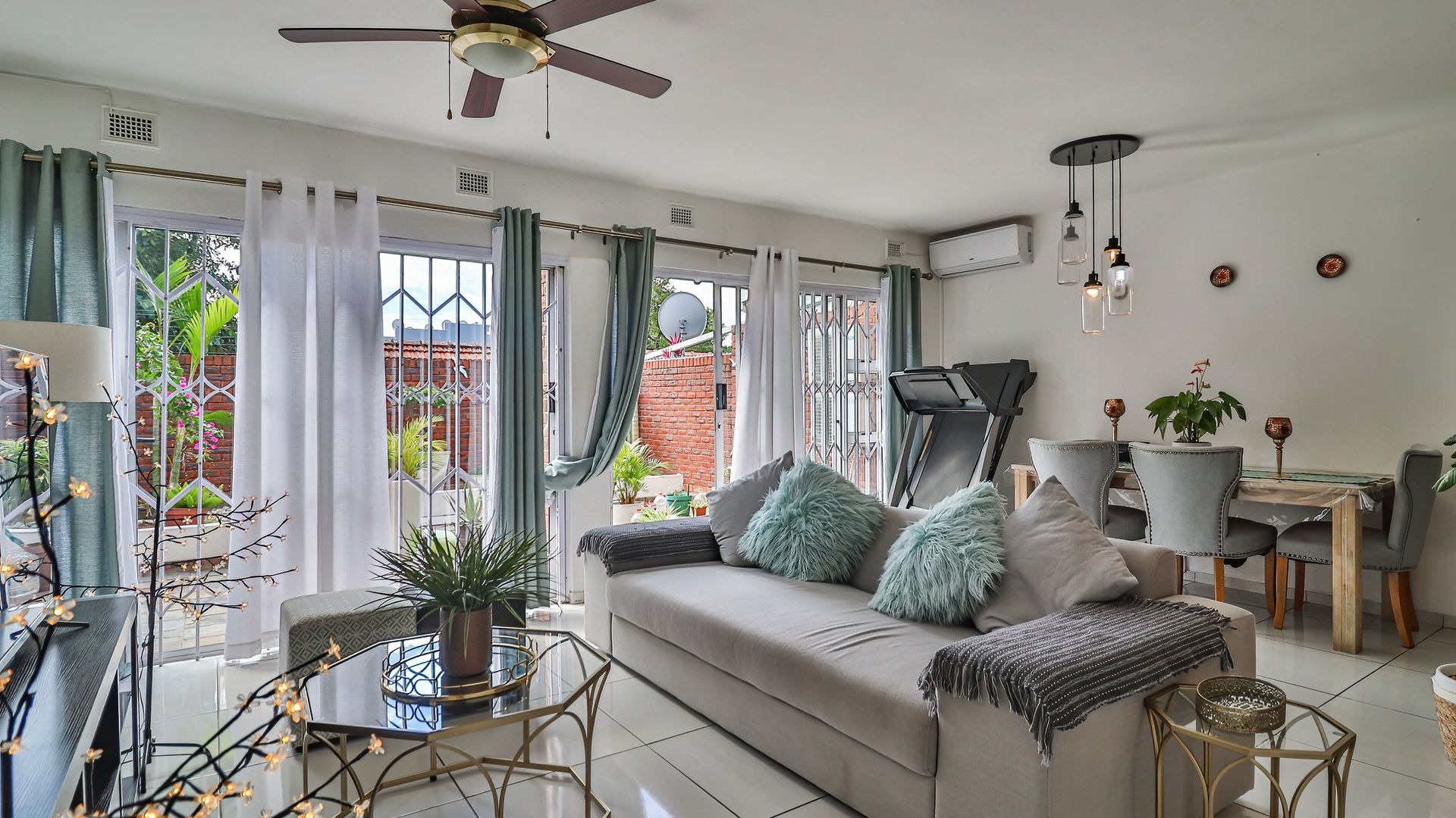 The property features three generously sized bedrooms, all fitted with built-in cupboards. The main bedroom includes a private en-suite bathroom, providing added comfort and privacy. Two of the bedrooms are air-conditioned, ensuring year-round comfort.
