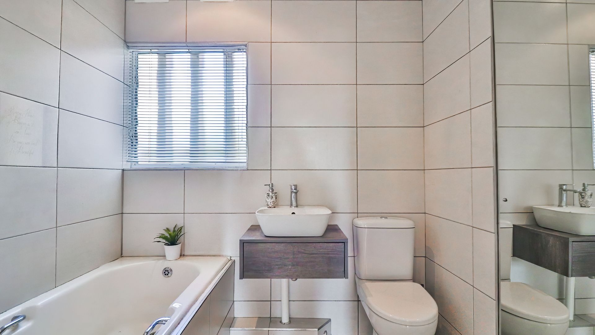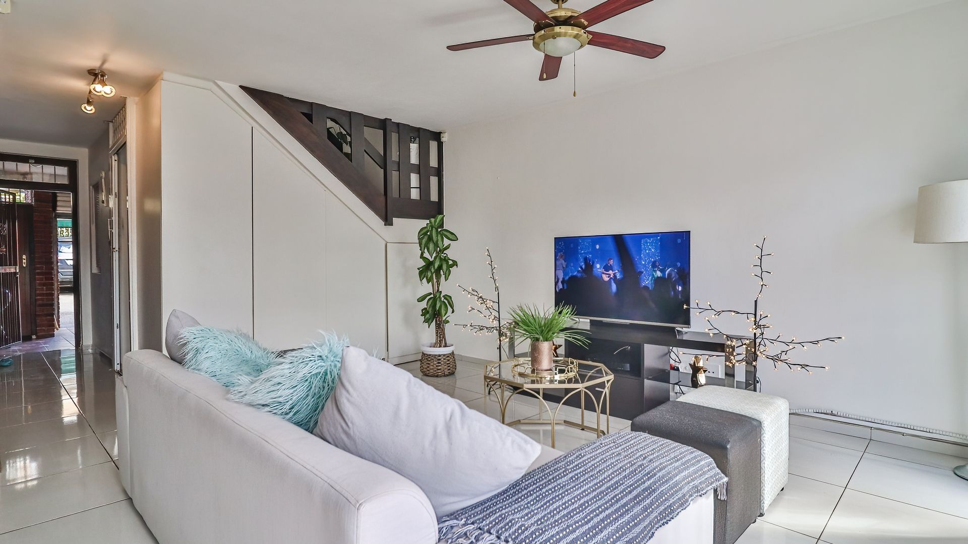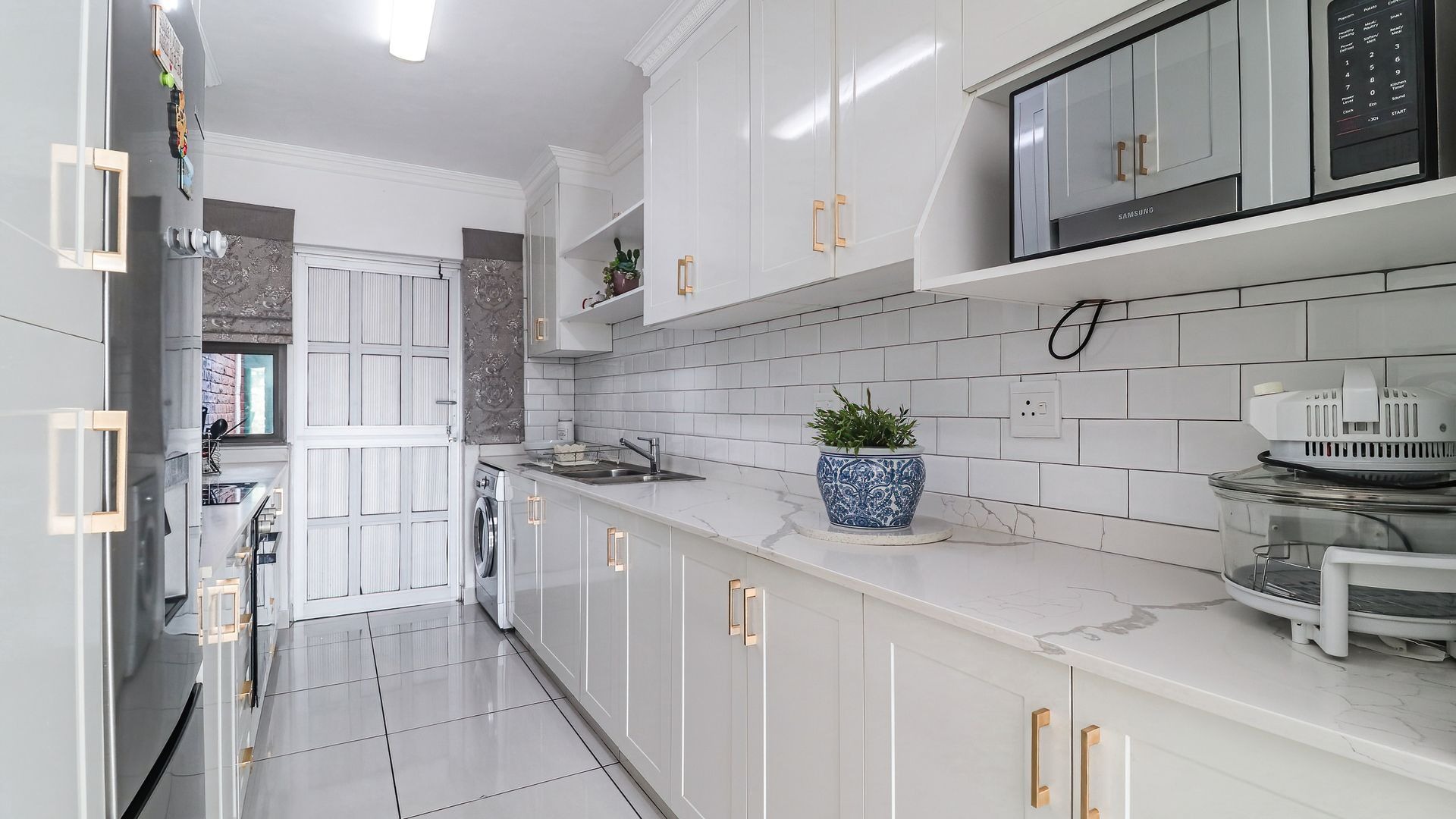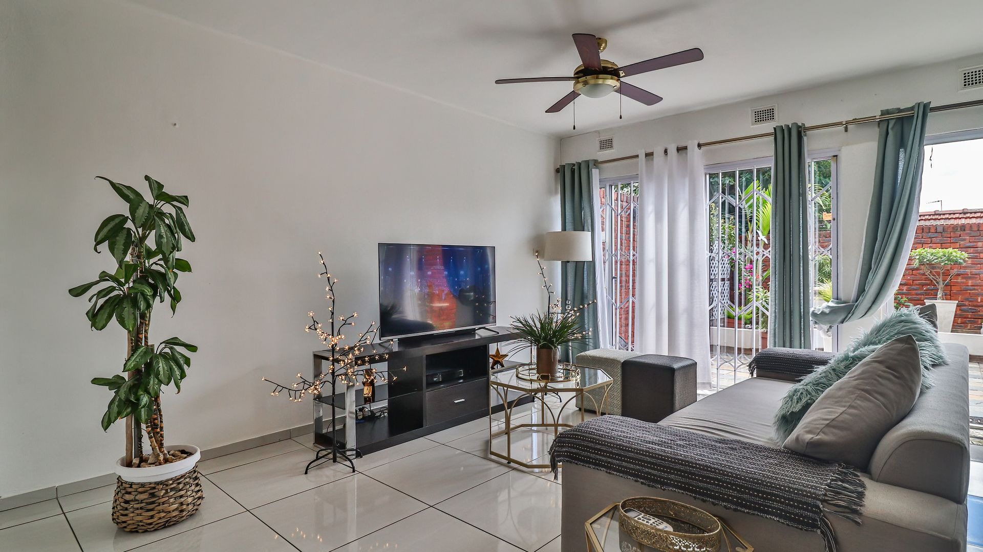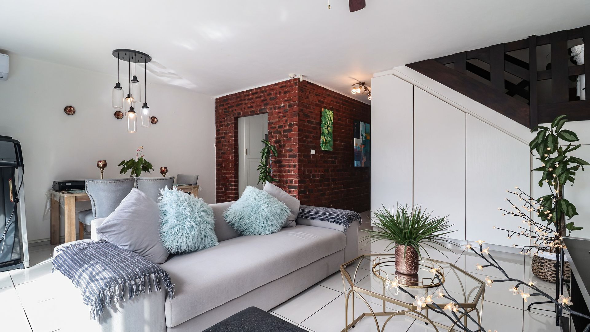 The property features three generously sized bedrooms, all fitted with built-in cupboards. The main bedroom includes a private en-suite bathroom, providing added comfort and privacy. Two of the bedrooms are air-conditioned, ensuring year-round comfort.