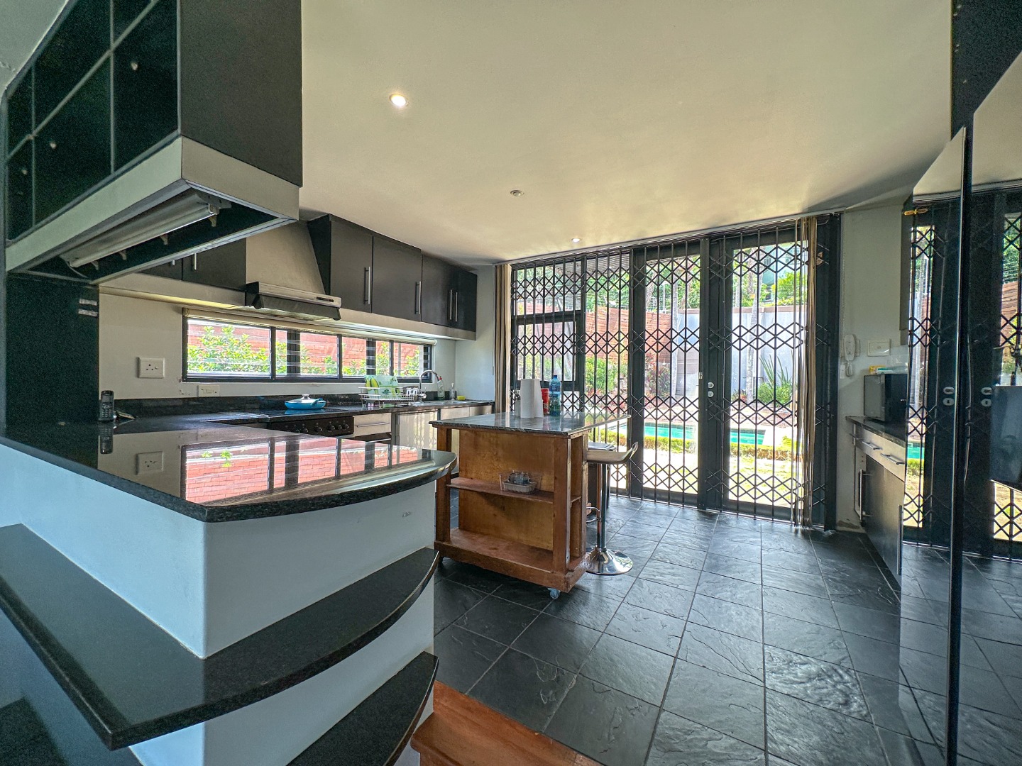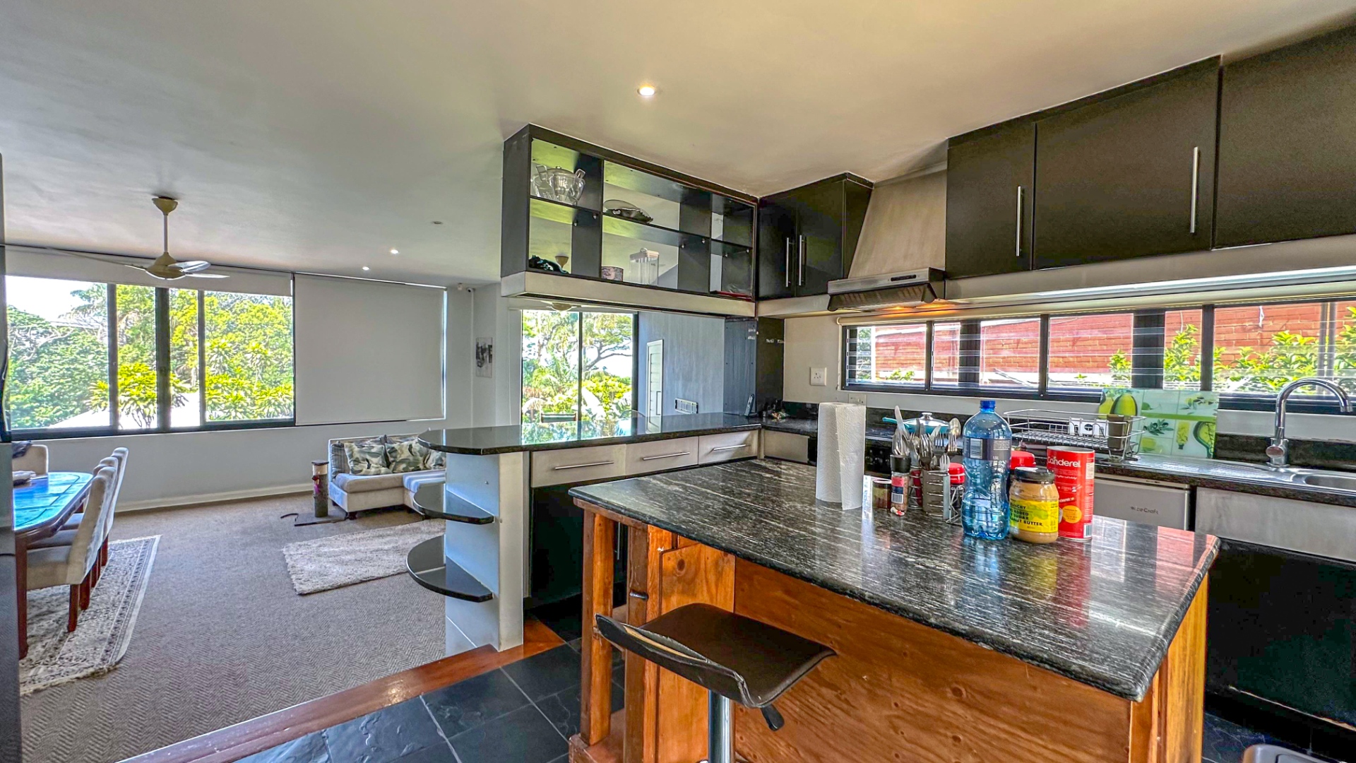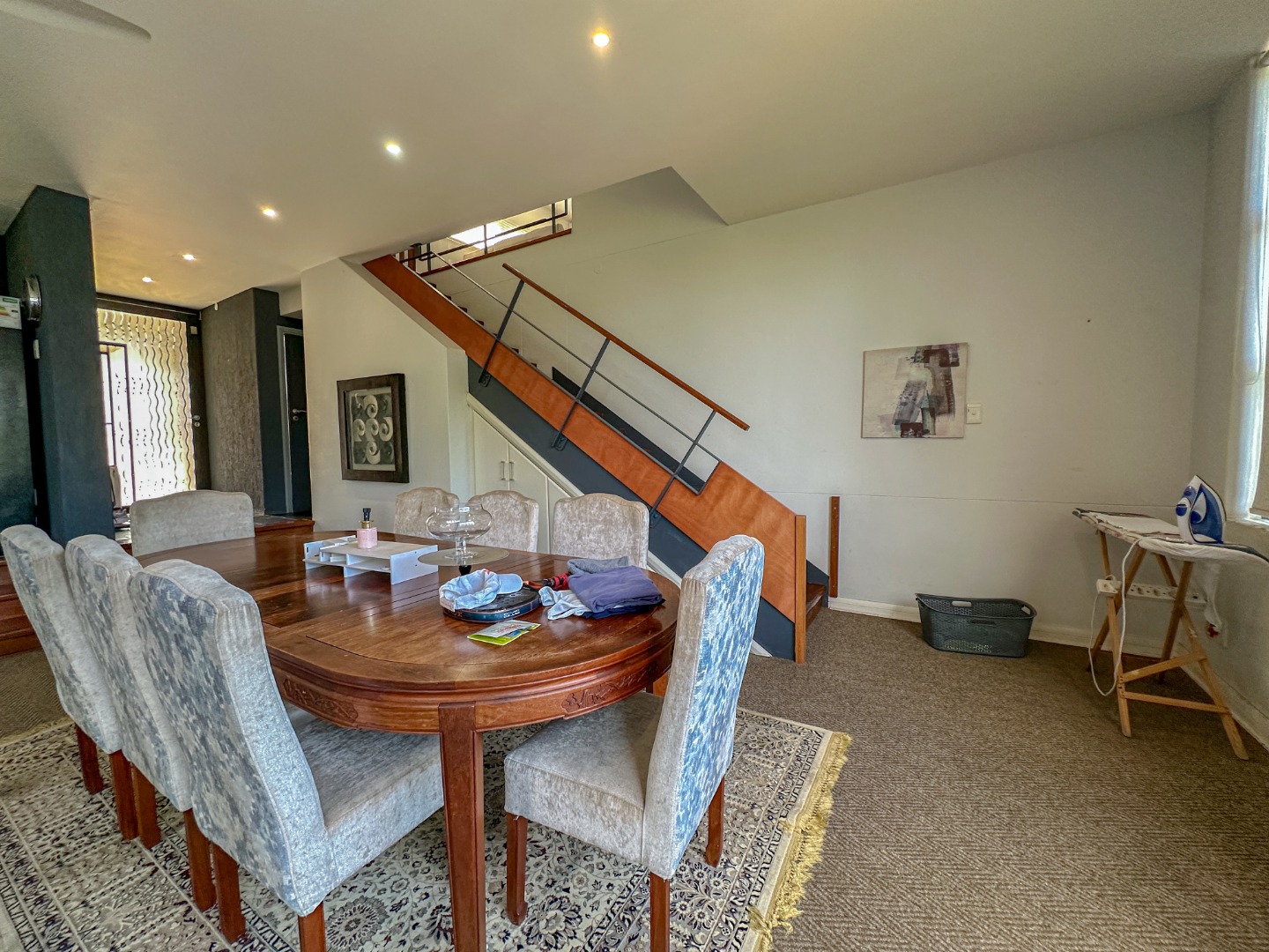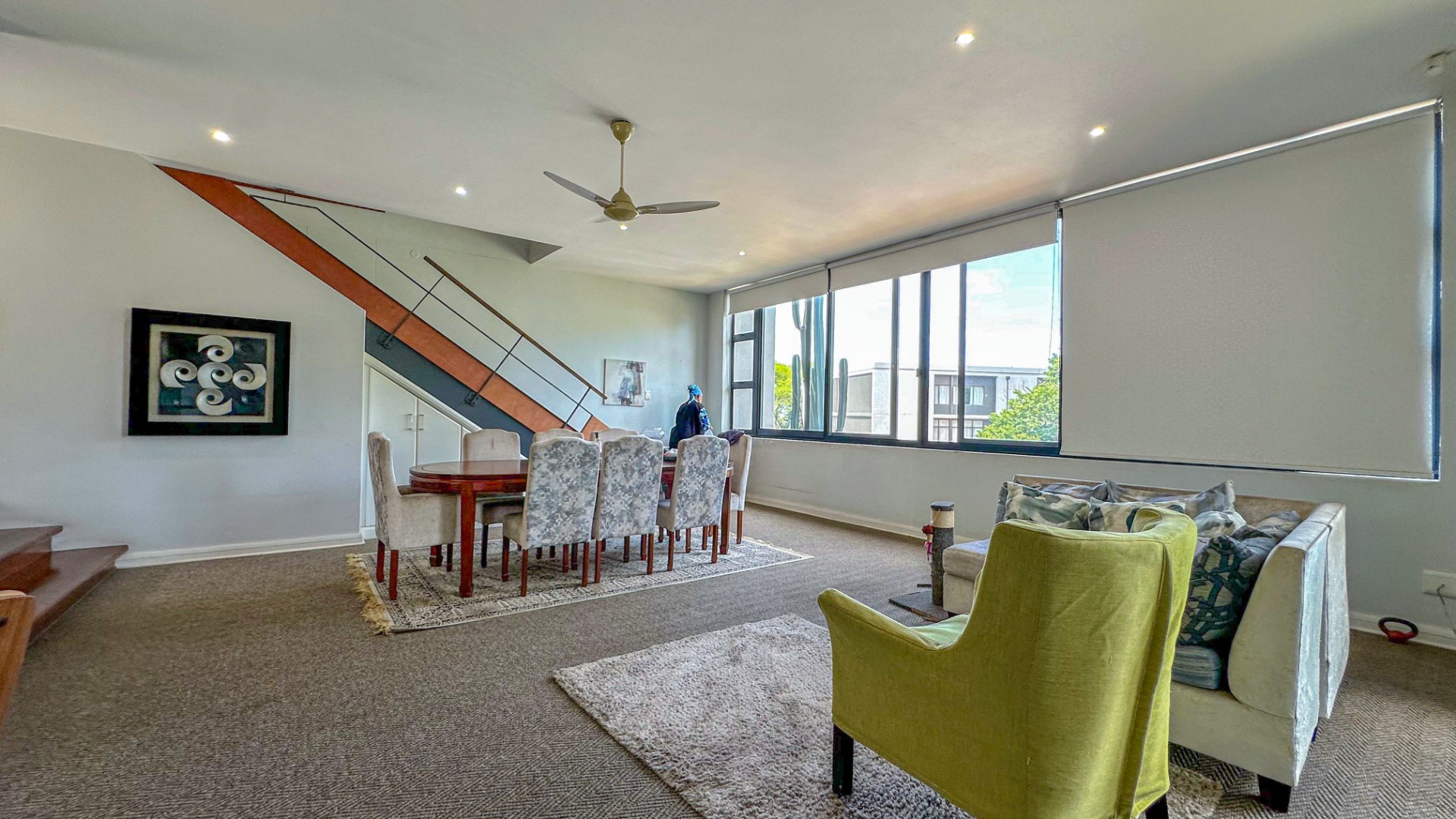This spacious 227 sqm residence in the desirable suburban area of Glenwood, Durban, offers comfortable family living. The open-plan design seamlessly integrates two generous lounges and a dedicated dining room, all bathed in abundant natural light from large windows that frame scenic green views. The modern kitchen is a highlight, featuring sleek dark cabinetry, granite countertops, and a built-in oven and hob, perfect for culinary enthusiasts. An architecturally interesting angular staircase adds a unique touch to the interior flow, complemented by air conditioning, ceiling fans, and recessed lighting for year-round comfort.