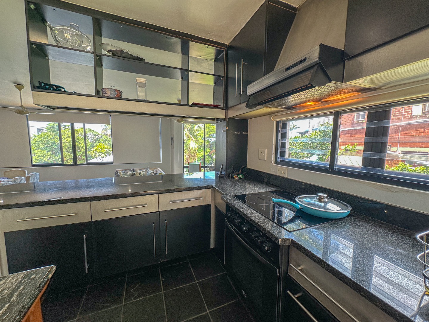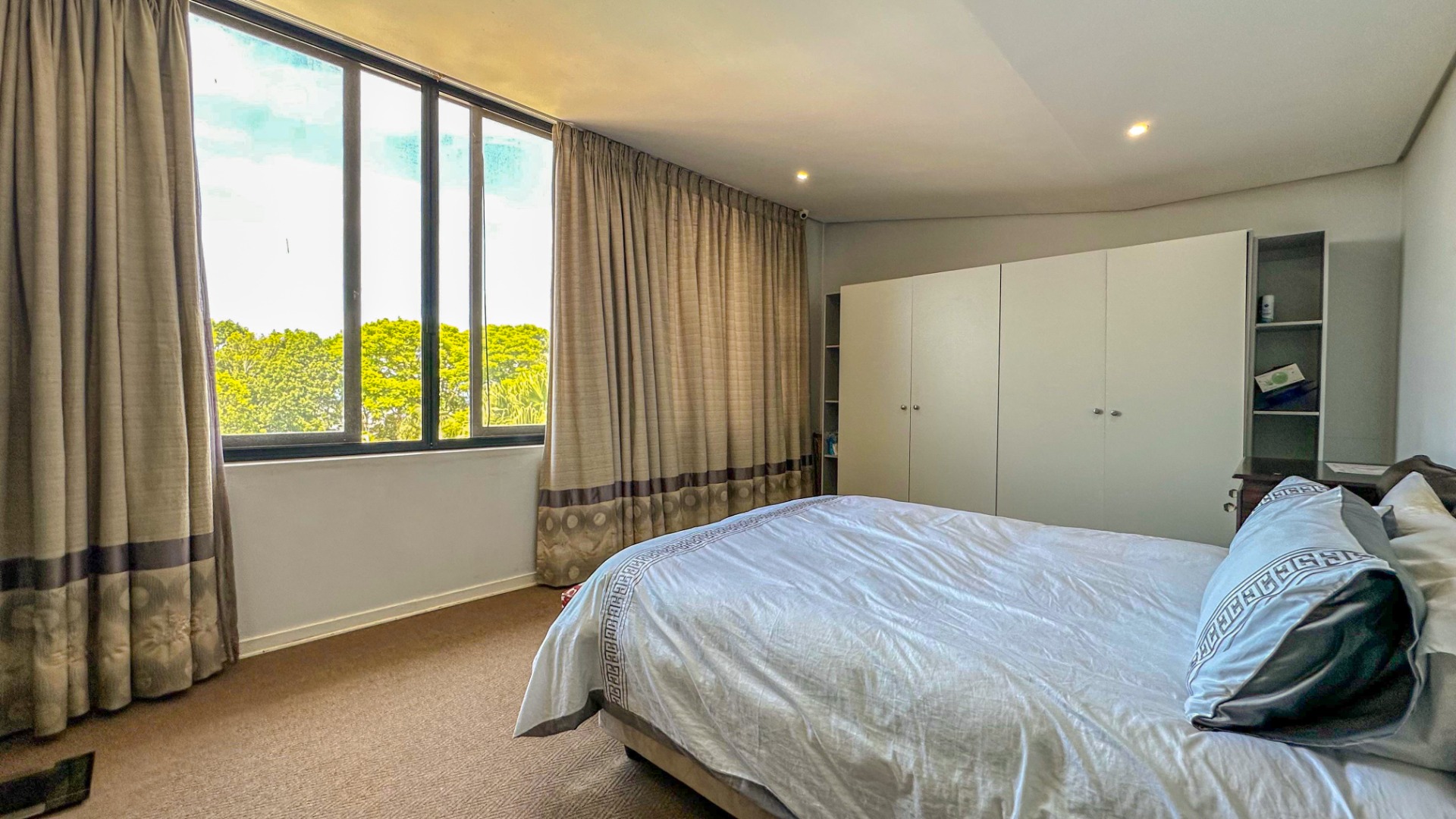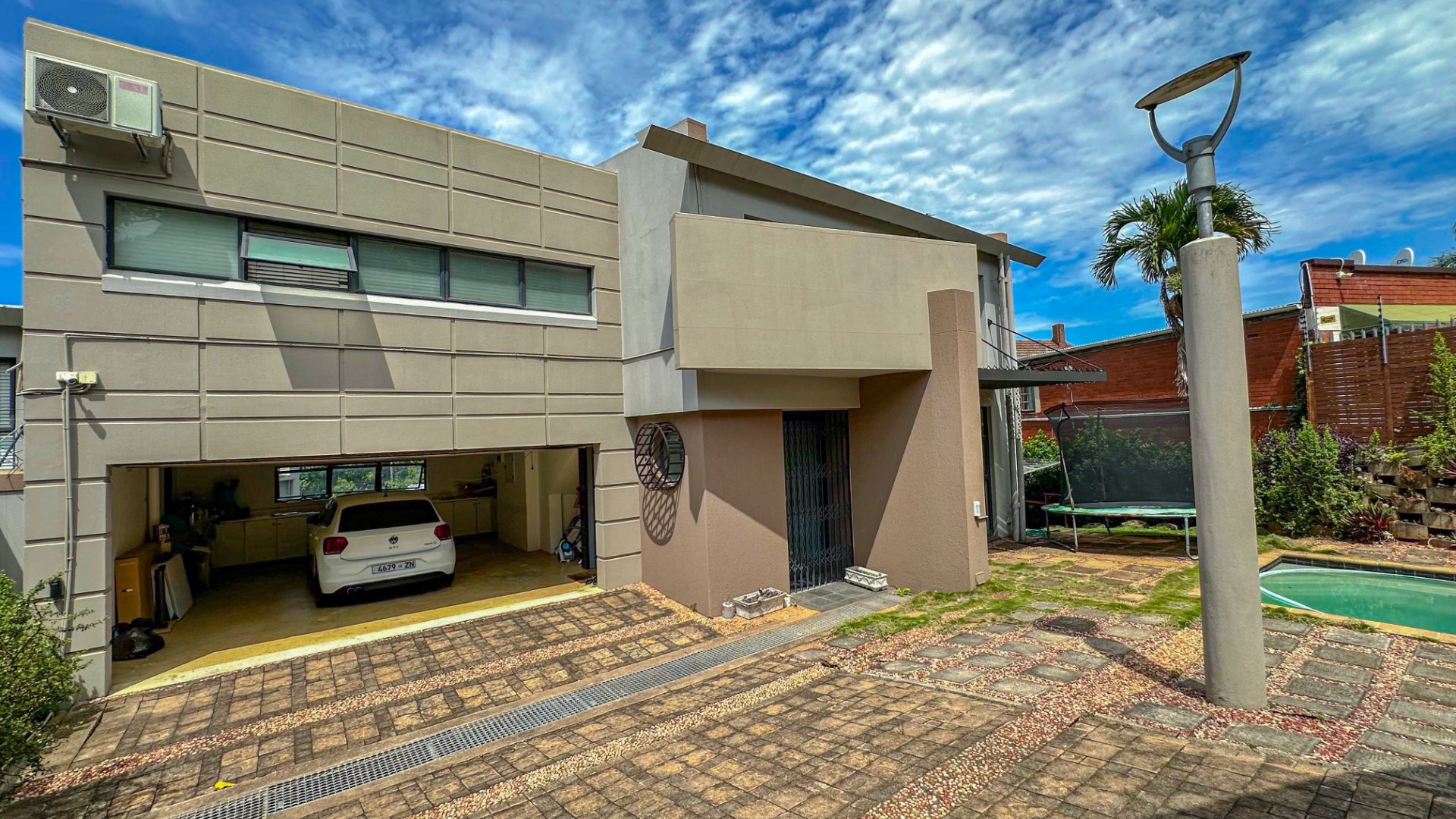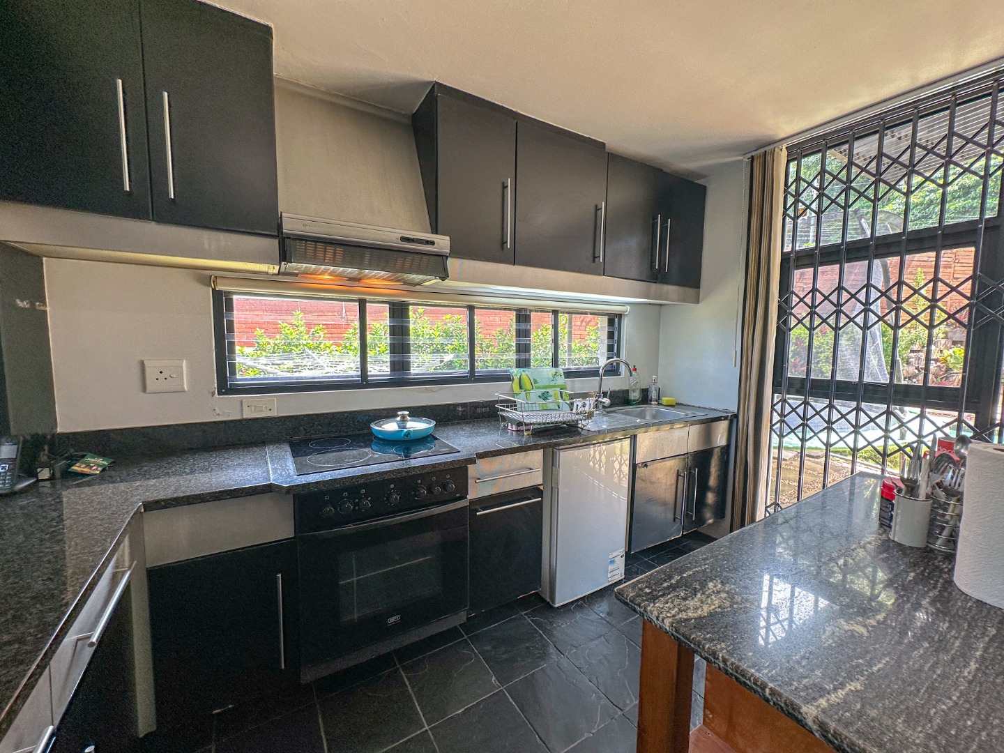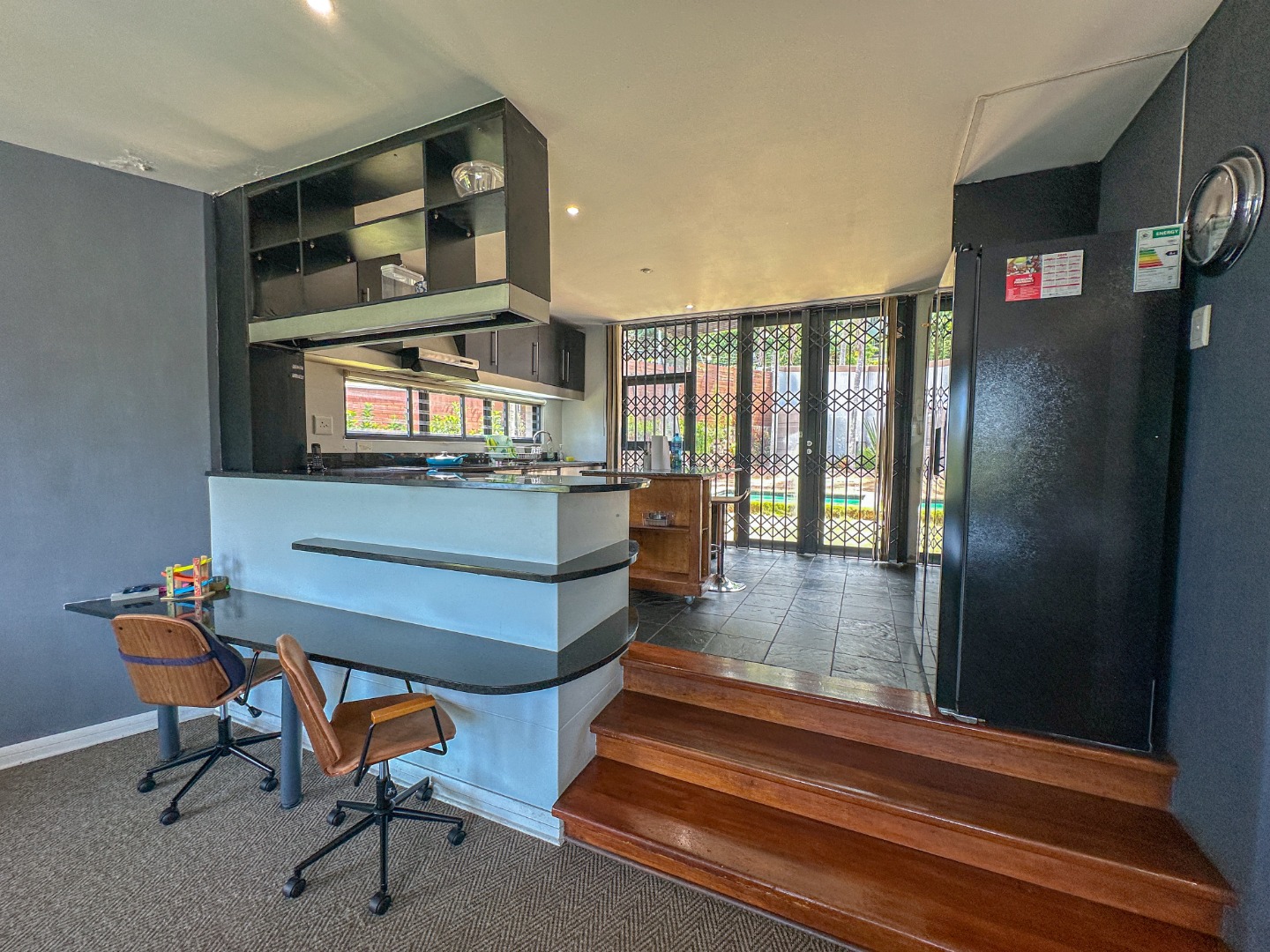 This spacious 227 sqm residence in the desirable suburban area of Glenwood, Durban, offers comfortable family living. The open-plan design seamlessly integrates two generous lounges and a dedicated dining room, all bathed in abundant natural light from large windows that frame scenic green views. The modern kitchen is a highlight, featuring sleek dark cabinetry, granite countertops, and a built-in oven and hob, perfect for culinary enthusiasts. An architecturally interesting angular staircase adds a unique touch to the interior flow, complemented by air conditioning, ceiling fans, and recessed lighting for year-round comfort.