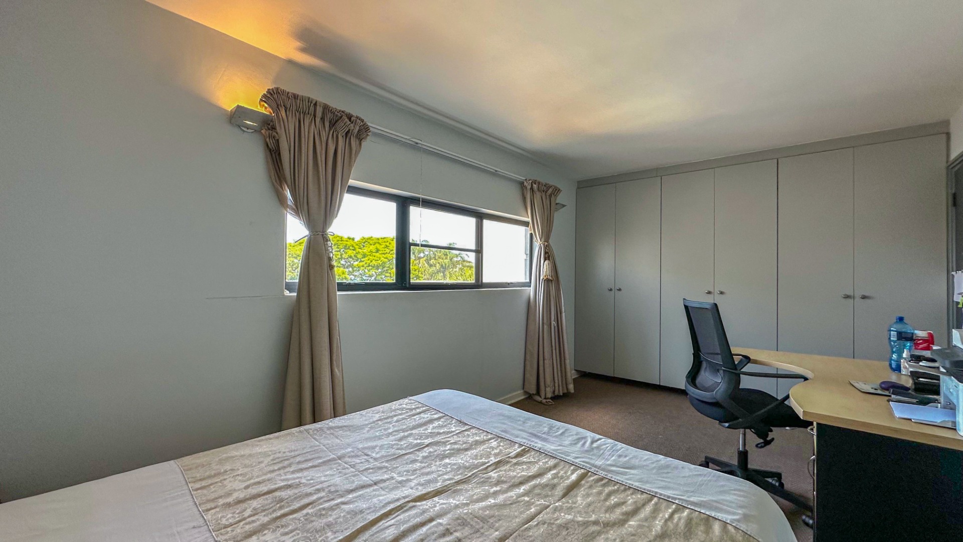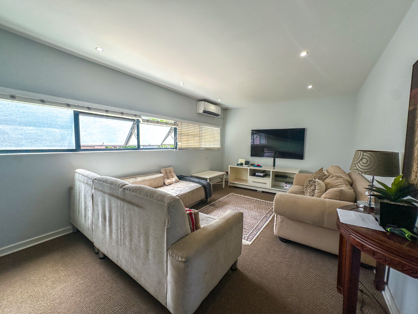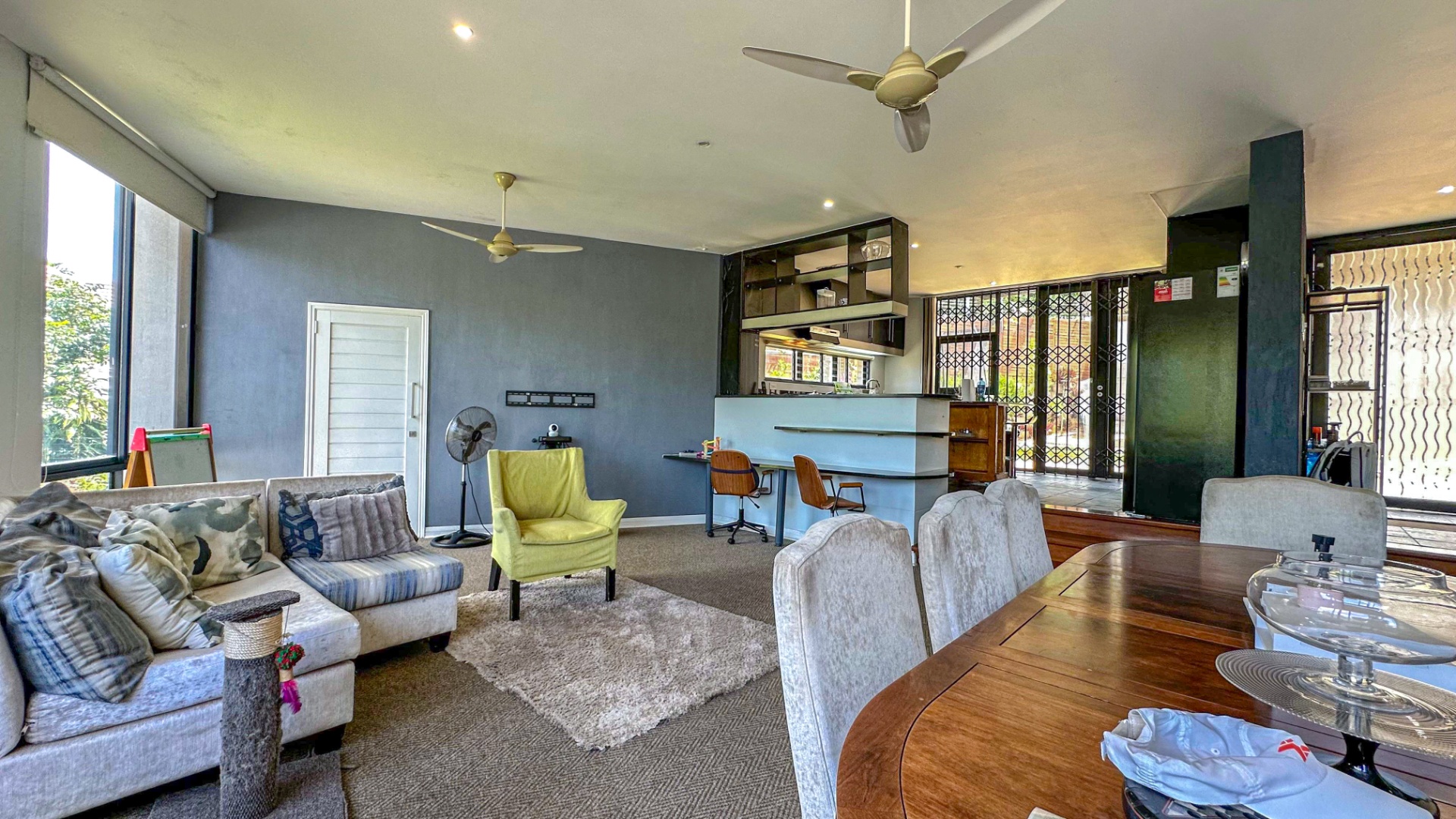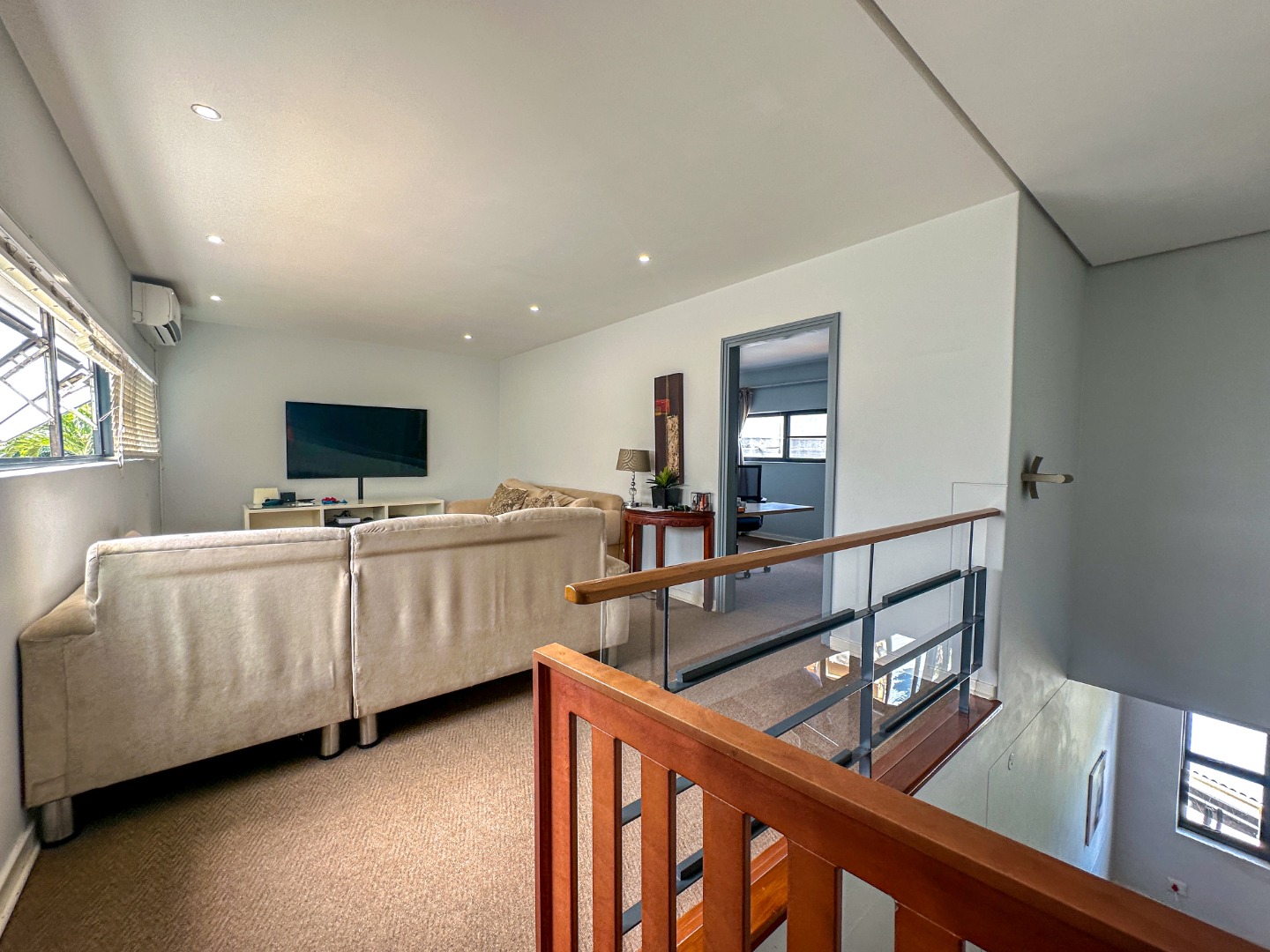 This spacious 227 sqm residence in the desirable suburban area of Glenwood, Durban, offers comfortable family living. The open-plan design seamlessly integrates two generous lounges and a dedicated dining room, all bathed in abundant natural light from large windows that frame scenic green views. The modern kitchen is a highlight, featuring sleek dark cabinetry, granite countertops, and a built-in oven and hob, perfect for culinary enthusiasts. An architecturally interesting angular staircase adds a unique touch to the interior flow, complemented by air conditioning, ceiling fans, and recessed lighting for year-round comfort.