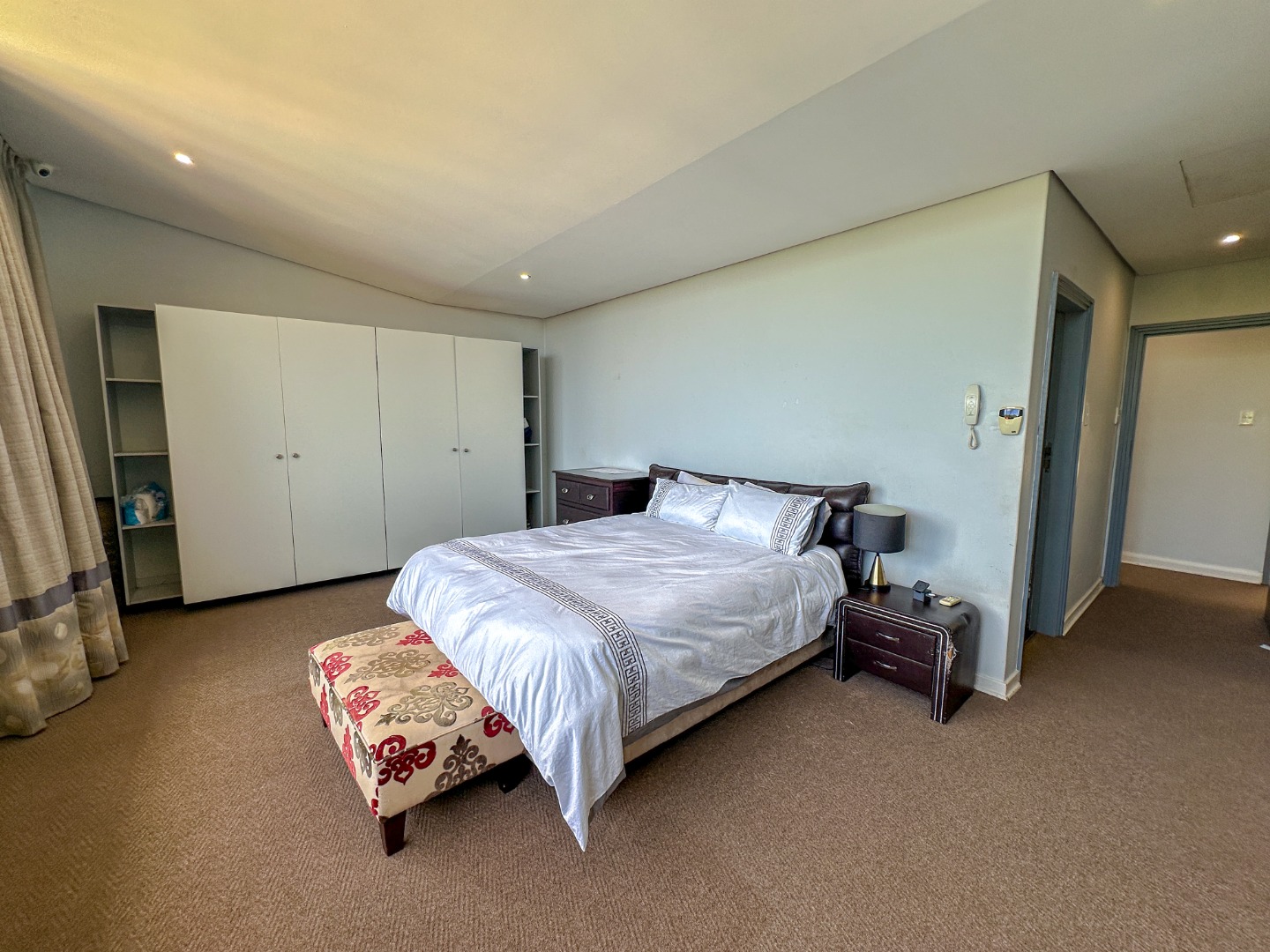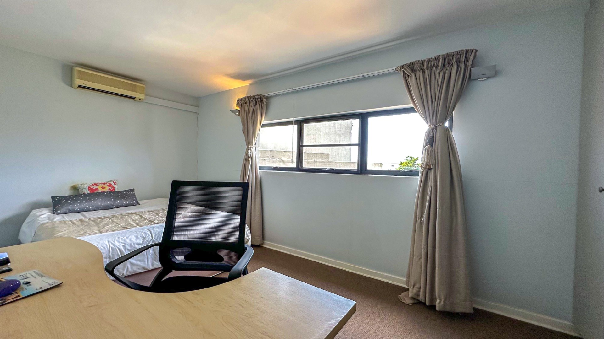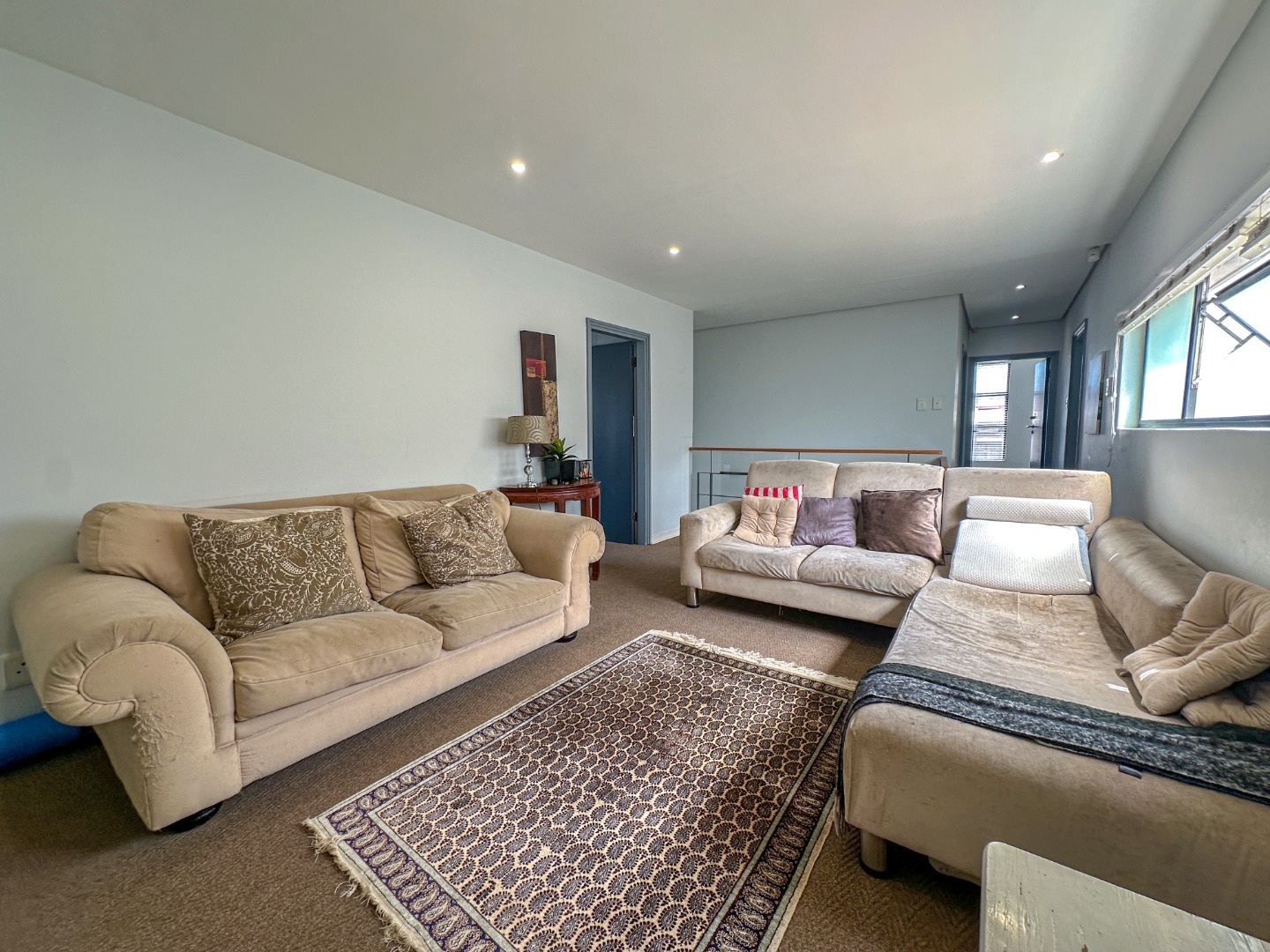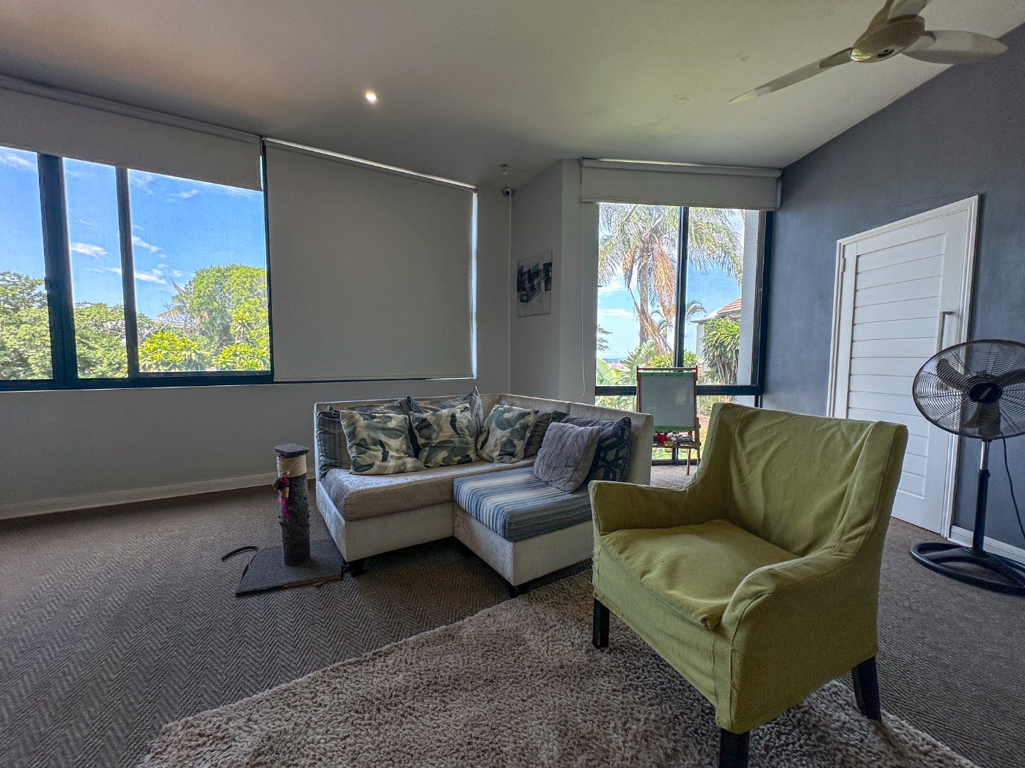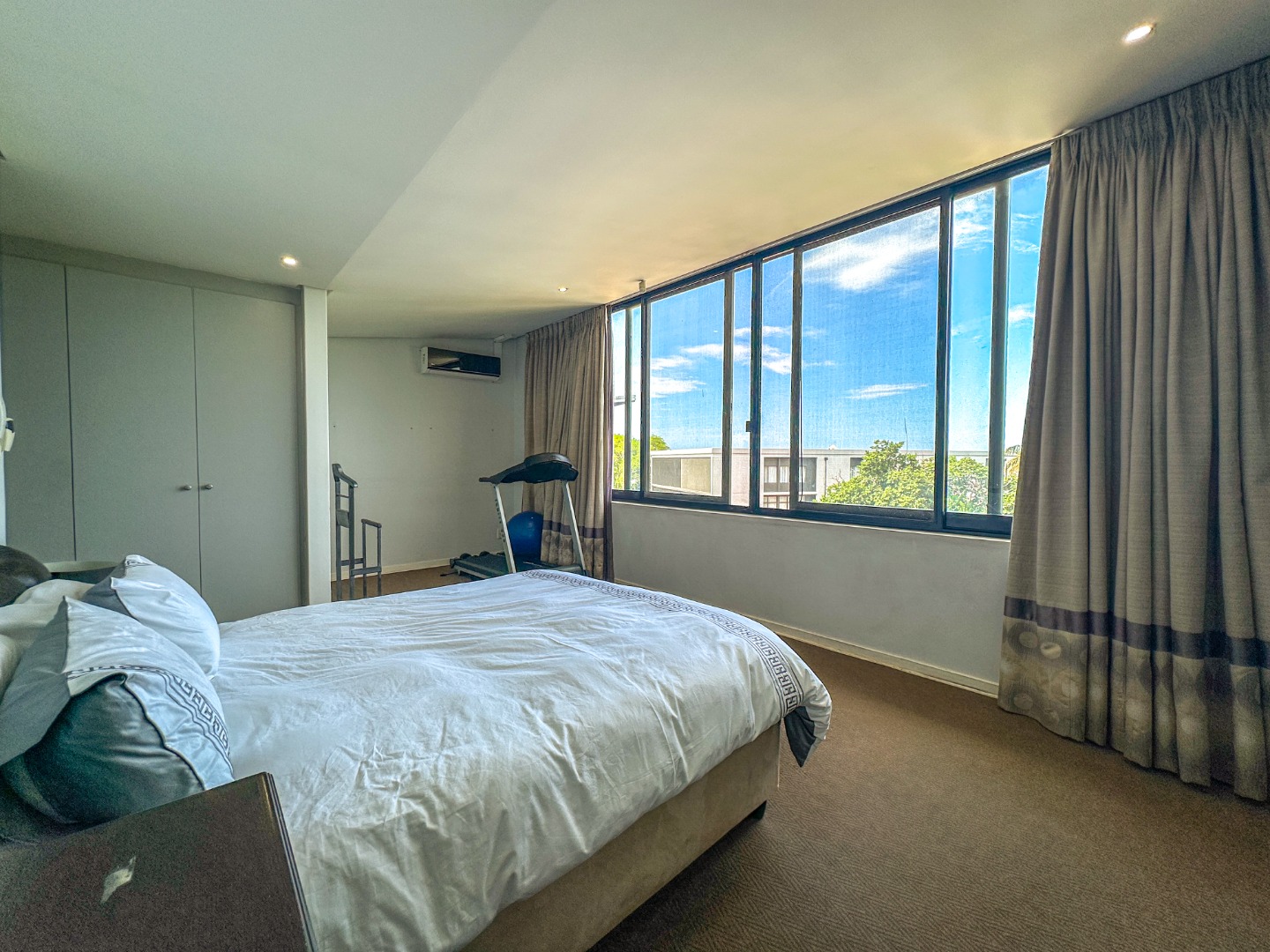 This spacious 227 sqm residence in the desirable suburban area of Glenwood, Durban, offers comfortable family living. The open-plan design seamlessly integrates two generous lounges and a dedicated dining room, all bathed in abundant natural light from large windows that frame scenic green views. The modern kitchen is a highlight, featuring sleek dark cabinetry, granite countertops, and a built-in oven and hob, perfect for culinary enthusiasts. An architecturally interesting angular staircase adds a unique touch to the interior flow, complemented by air conditioning, ceiling fans, and recessed lighting for year-round comfort.