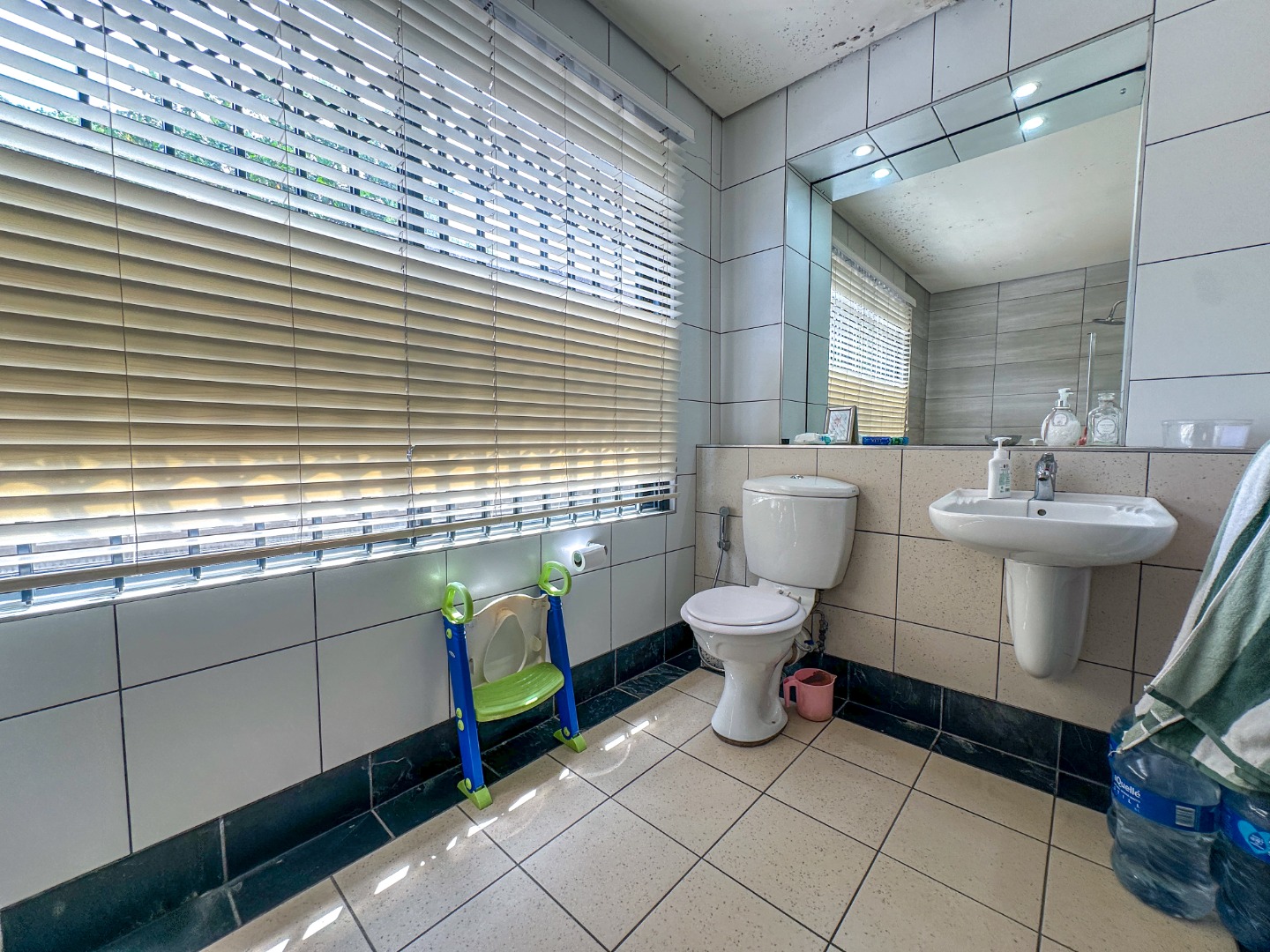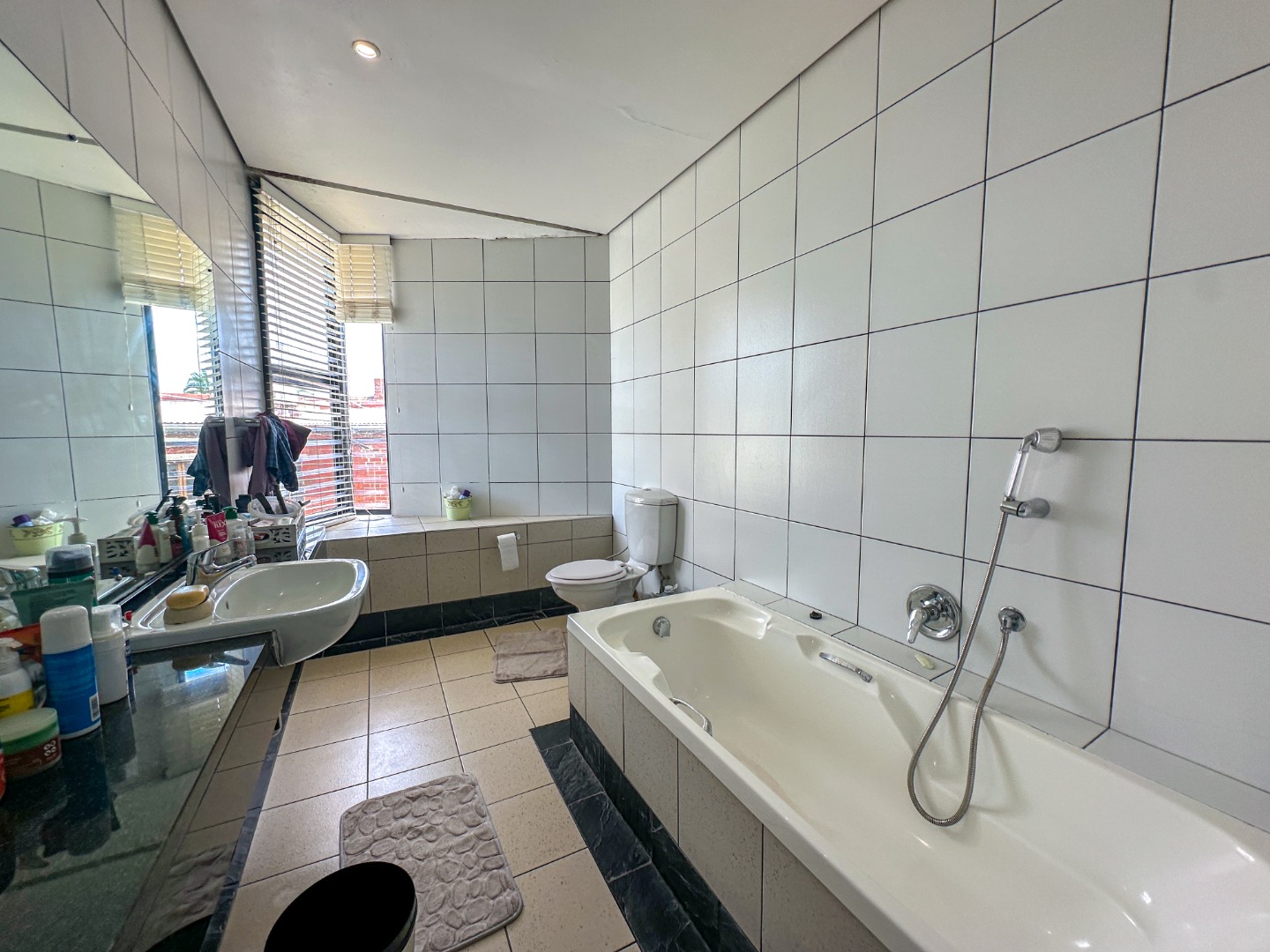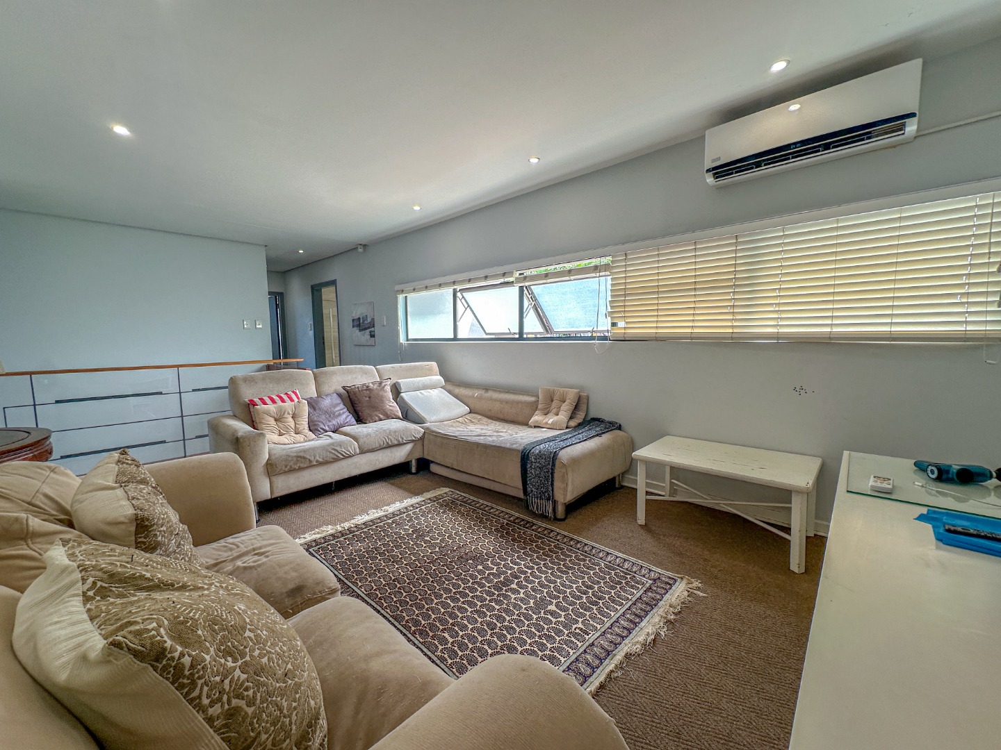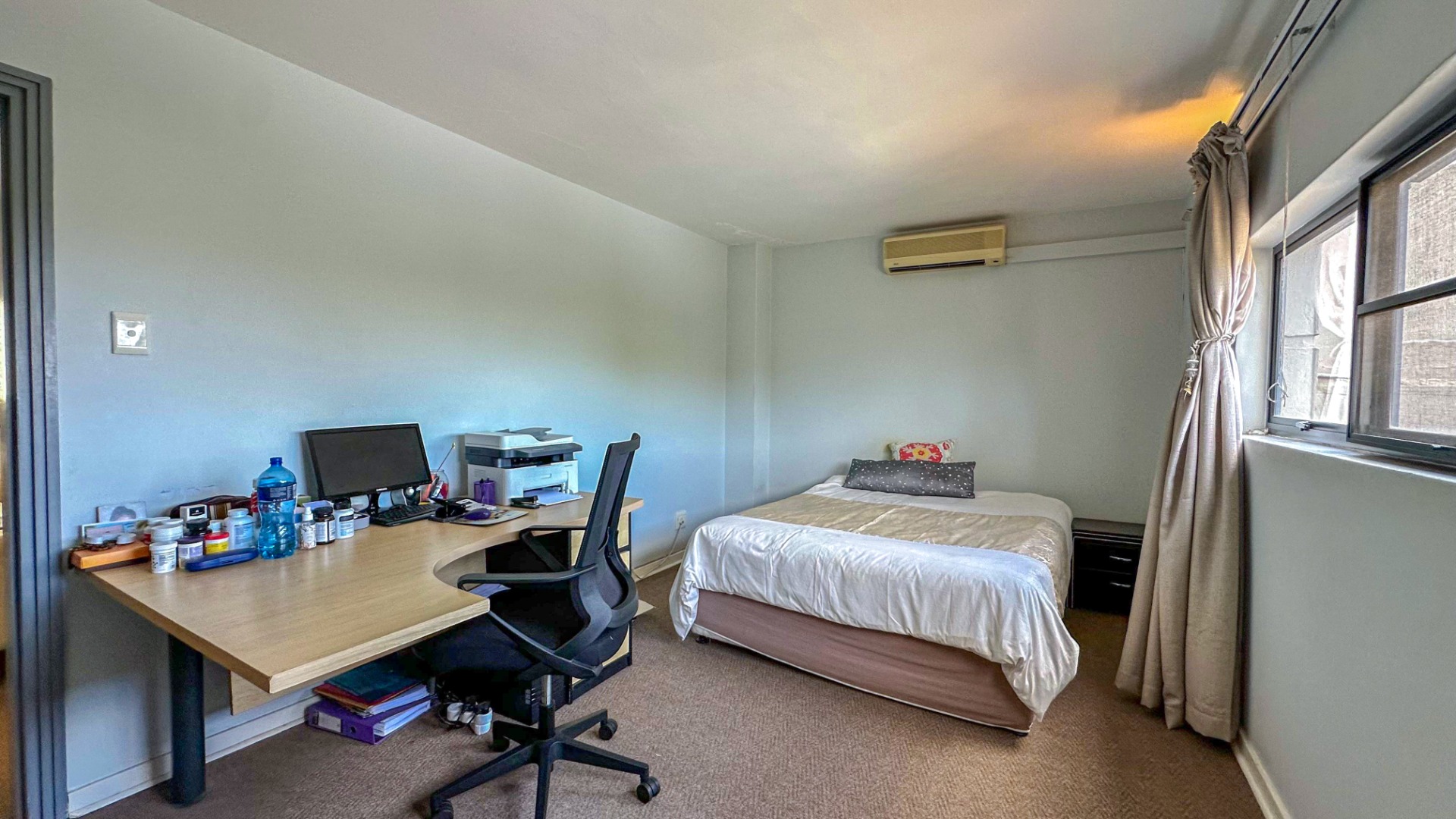This spacious 227 sqm residence in the desirable suburban area of Glenwood, Durban, offers comfortable family living. The open-plan design seamlessly integrates two generous lounges and a dedicated dining room, all bathed in abundant natural light from large windows that frame scenic green views. The modern kitchen is a highlight, featuring sleek dark cabinetry, granite countertops, and a built-in oven and hob, perfect for culinary enthusiasts. An architecturally interesting angular staircase adds a unique touch to the interior flow, complemented by air conditioning, ceiling fans, and recessed lighting for year-round comfort.