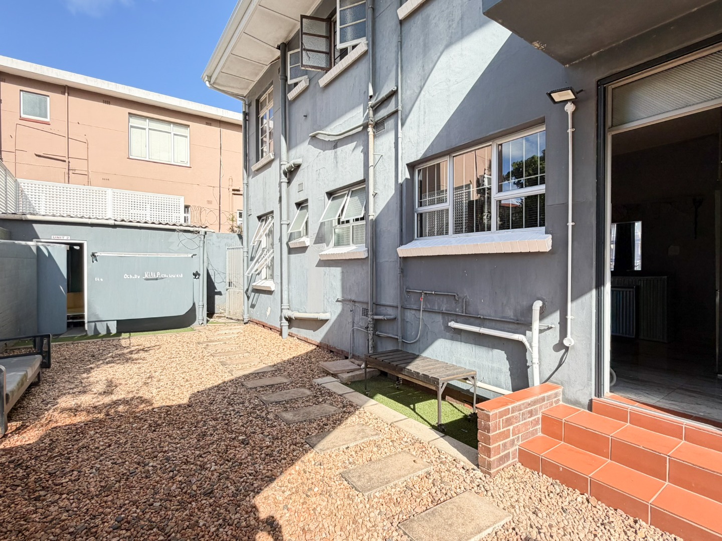 Large windows allow natural light and warmth to fill the living spaces, creating a bright and welcoming atmosphere throughout the home. The complex offers a communal outdoor entertainment area, ideal for relaxed braais and social gatherings. Residents also have access to a lock-up storeroom (currently shared between Units 2 and 4), providing valuable additional storage space. Parking is well catered for, with two secure parking bays located behind a roll-up garage door, as well as an additional parking space outside the complex. The area behind the garage remains accessible to the Body Corporate for maintenance, refuse removal, and general management.