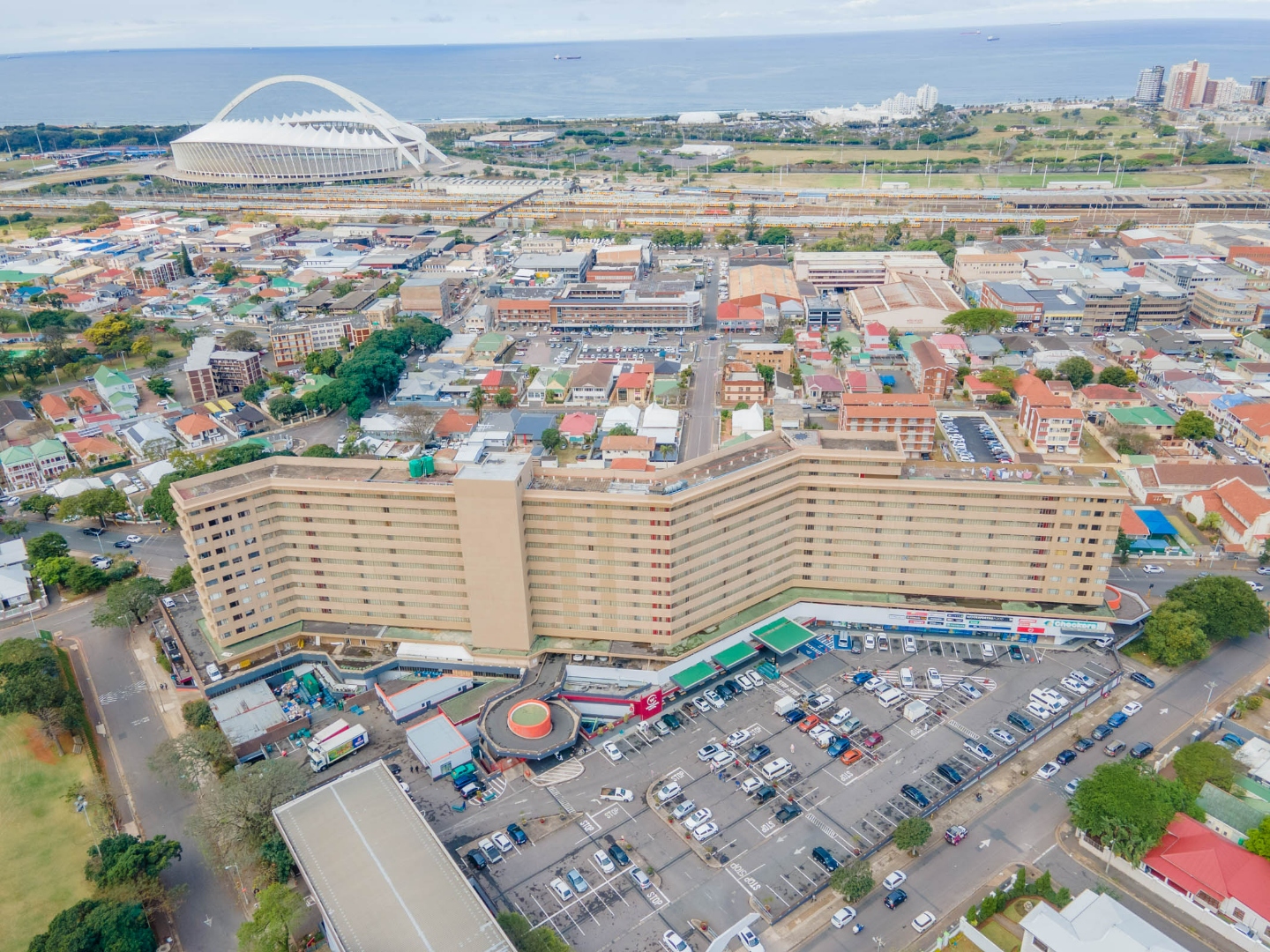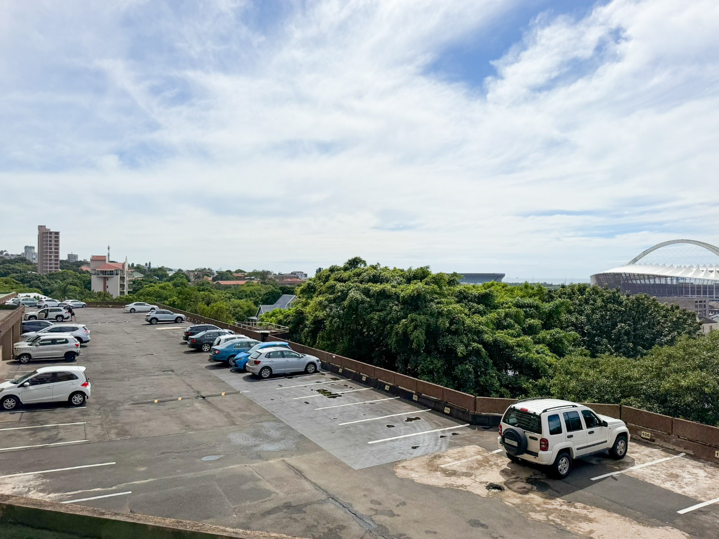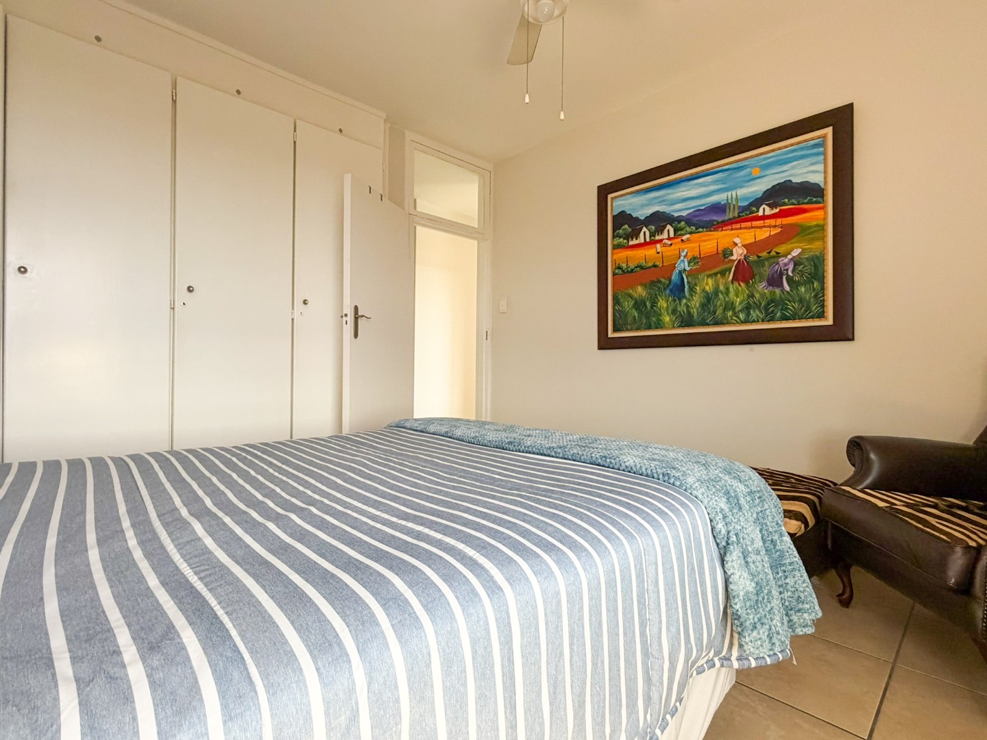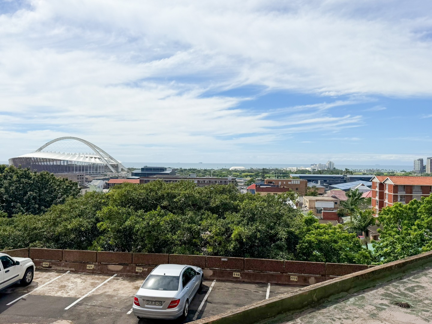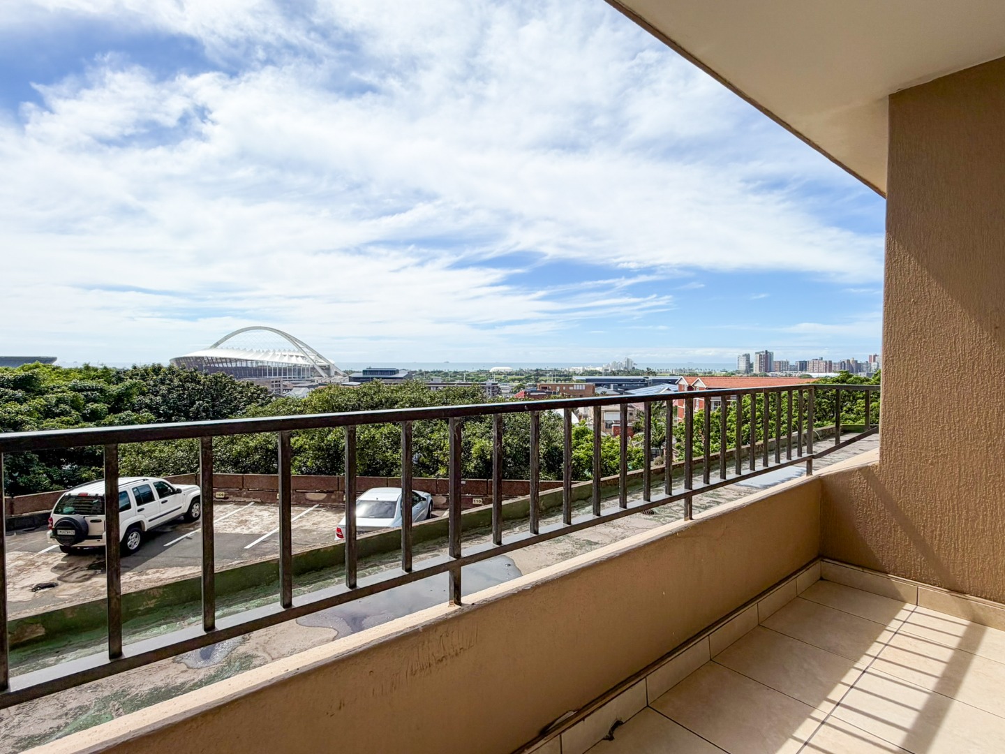 The property features a spacious dining and lounge area that flows seamlessly onto a balcony, boasting stunning sea and city views of Durban. Tiled flooring runs throughout the apartment, adding to its neat and modern appeal.
