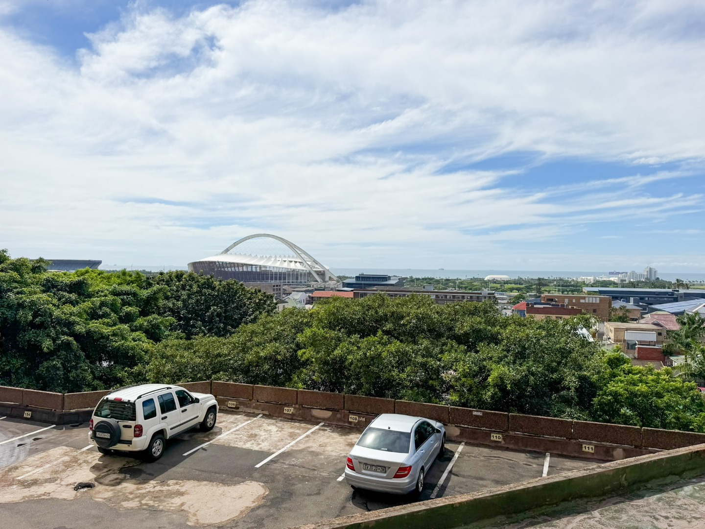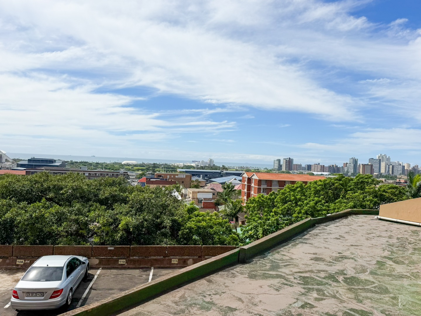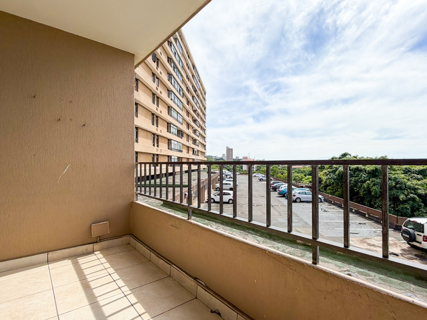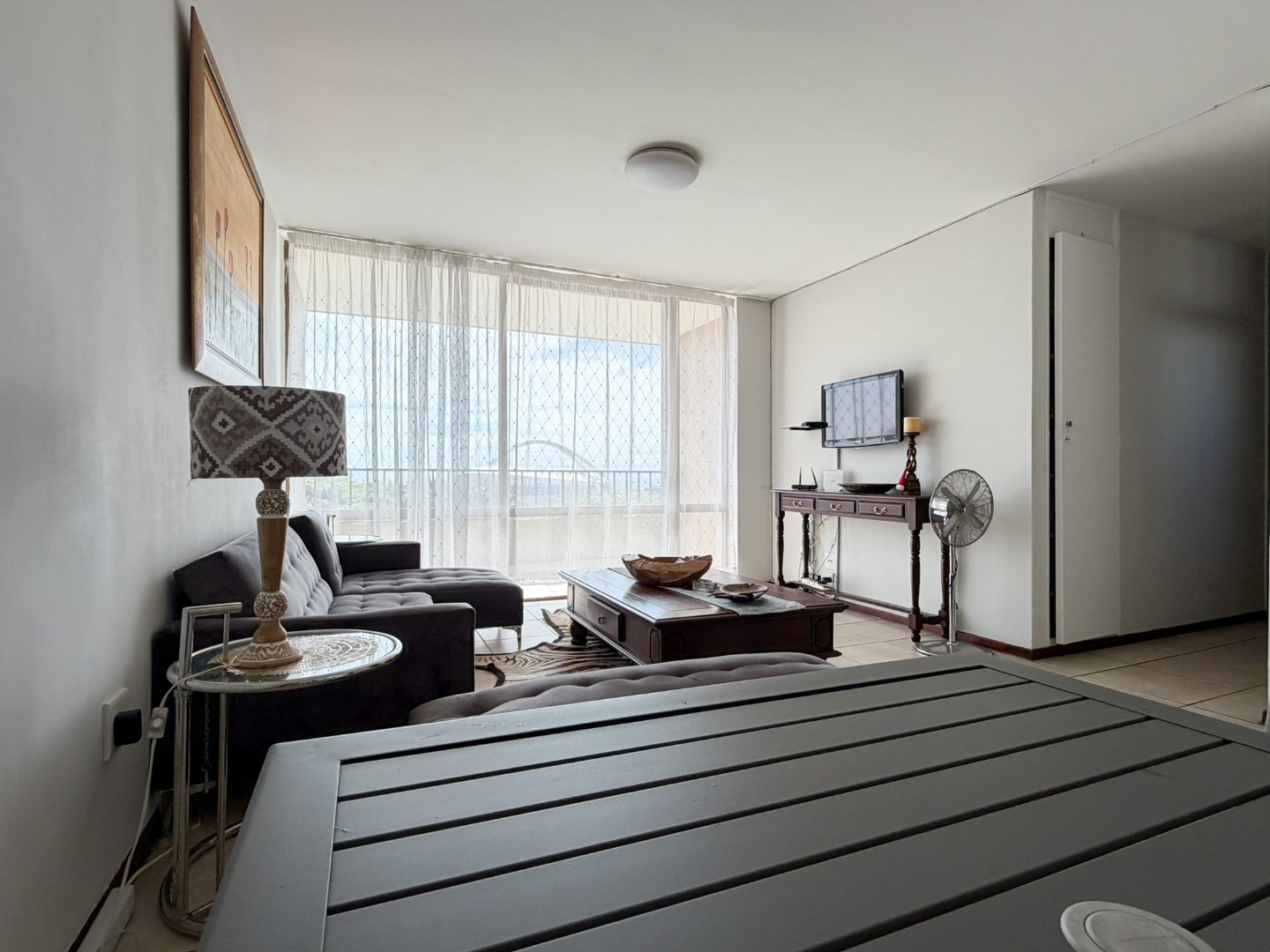 The property features a spacious dining and lounge area that flows seamlessly onto a balcony, boasting stunning sea and city views of Durban. Tiled flooring runs throughout the apartment, adding to its neat and modern appeal.