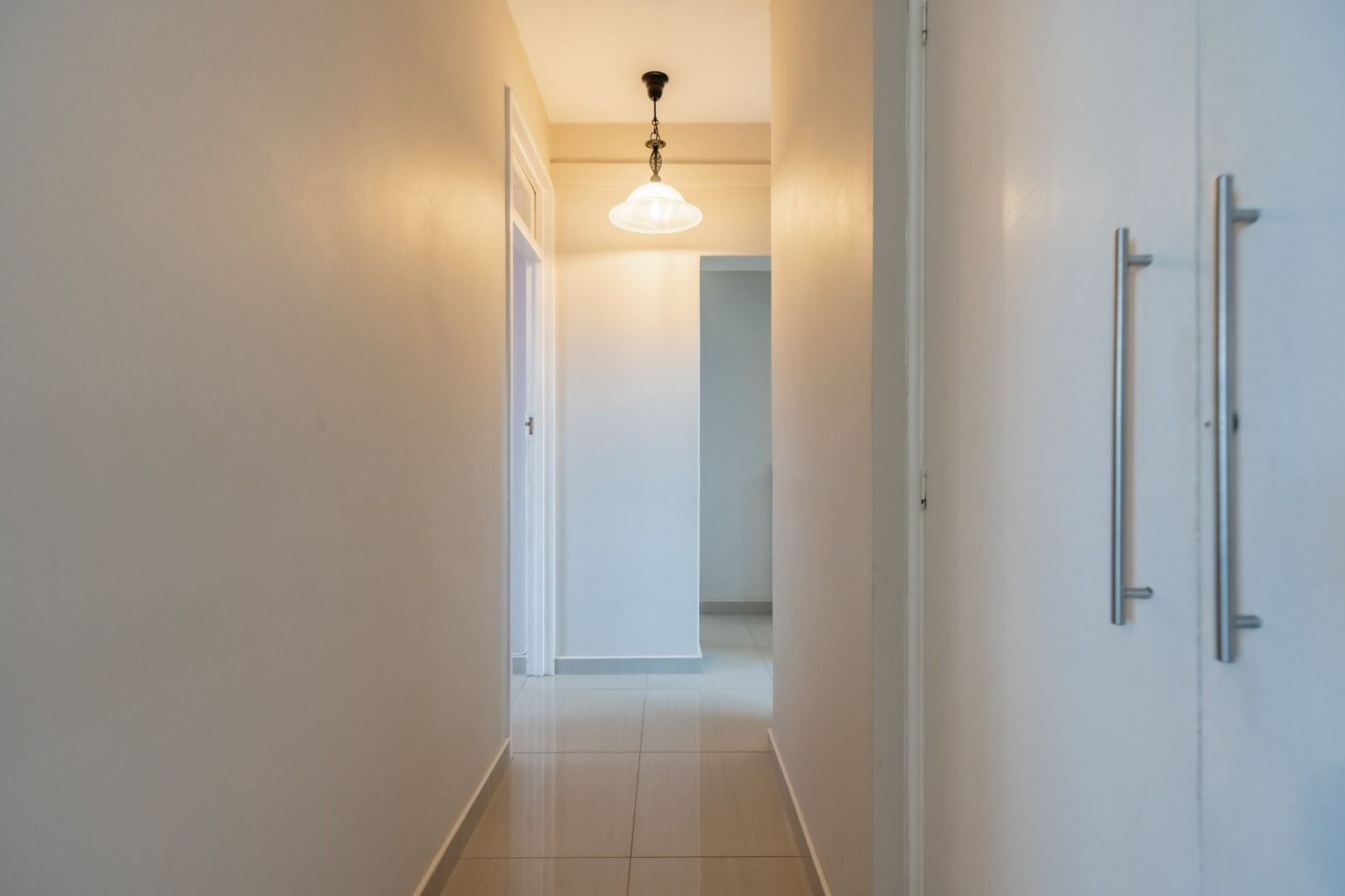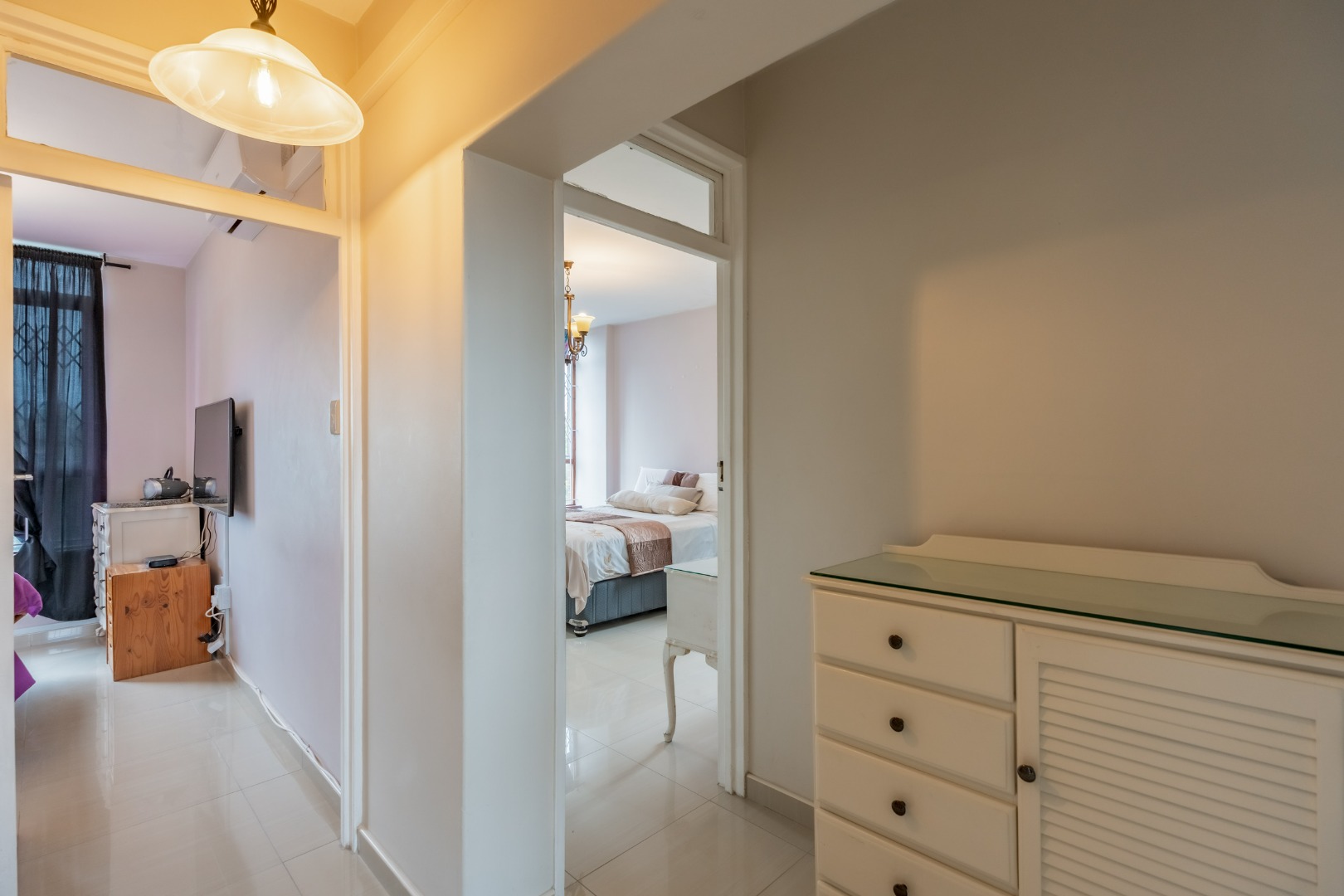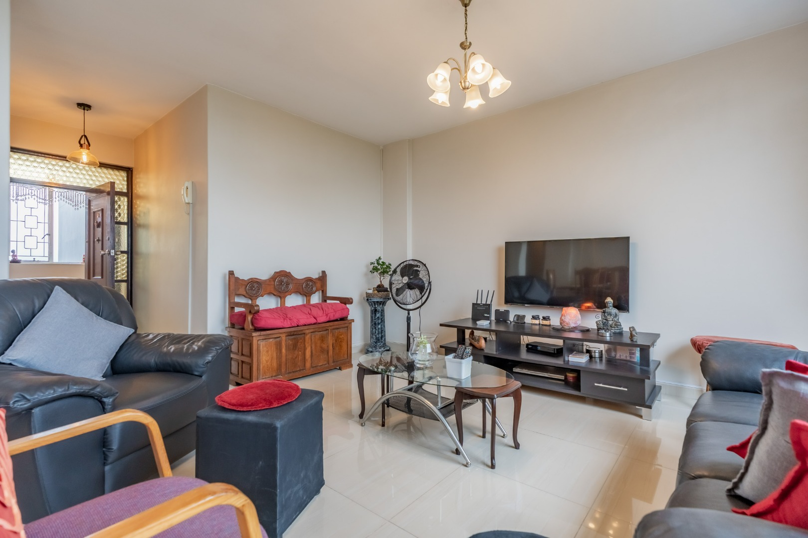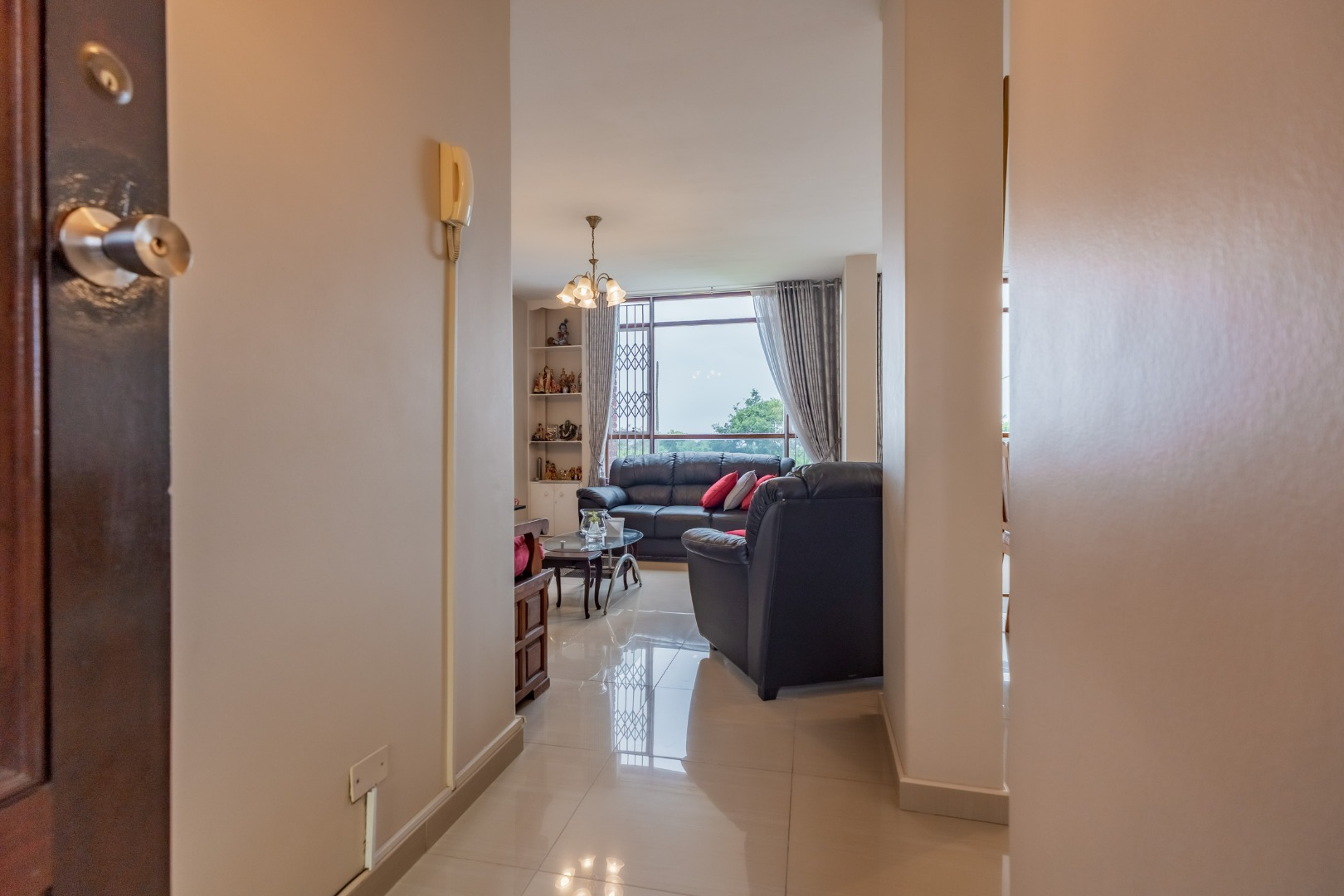 The apartment offers three spacious bedrooms, all fitted with built-in cupboards. The main bedroom includes an en-suite bathroom and an air conditioner. A general bathroom and separate toilet are fitted with a bathtub, shower, and basin. The unit is fully tiled throughout, offering a neat and low-maintenance finish.