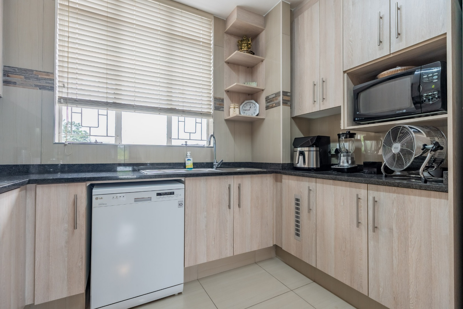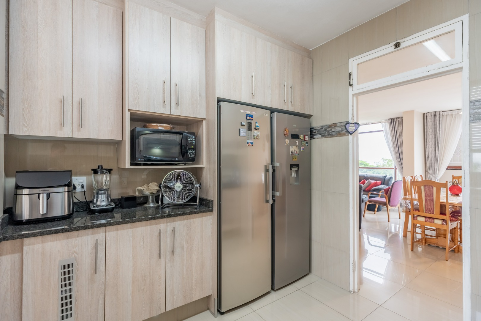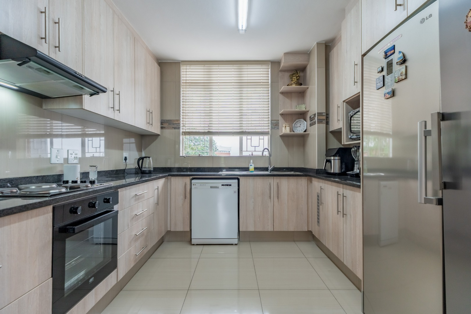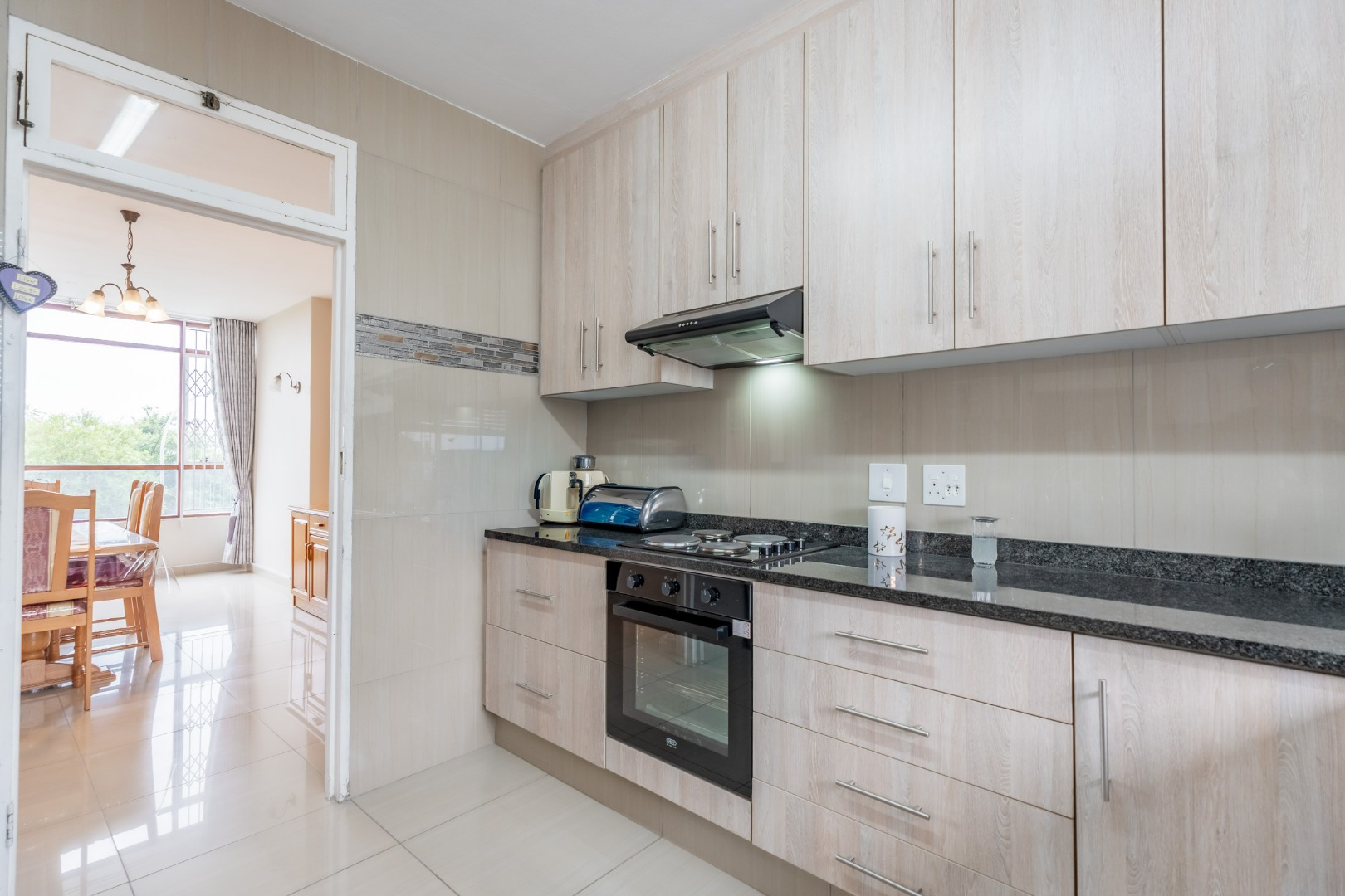 This inviting unit features a spacious open-plan lounge and dining area, perfect for relaxed living and family dinners. The kitchen is well equipped with built-in cupboards, granite countertops, a hob, extractor, and oven, with plumbing for a dishwasher and space for a double-door refrigerator.
