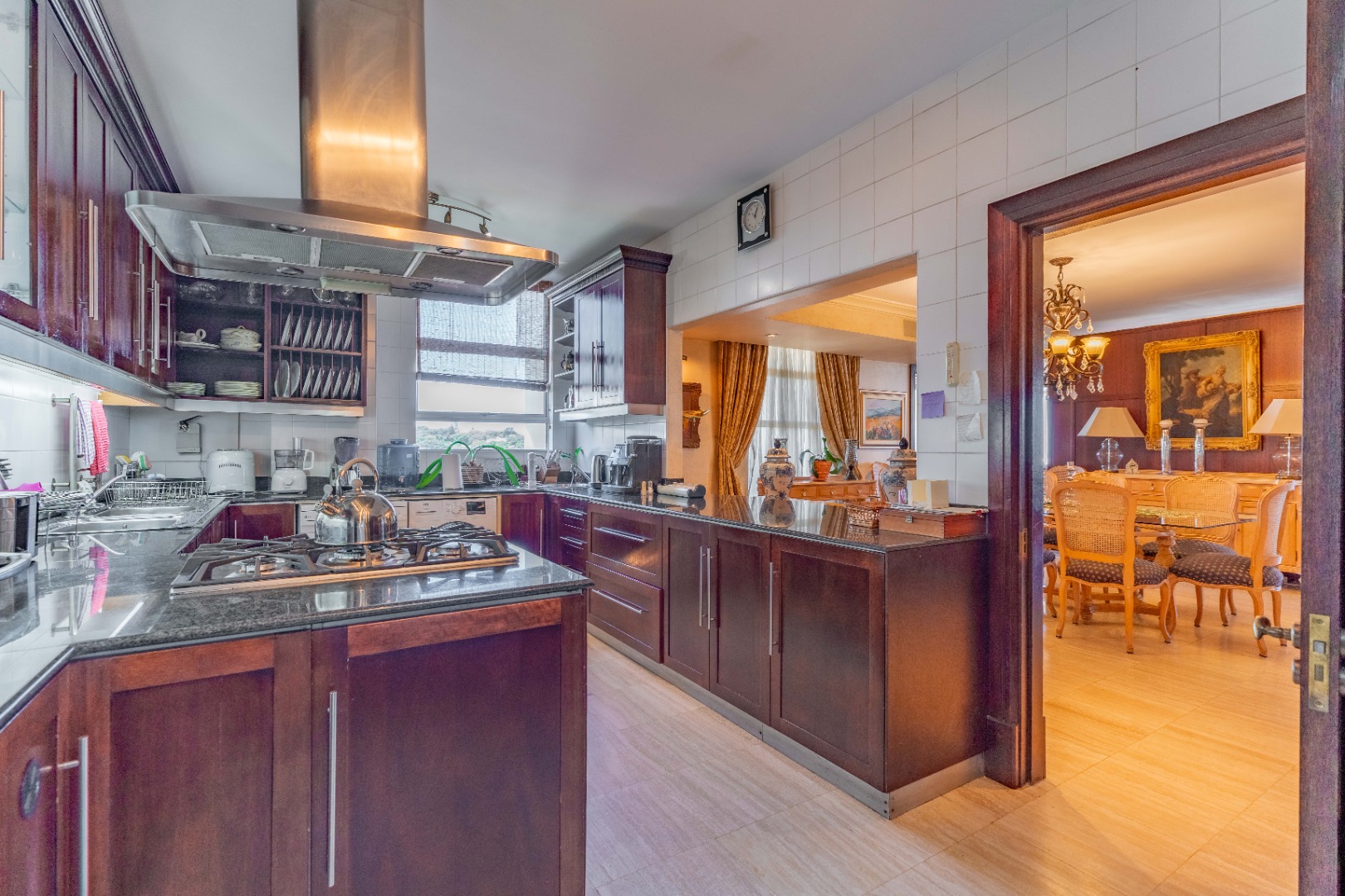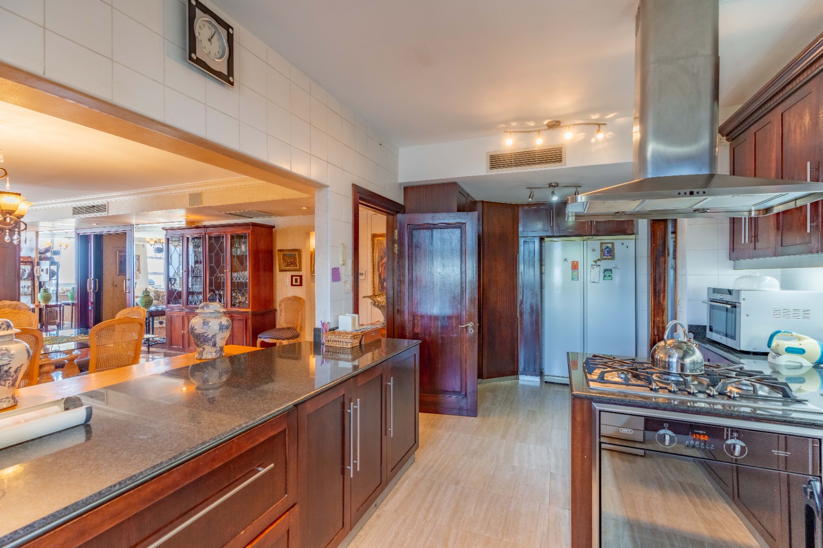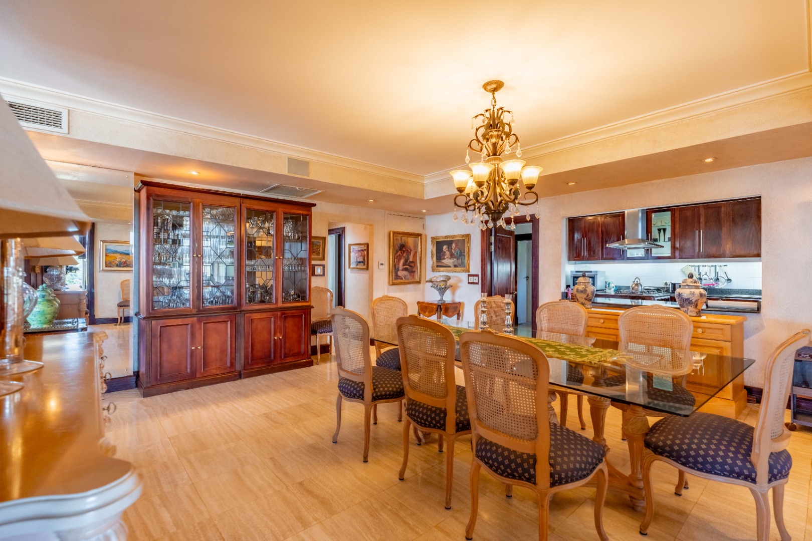 The kitchen, positioned with intention, remains visually accessible yet unobtrusive—supporting the entertainment areas without disrupting their refined appeal. A separate scullery and laundry zone ensure order and cleanliness, while a discreet storage passage leads toward the west wing of the apartment, enhancing practicality.