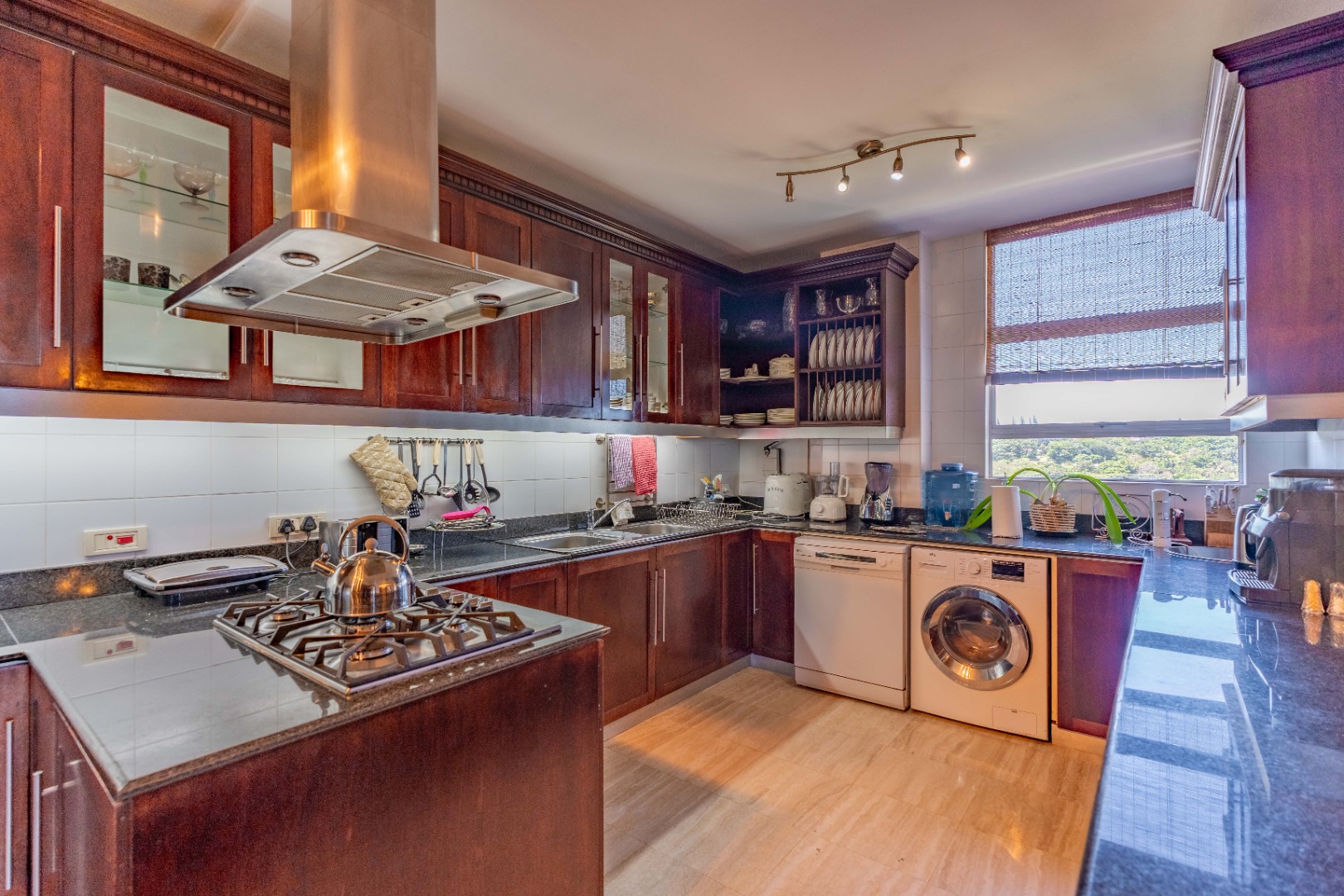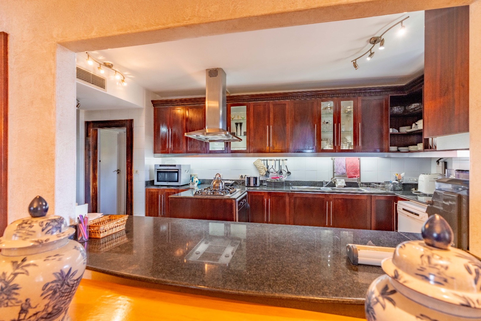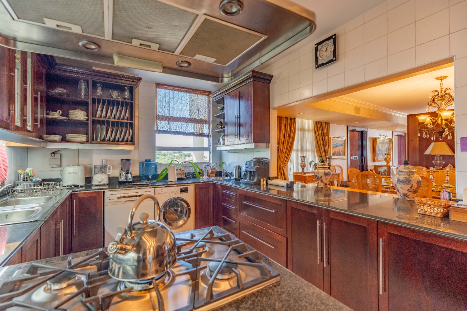 The kitchen, positioned with intention, remains visually accessible yet unobtrusive—supporting the entertainment areas without disrupting their refined appeal. A separate scullery and laundry zone ensure order and cleanliness, while a discreet storage passage leads toward the west wing of the apartment, enhancing practicality.