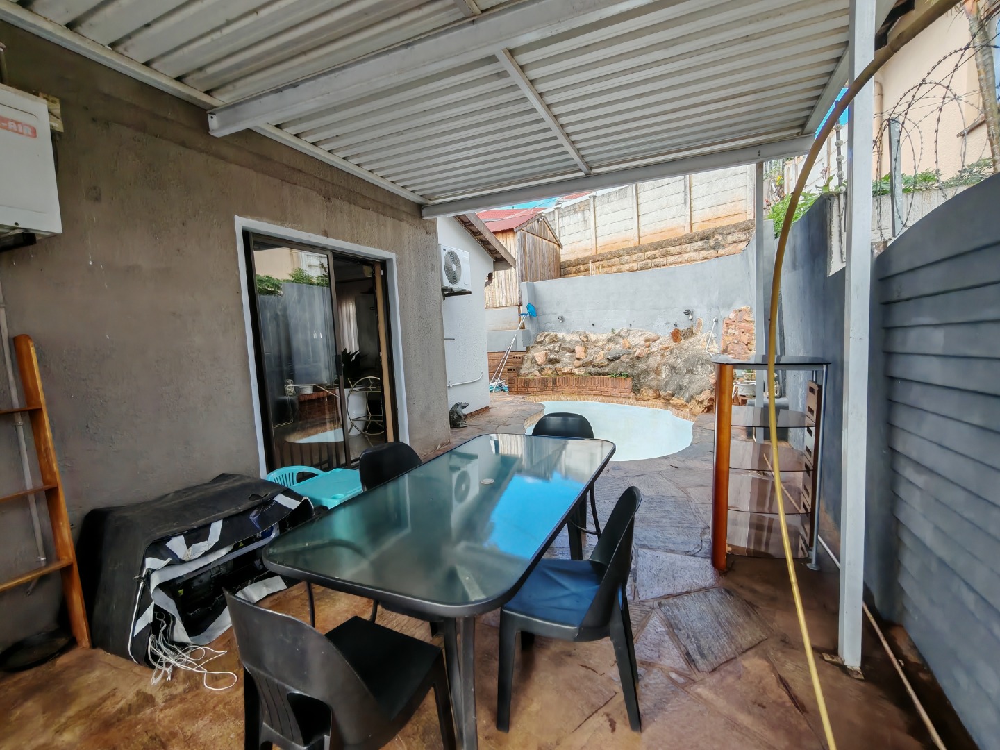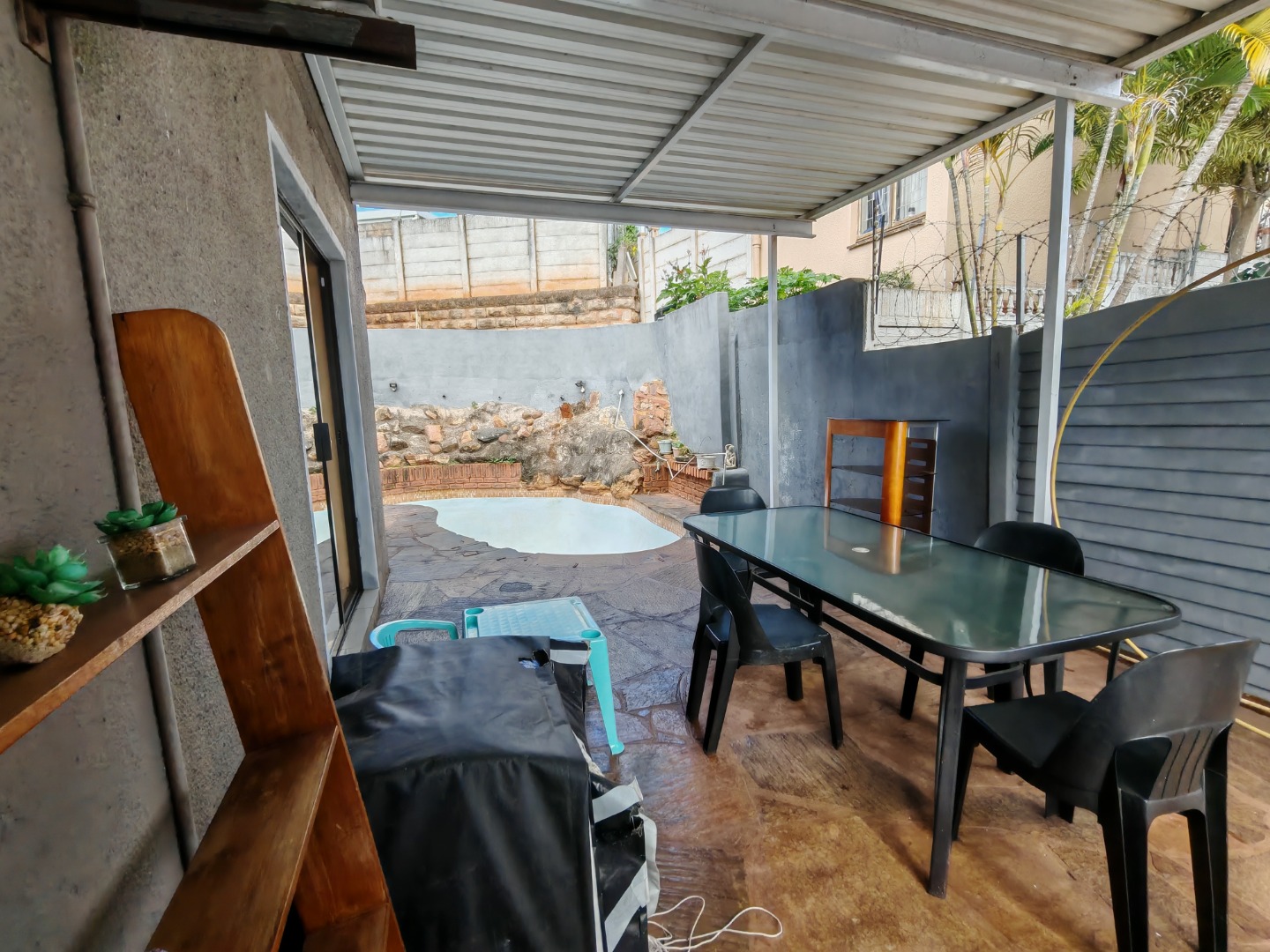 Outside, the property truly shines. A covered entertainment area is ideal for al fresco dining or weekend braais, overlooking a sparkling pool - creating the perfect space for summer relaxation. A convenient garden shed provides additional storage for tools and outdoor equipment, with even more potential to enhance the outdoor space to your taste.