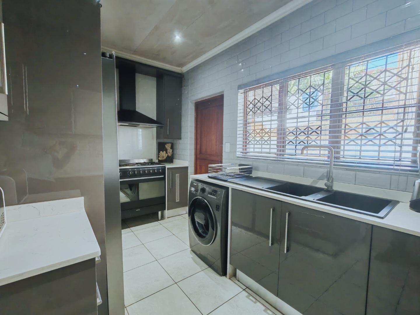Step inside and be greeted by an inviting open-plan lounge and dining area, enhanced by sleek downlights and dual air conditioning units for year-round comfort. The heart of the home is a stunning, fully renovated kitchen featuring high-gloss cabinetry, a sophisticated black granite sink, ample storage space, and plumbing for a washing machine - designed with both elegance and functionality in mind.
