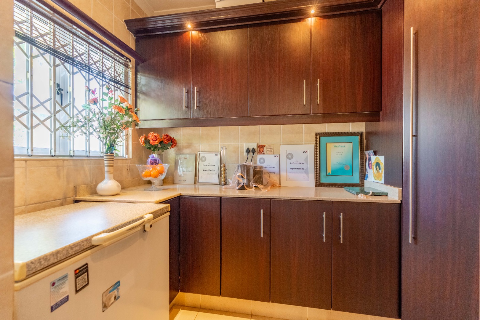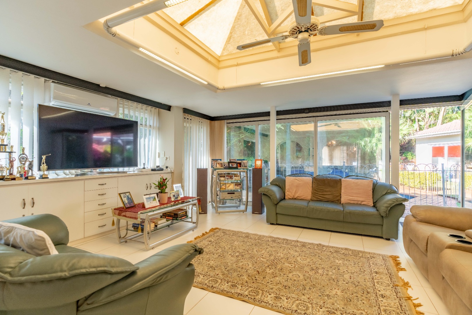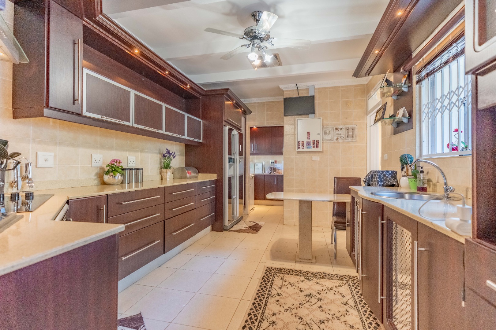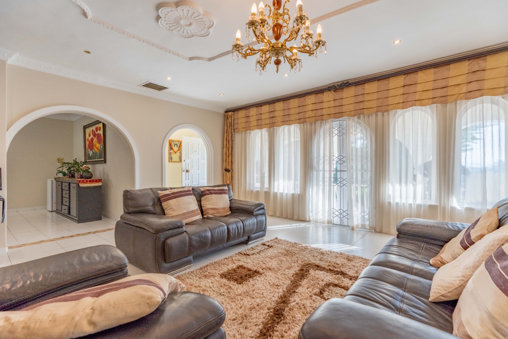 The property has three comfortable bedrooms with the main bedroom having an ensuite with a full bathroom and a walk in closet. The other two bedrooms share a full bathroom. All bedrooms have a/c. The flooring from entrance to bedrooms is a combination of tiles and laminate flooring. The living area consists of 2 lounges and a dinning room The seamless flow from kitchen to living areas is accentuated by a beautiful skylight and stunning pressed double volume ceiling with tasteful chandeliers in lounge and dining room. The recreational lounge opens out onto the pool area as does the dining room. The inviting sparkling pool area sits adjacent to a cabana style entertainment area.