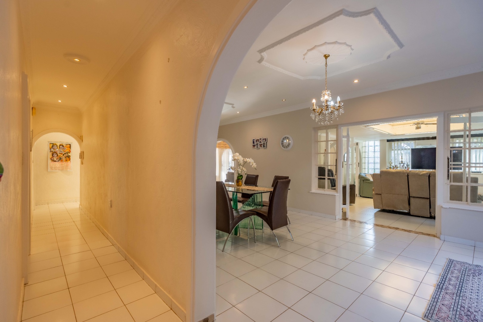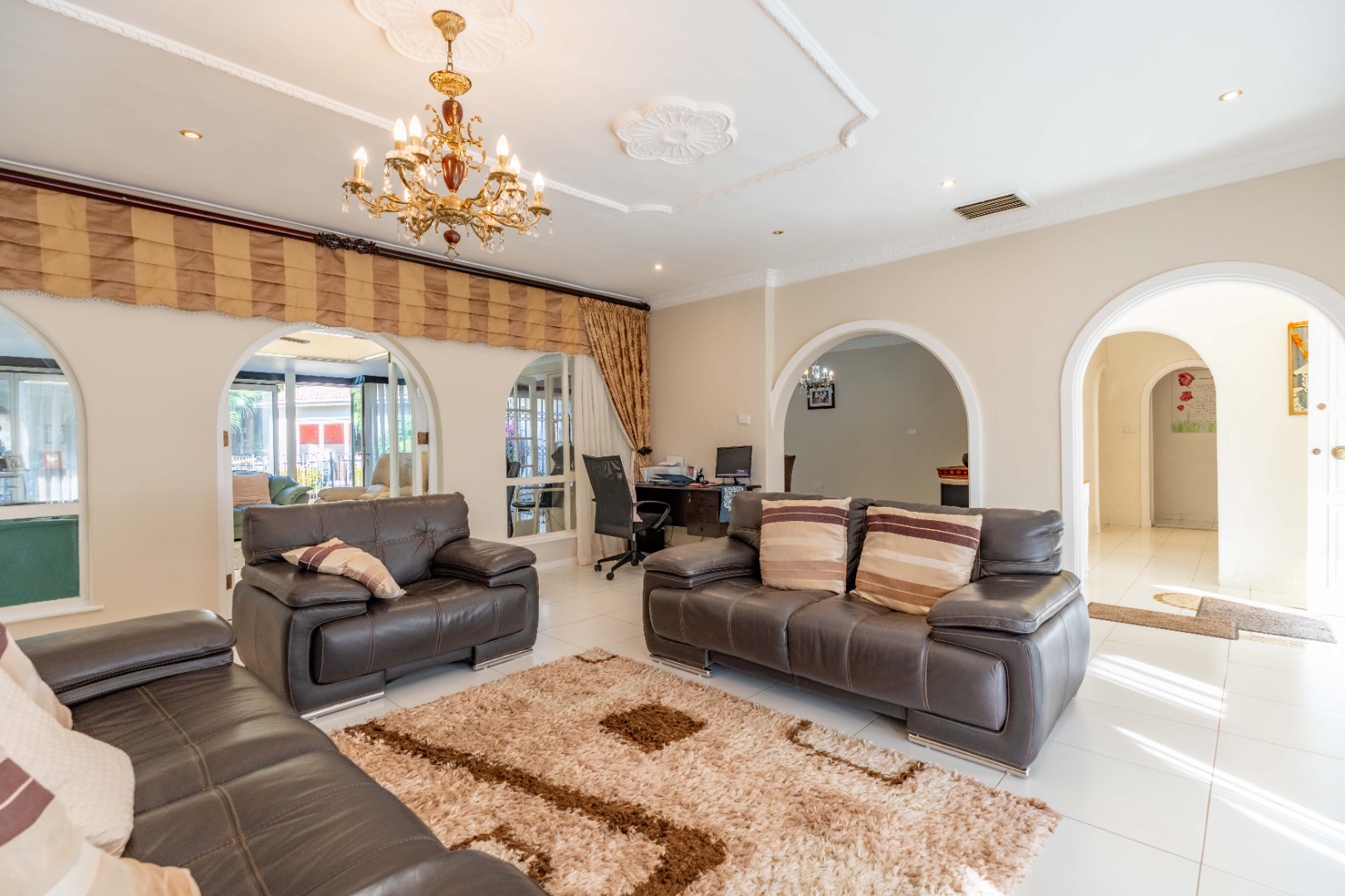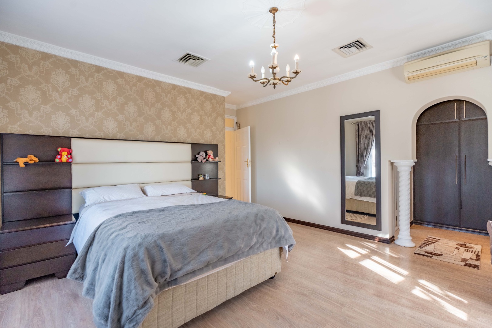 The property has three comfortable bedrooms with the main bedroom having an ensuite with a full bathroom and a walk in closet. The other two bedrooms share a full bathroom. All bedrooms have a/c. The flooring from entrance to bedrooms is a combination of tiles and laminate flooring. The living area consists of 2 lounges and a dinning room The seamless flow from kitchen to living areas is accentuated by a beautiful skylight and stunning pressed double volume ceiling with tasteful chandeliers in lounge and dining room. The recreational lounge opens out onto the pool area as does the dining room. The inviting sparkling pool area sits adjacent to a cabana style entertainment area.