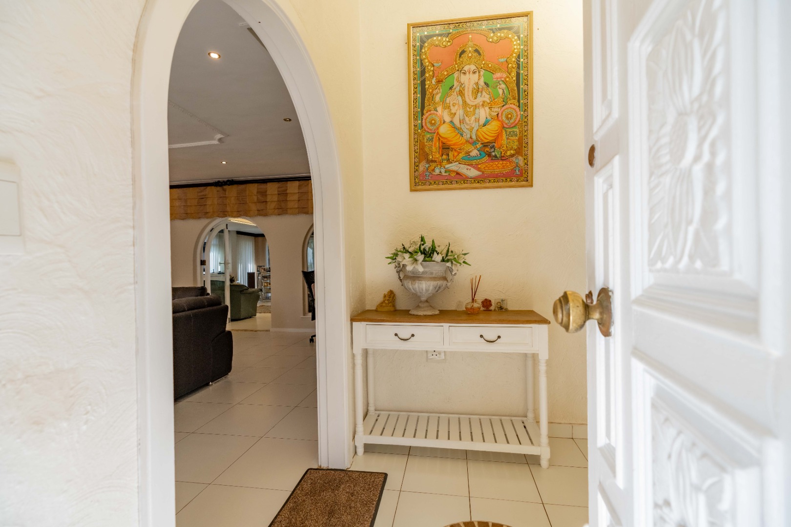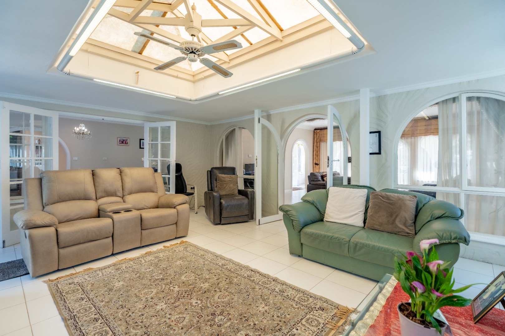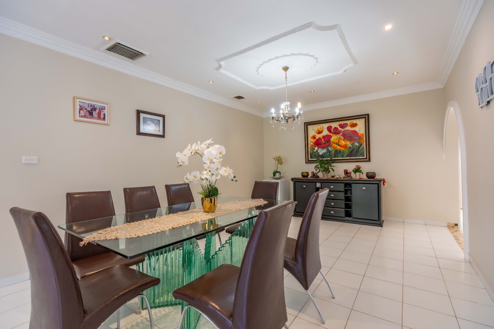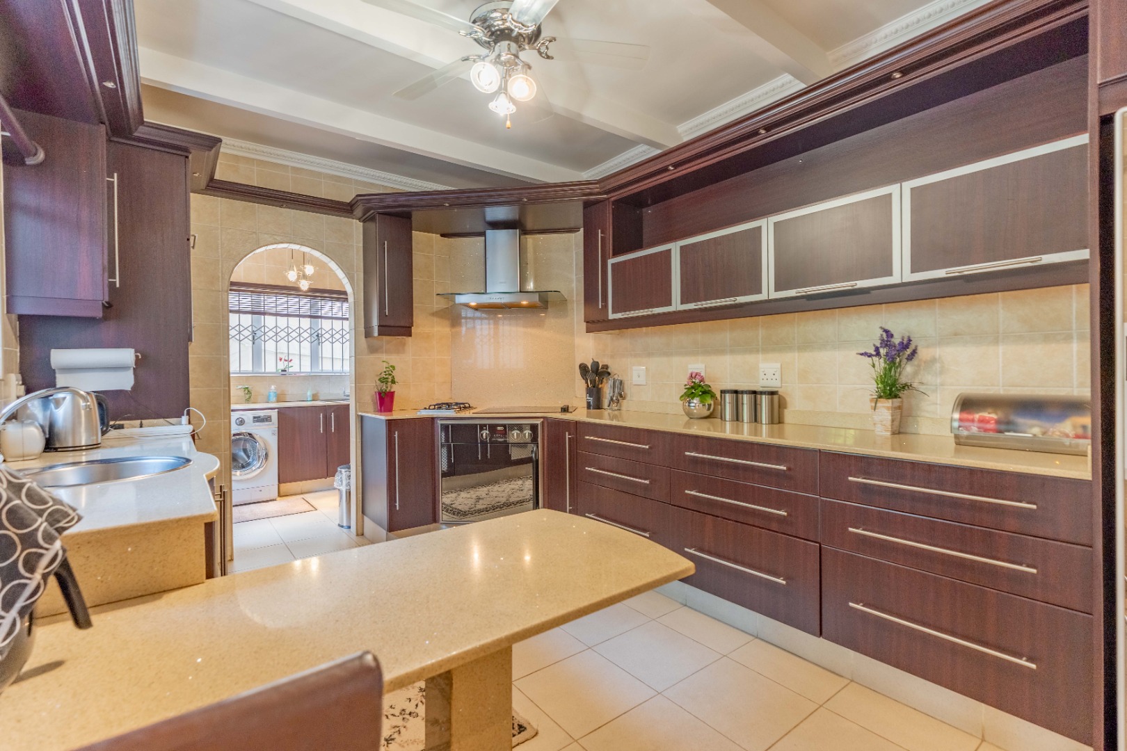 The property has three comfortable bedrooms with the main bedroom having an ensuite with a full bathroom and a walk in closet. The other two bedrooms share a full bathroom. All bedrooms have a/c. The flooring from entrance to bedrooms is a combination of tiles and laminate flooring. The living area consists of 2 lounges and a dinning room The seamless flow from kitchen to living areas is accentuated by a beautiful skylight and stunning pressed double volume ceiling with tasteful chandeliers in lounge and dining room. The recreational lounge opens out onto the pool area as does the dining room. The inviting sparkling pool area sits adjacent to a cabana style entertainment area.