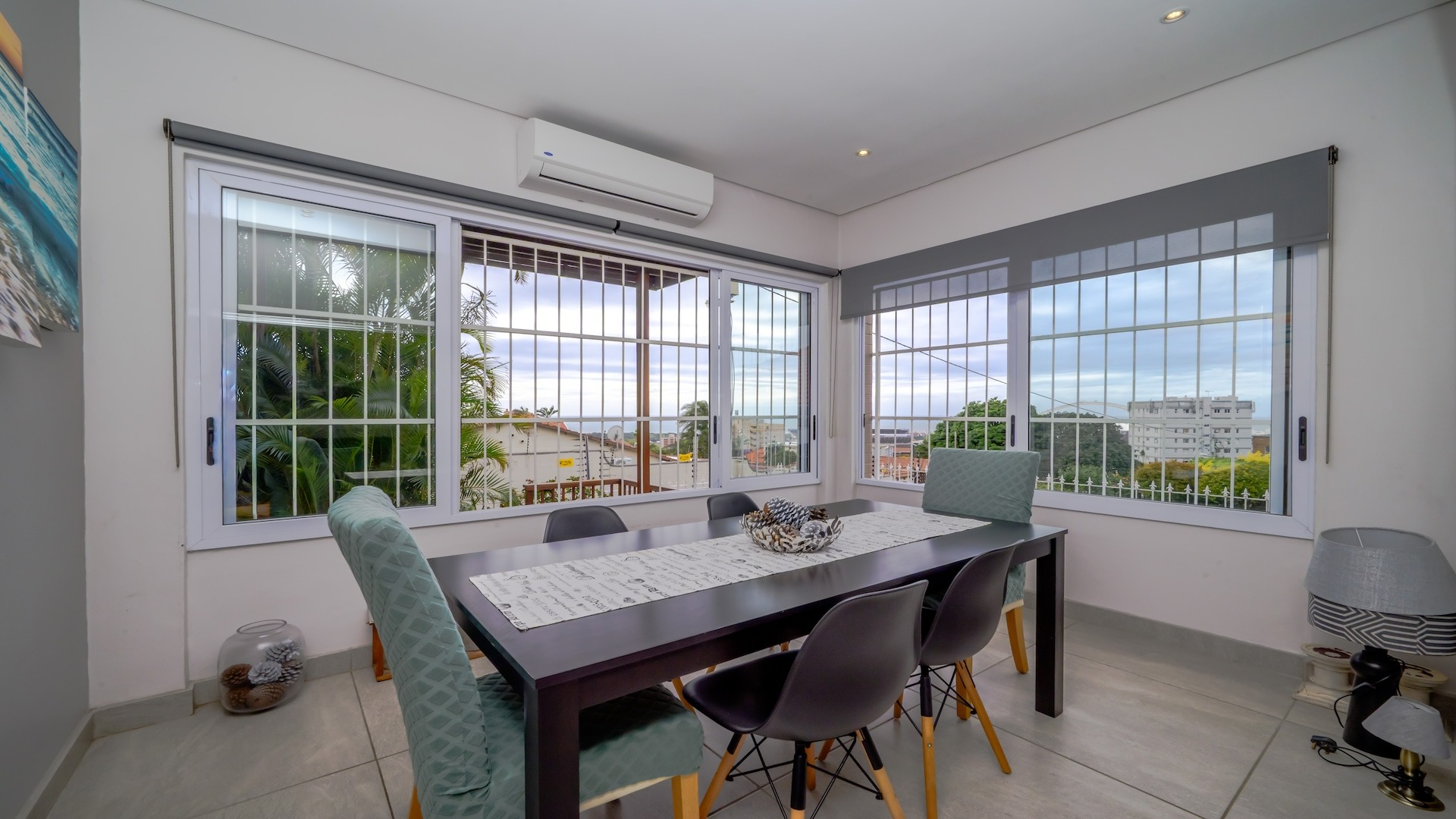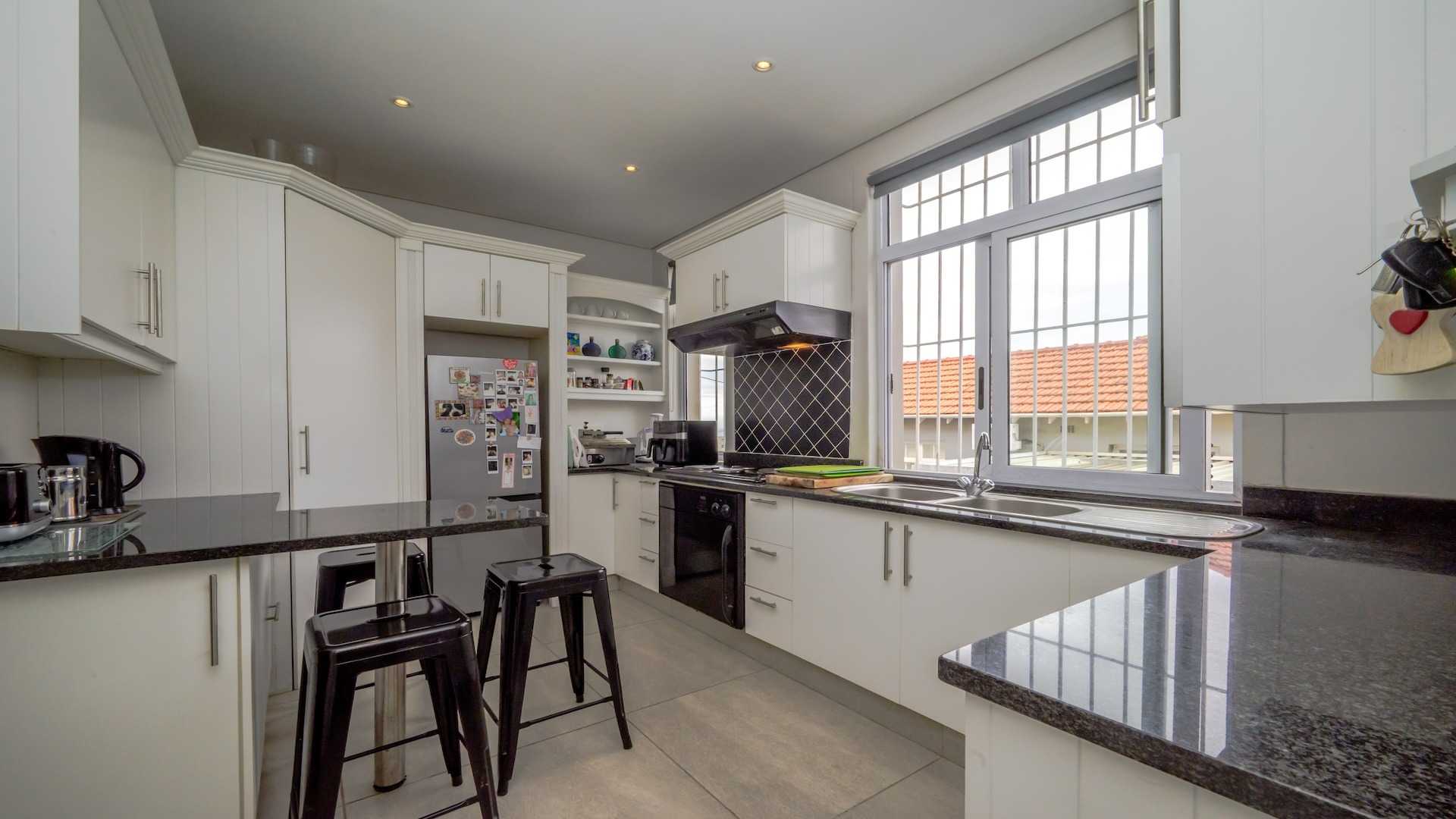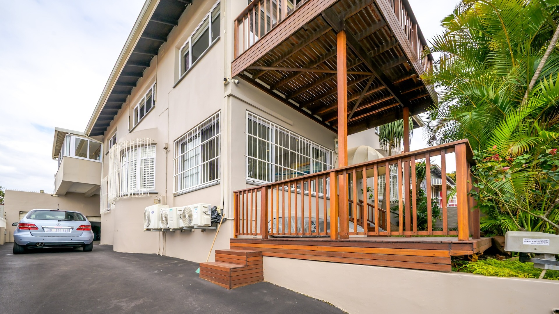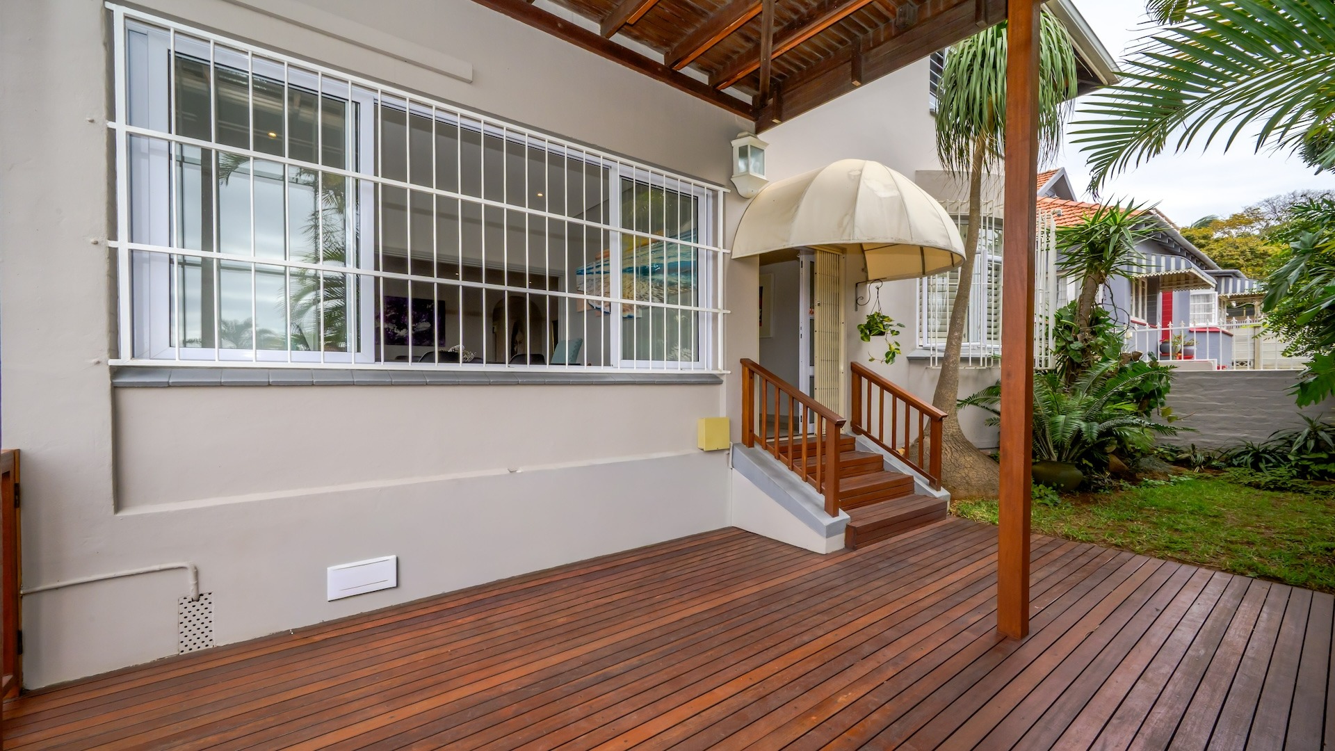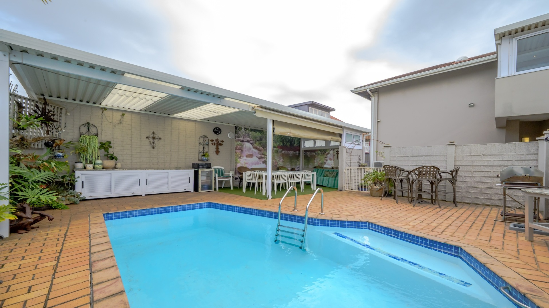 Step into this beautifully maintained home — one of two units on the property — offering comfort, space, and a touch of elegance throughout. The spacious kitchen features built-in cupboards, granite countertops, a built-in oven, stove, extractor fan, double sink, and a convenient breakfast nook. Ample natural light fills the space, flowing seamlessly into a separate scullery area plumbed for a washing machine. The lounge impresses with its generous size, bright ambiance, and views, leading into a well-appointed dining area. There is additional space before the kitchen entrance, ideal for added functionality or decor. A guest toilet with a basin is conveniently located on the ground floor. This home offers three spacious bedrooms, all fully tiled and air-conditioned. The main bathroom includes a bathtub, shower, basin, and toilet. From the front door, you step out onto a large deck area that offer sea views — perfect for relaxing or entertaining. On the side of the deck, you have a garden area. Situated on the tranquil Ross Gardens Road in Morningside, just off Rapson Road, the property enjoys a quiet cul-de-sac position surrounded by upmarket homes. Residents share access to a communal pool and braai area, ideal for hosting family and friends. The bottom unit also includes a store room or helper’s accommodation with a bathroom.