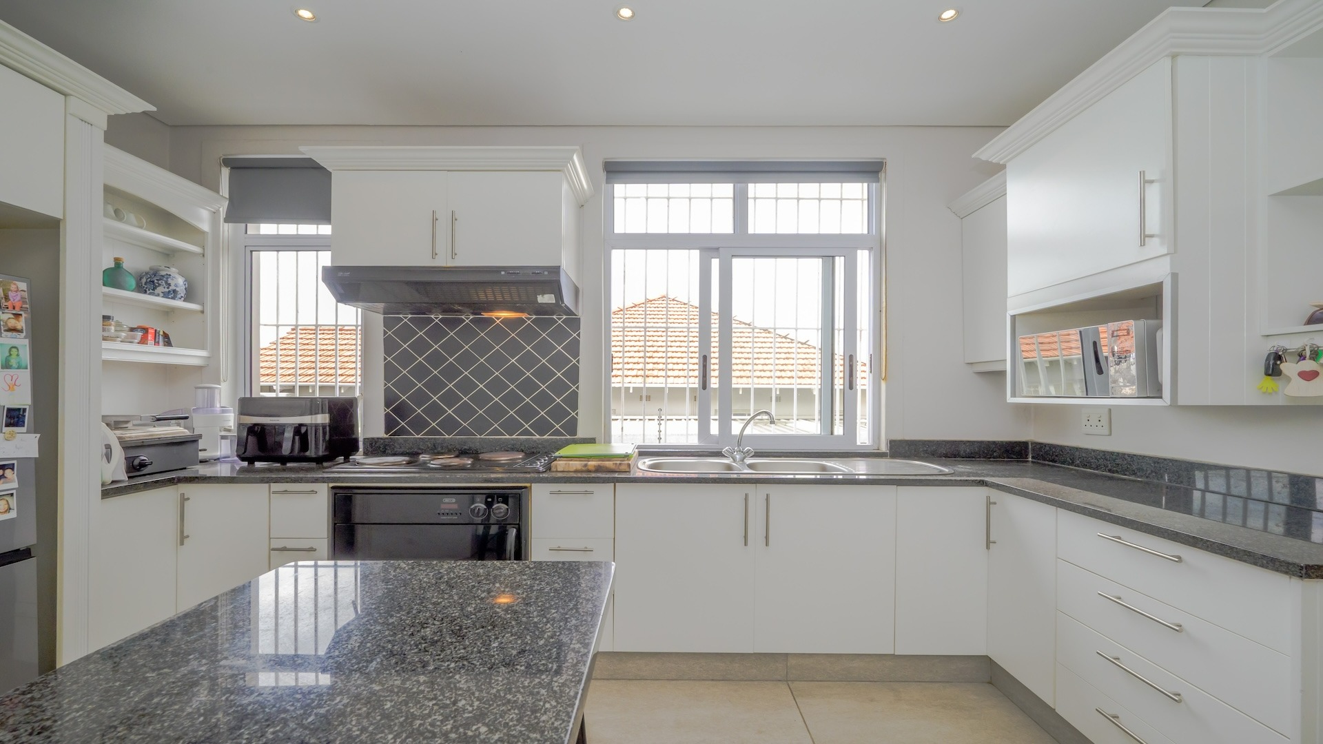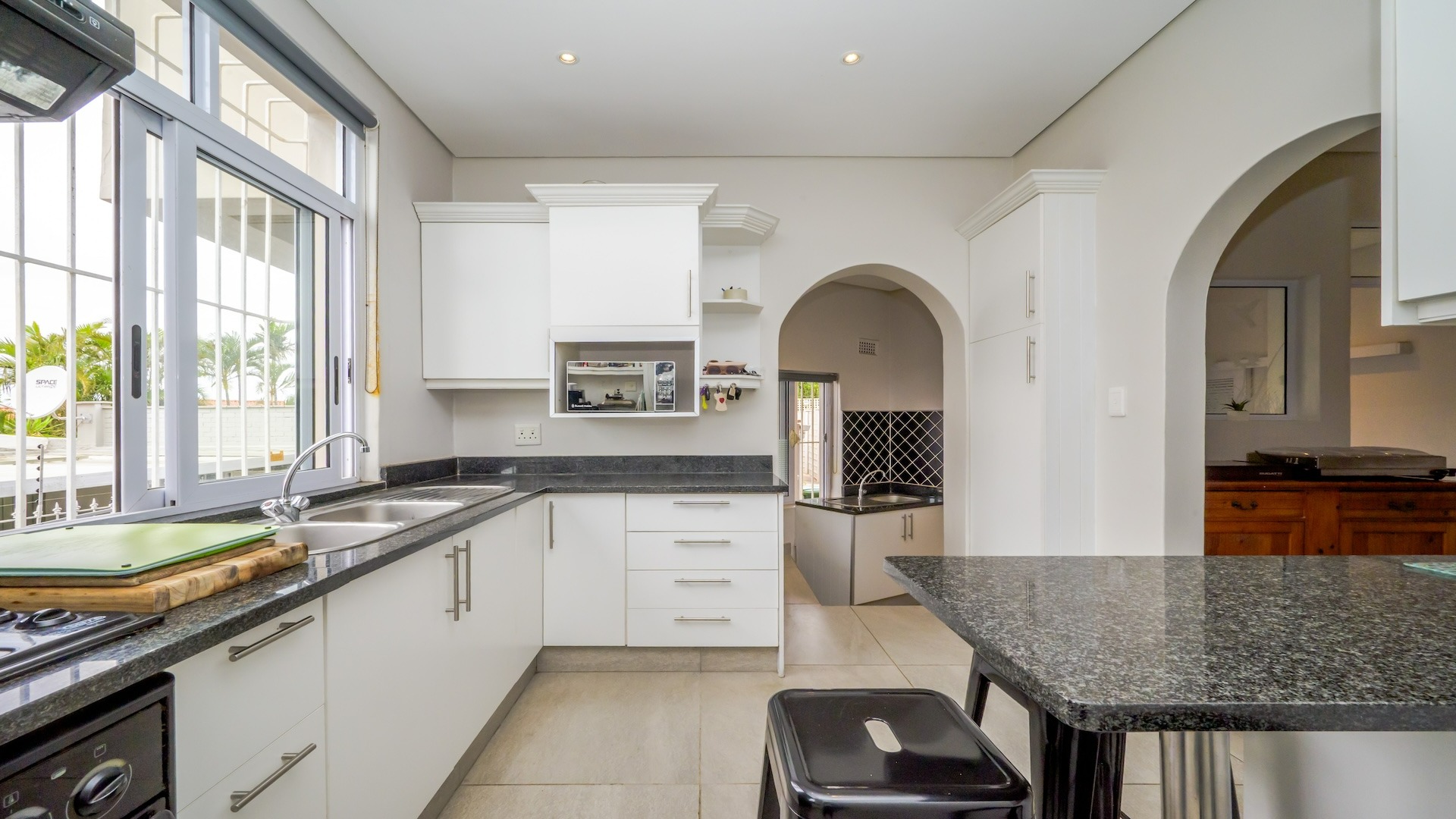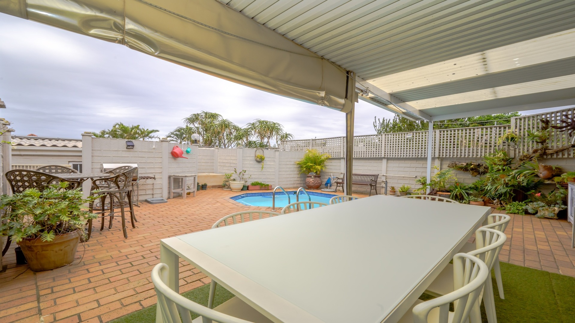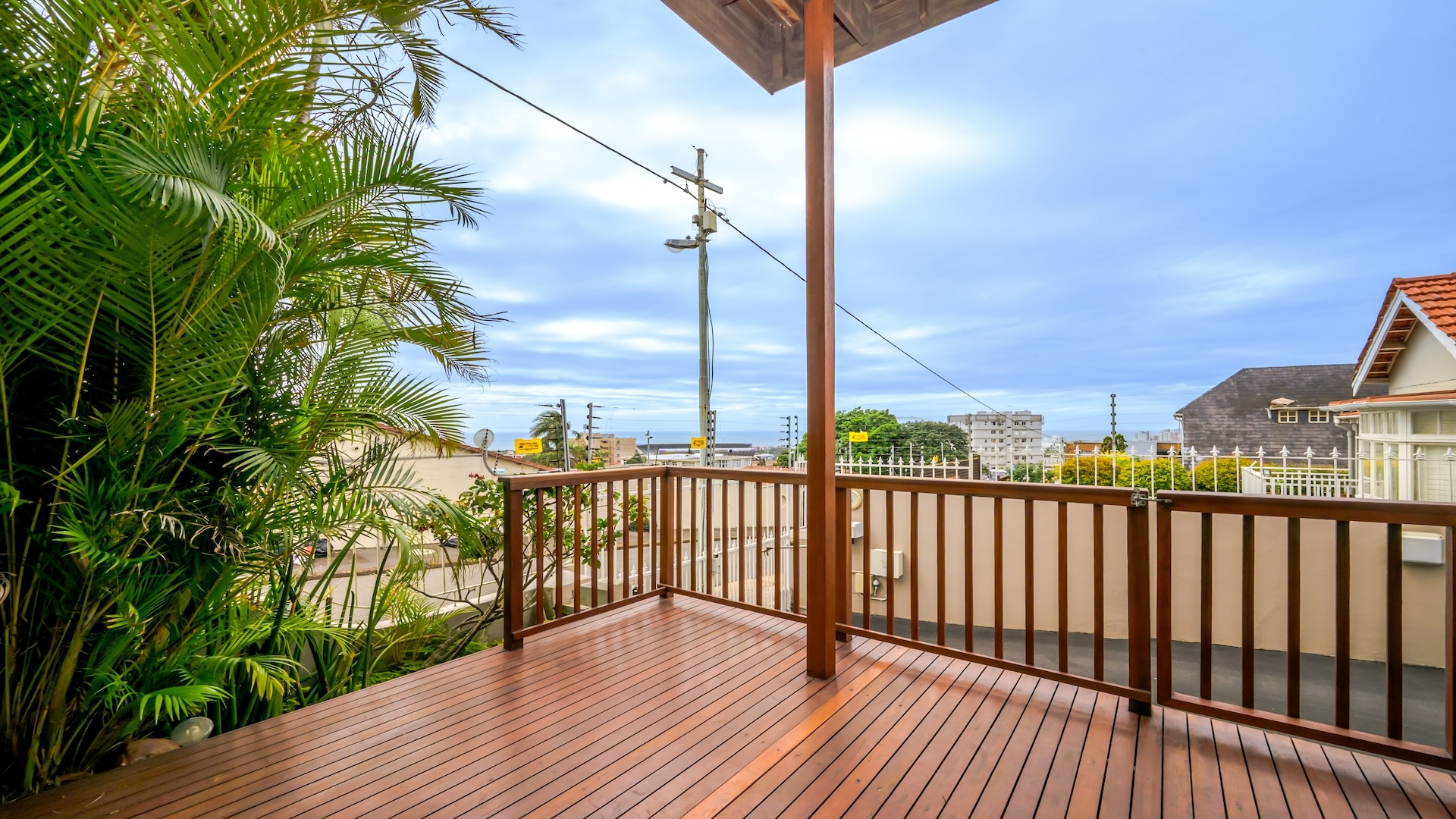 Step into this beautifully maintained home — one of two units on the property — offering comfort, space, and a touch of elegance throughout. The spacious kitchen features built-in cupboards, granite countertops, a built-in oven, stove, extractor fan, double sink, and a convenient breakfast nook. Ample natural light fills the space, flowing seamlessly into a separate scullery area plumbed for a washing machine. The lounge impresses with its generous size, bright ambiance, and views, leading into a well-appointed dining area. There is additional space before the kitchen entrance, ideal for added functionality or decor. A guest toilet with a basin is conveniently located on the ground floor. This home offers three spacious bedrooms, all fully tiled and air-conditioned. The main bathroom includes a bathtub, shower, basin, and toilet. From the front door, you step out onto a large deck area that offer sea views — perfect for relaxing or entertaining. On the side of the deck, you have a garden area. Situated on the tranquil Ross Gardens Road in Morningside, just off Rapson Road, the property enjoys a quiet cul-de-sac position surrounded by upmarket homes. Residents share access to a communal pool and braai area, ideal for hosting family and friends. The bottom unit also includes a store room or helper’s accommodation with a bathroom.