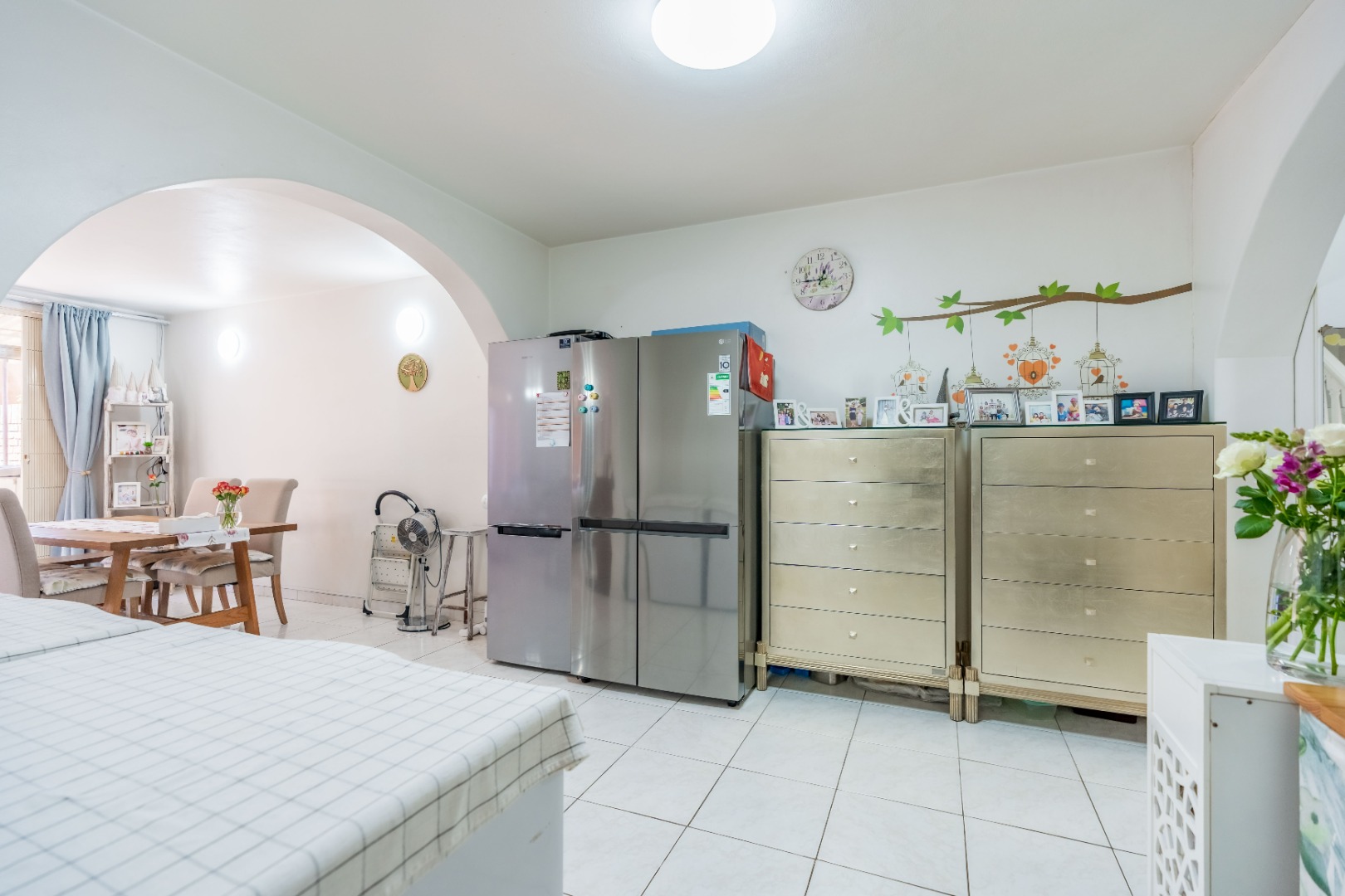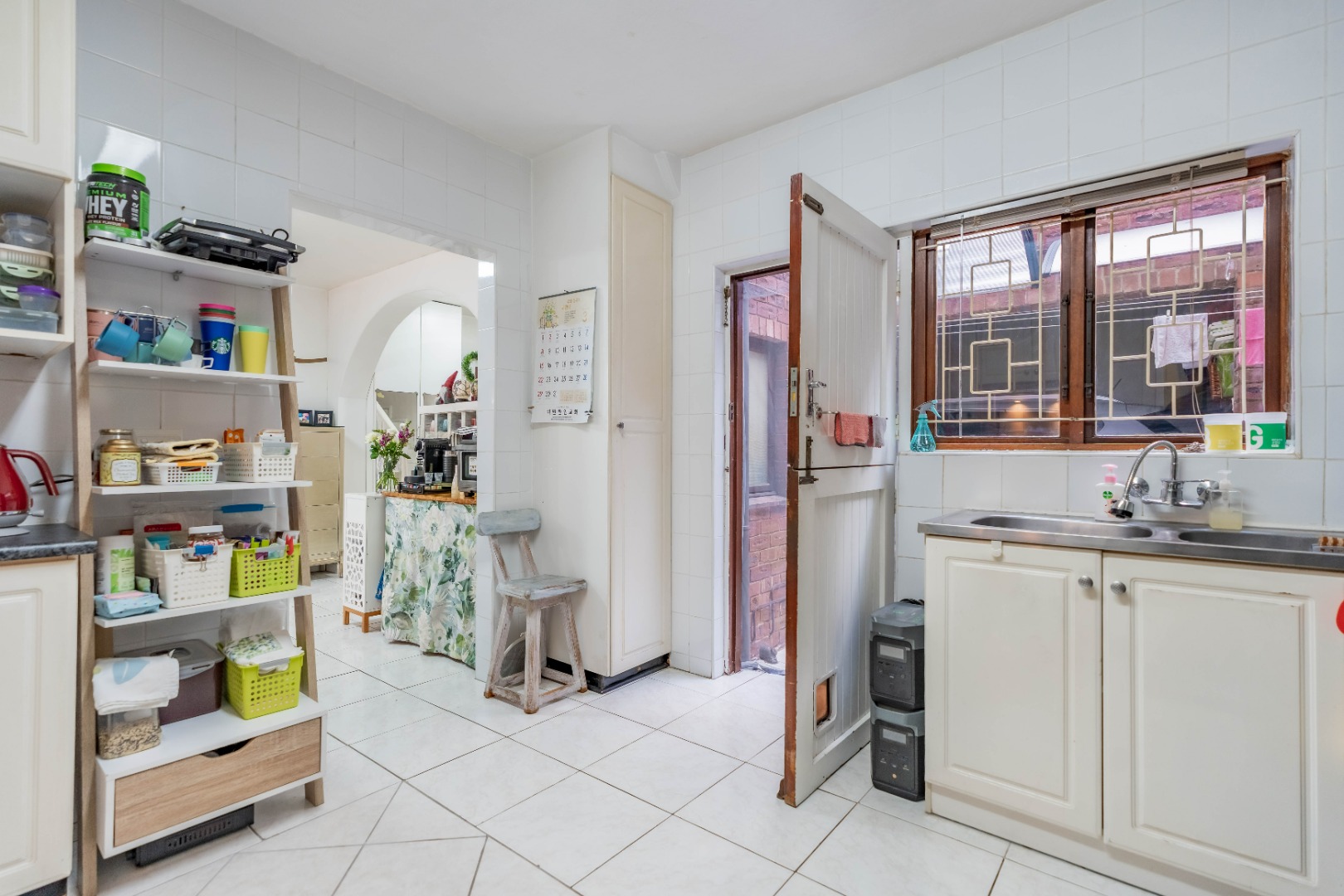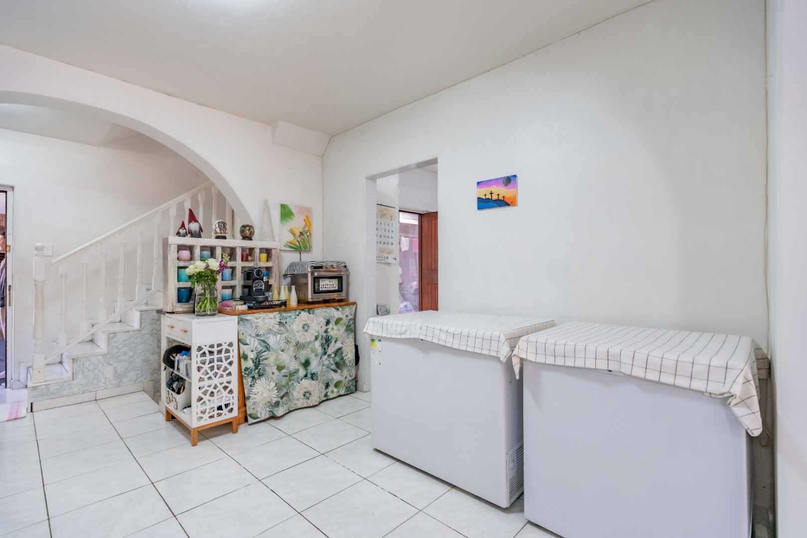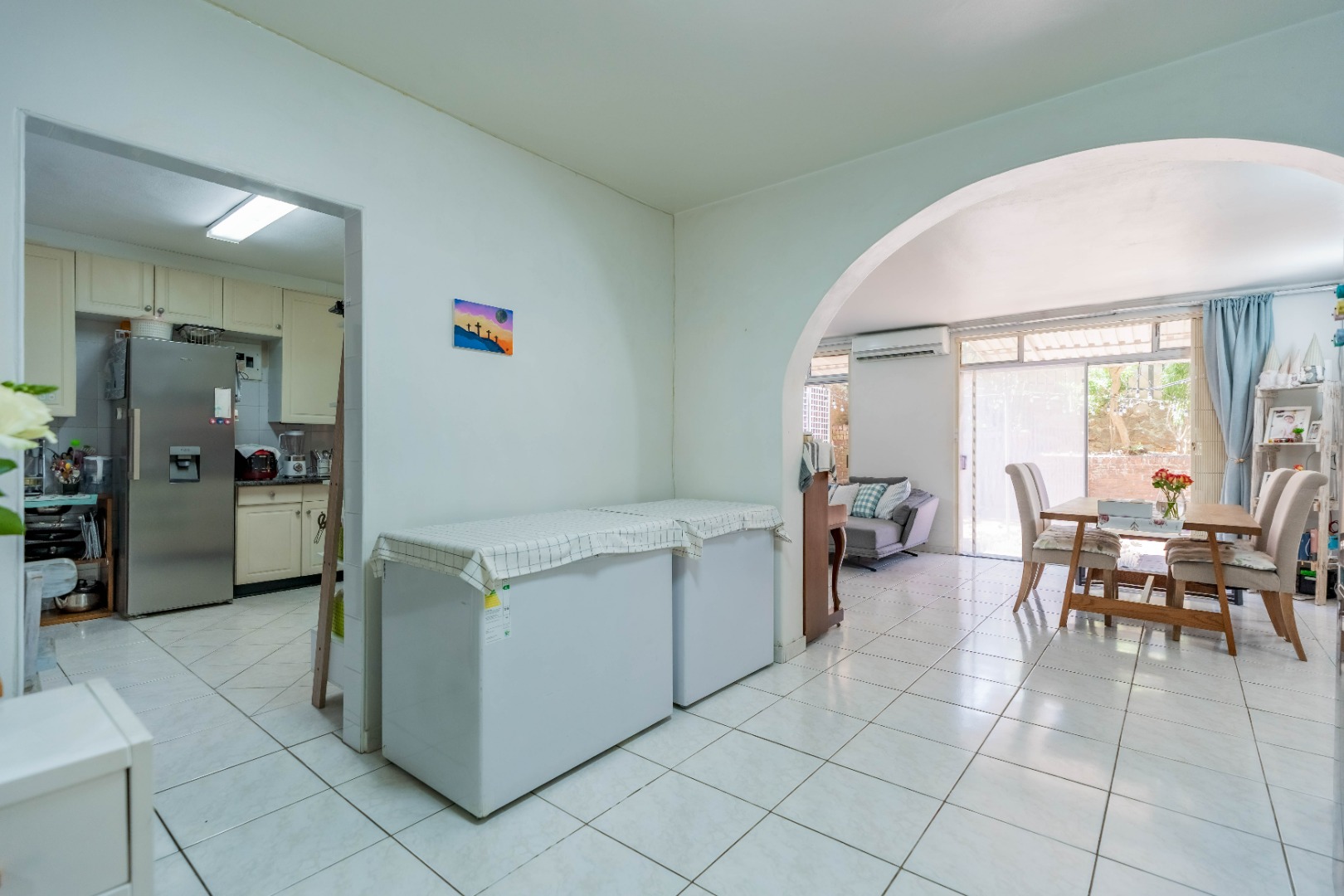 As you enter the property, you are welcomed by a functional, fully fitted kitchen with tiled floors and walls, built-in cupboards, an extractor fan, and a movable stove. The kitchen flows seamlessly into the open-plan dining and lounge area, creating a warm and inviting living space.