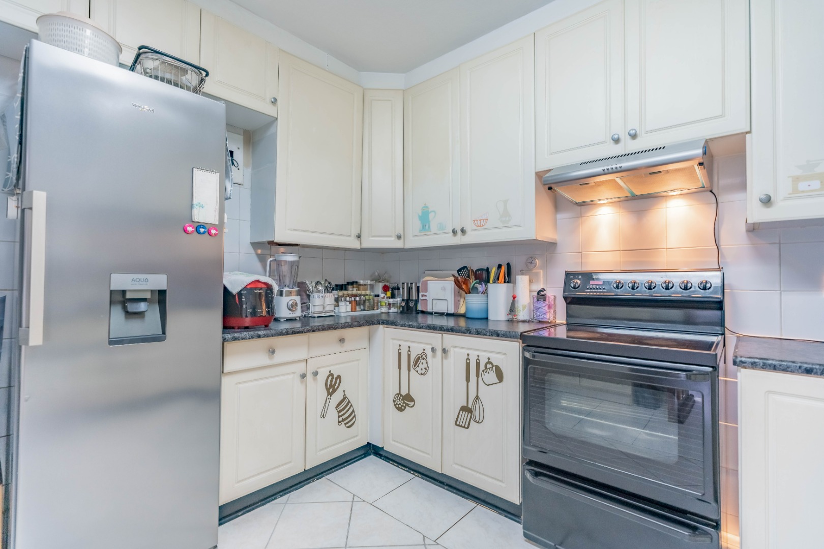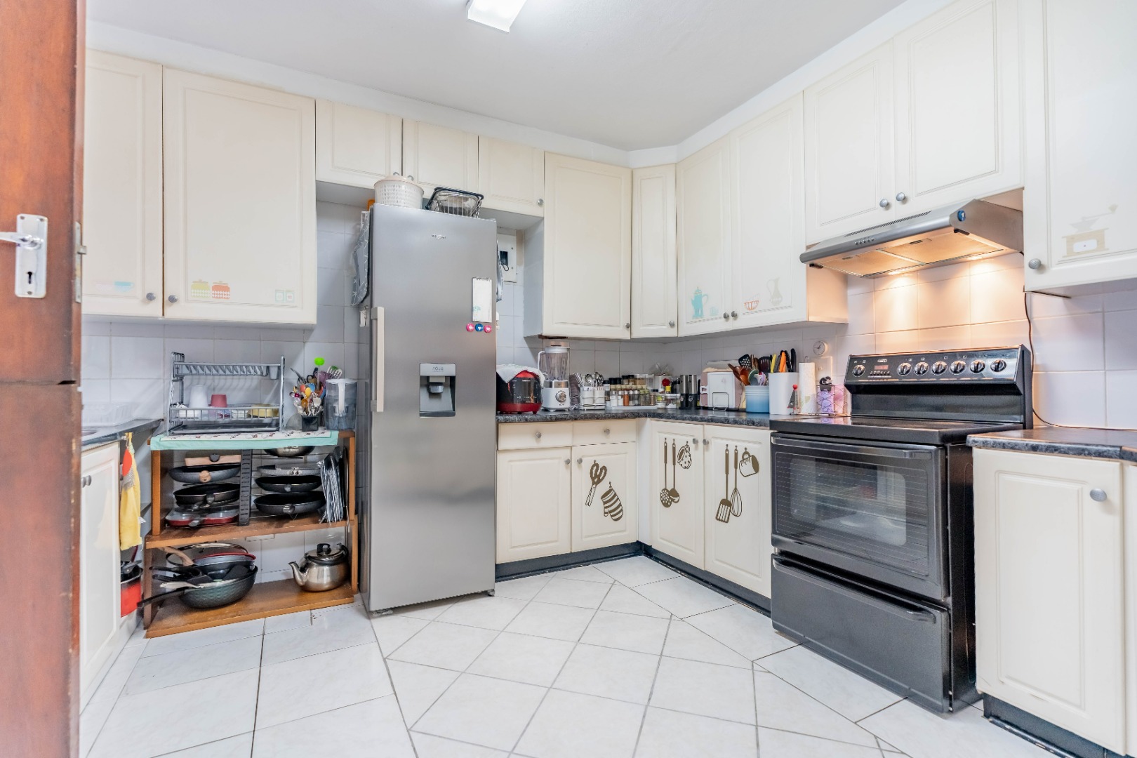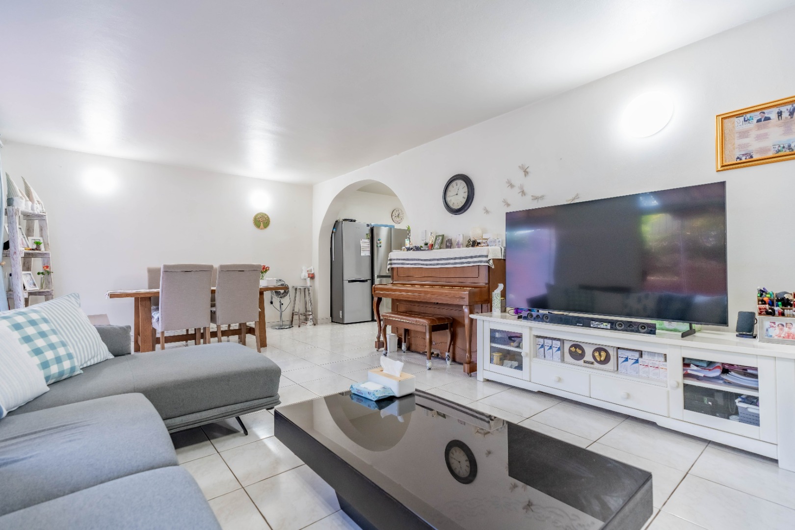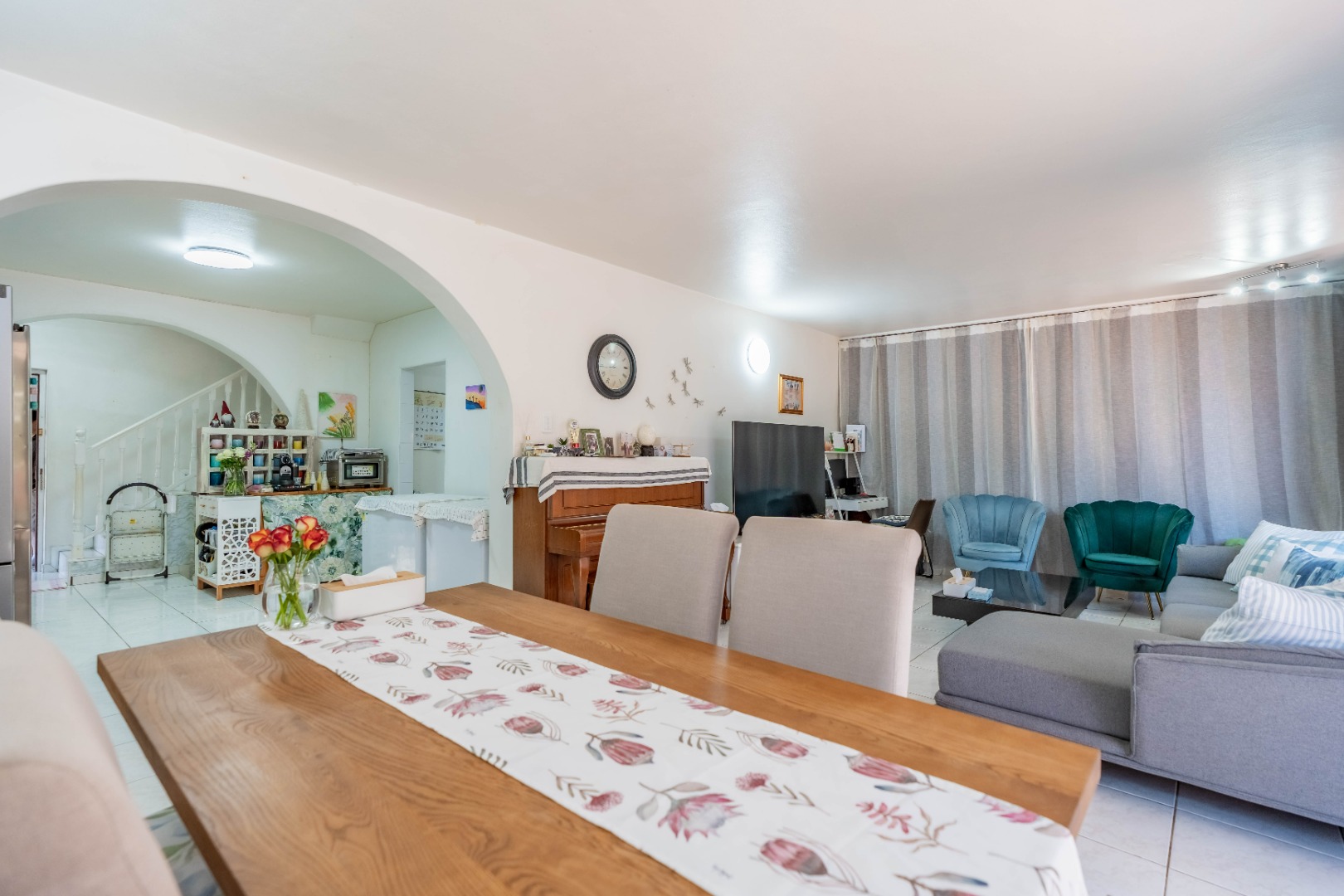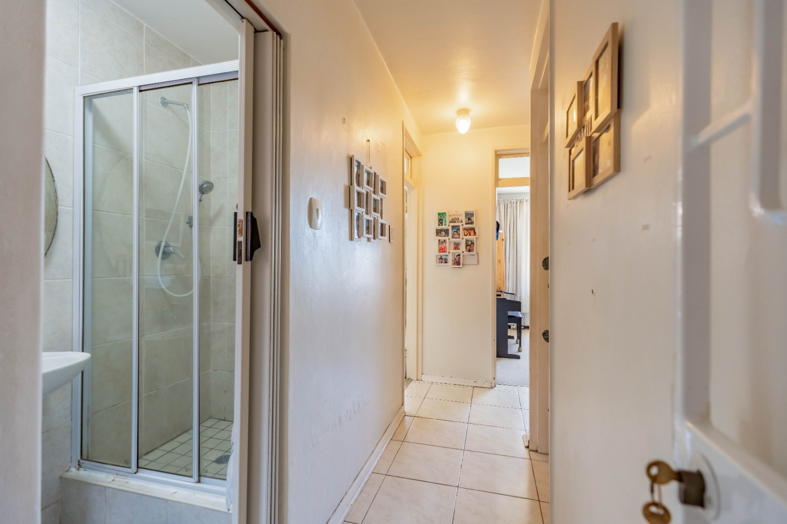 As you enter the property, you are welcomed by a functional, fully fitted kitchen with tiled floors and walls, built-in cupboards, an extractor fan, and a movable stove. The kitchen flows seamlessly into the open-plan dining and lounge area, creating a warm and inviting living space.