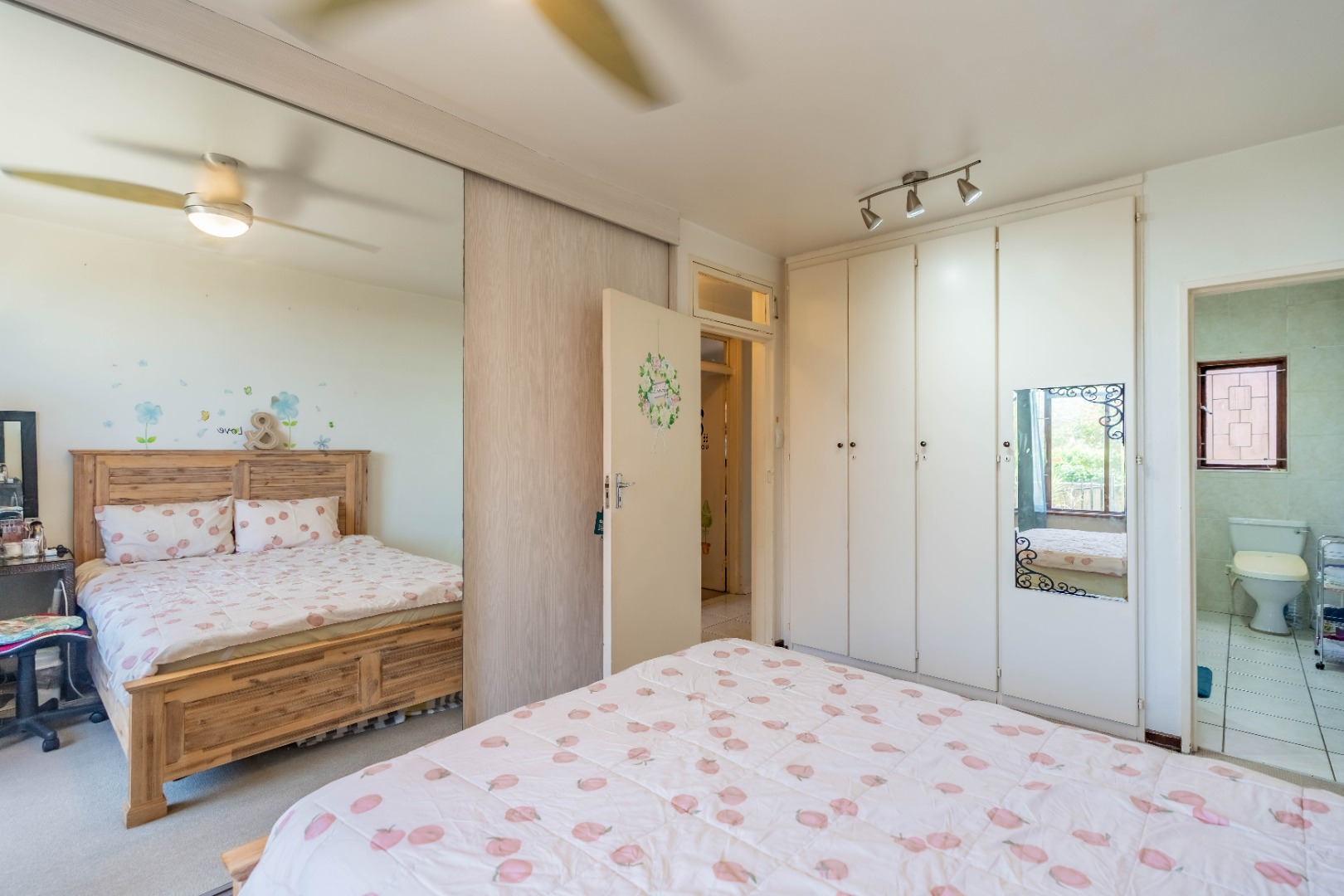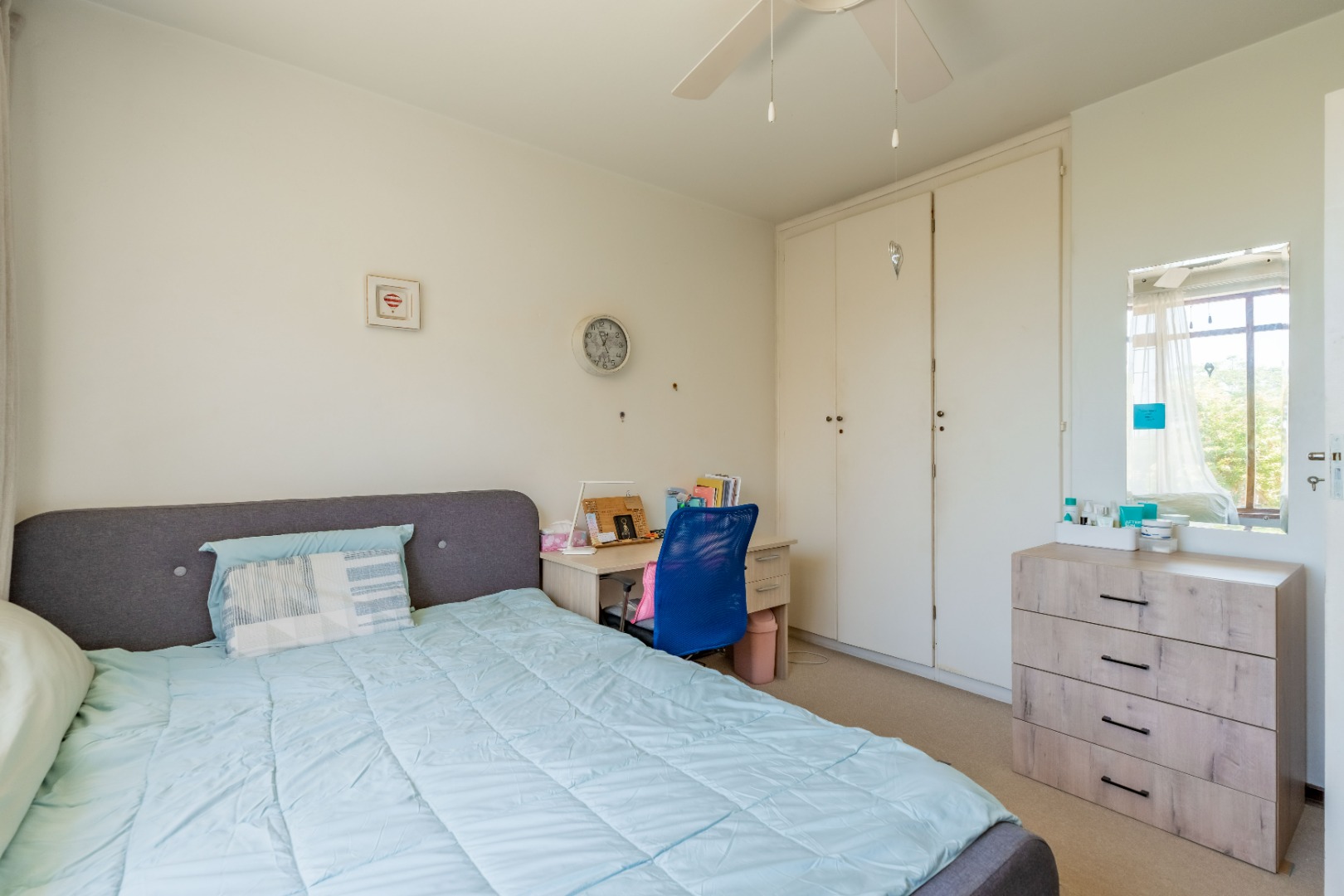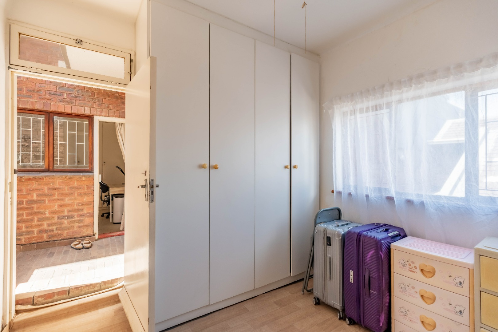 Upstairs, you will find three spacious bedrooms, all fitted with built-in cupboards. The main bedroom features its own private ensuite bathroom. There is also an additional room that can be used as a study, work-from-home office, or extra storage space.
