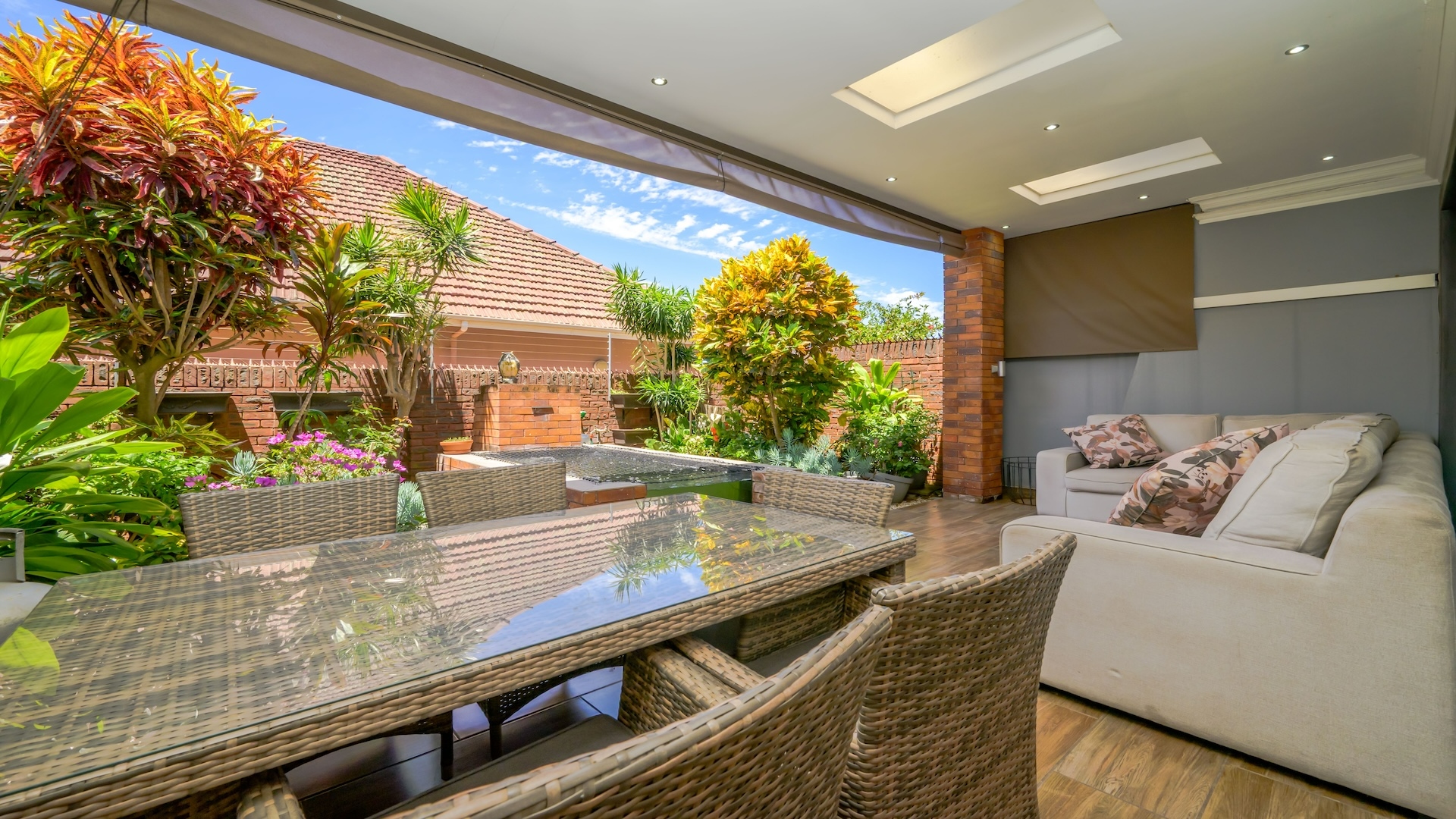 The dining area is ideal for evening dinners and opens into a spacious lounge with a striking feature ceiling and a tasteful mix of brick-tiled feature walls. From the dining area, sliding doors lead to a semi-covered, tiled patio—perfect for entertaining guests—while the private garden offers a tranquil retreat after a long day. Upstairs, the home features three spacious bedrooms, all with built-in cupboards and laminate flooring. The main bedroom includes a well-appointed en-suite bathroom with a shower, basin, and toilet. The main bedroom is airconditioned. Sea views from two rooms. The family bathroom upstairs is fully tiled and fitted with a shower, basin, and toilet. A guest loo is conveniently located downstairs for added comfort. One garage and a parking behind. This exceptional property combines style, functionality, and an unbeatable location, making it an ideal place to call home.