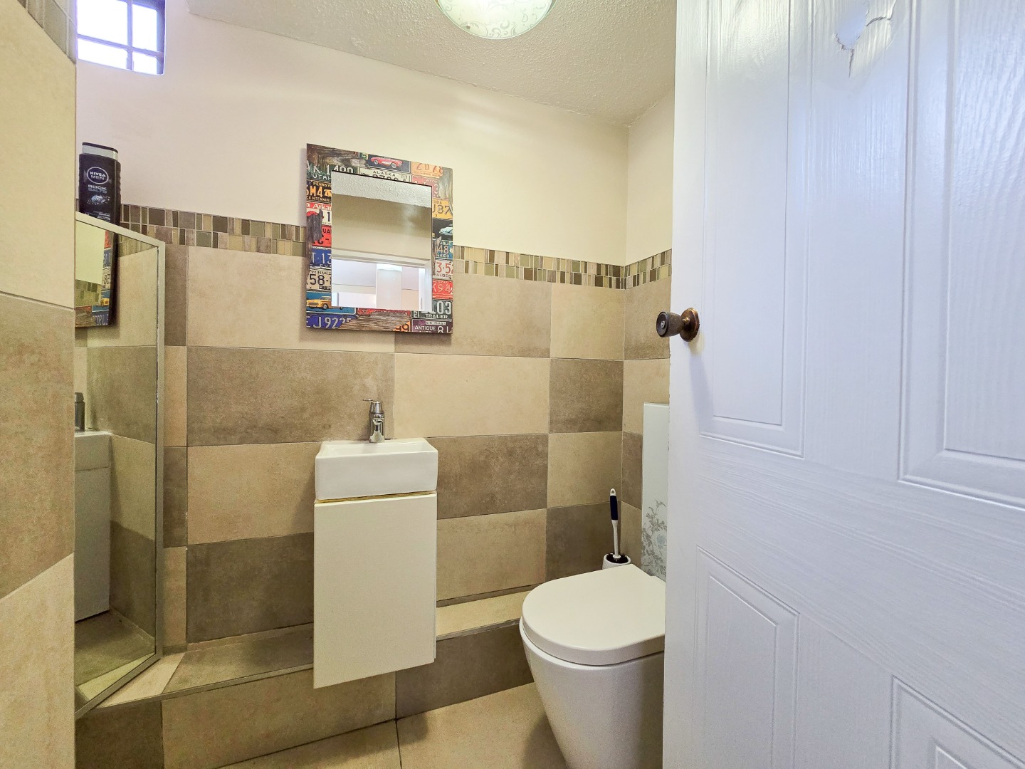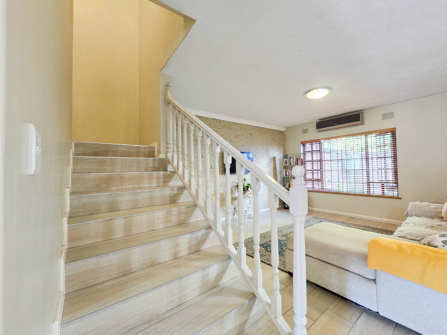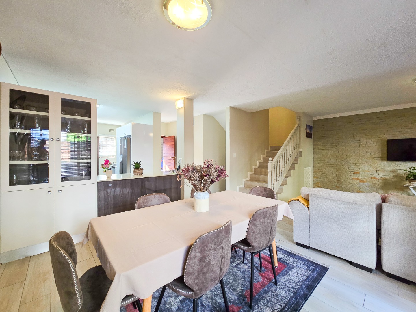 Downstairs, a revamped guest loo adds convenience to the living space. Ascend the stairs to find three bedrooms, including a master suite that has carpeted flooring and built in cupboards with a luxurious ensuite bathroom. The ensuite bathroom boasts a full suite of amenities, including a toilet, basin, bathtub, and shower, all finished to perfection. A family bathroom on this level offers a shower, along with a toilet and basin, providing comfort and convenience for all residents. Airconditioned throughout and nicely tiled floors. Outside, a scullery or washing area ensures practicality in household chores. Parking is provided with a garage and an open bay, both accessible via remote-controlled gates for added security. The complex is further safeguarded by electric fencing, offering peace of mind to residents.
