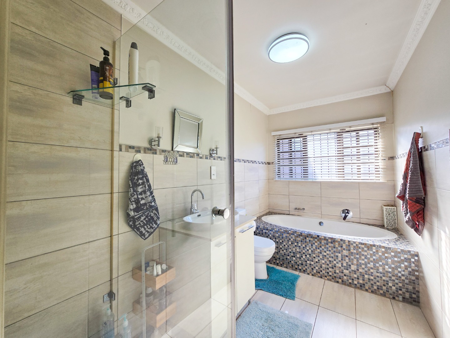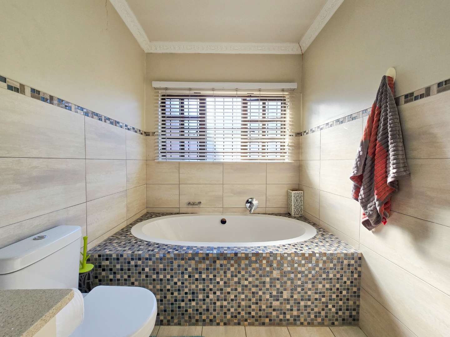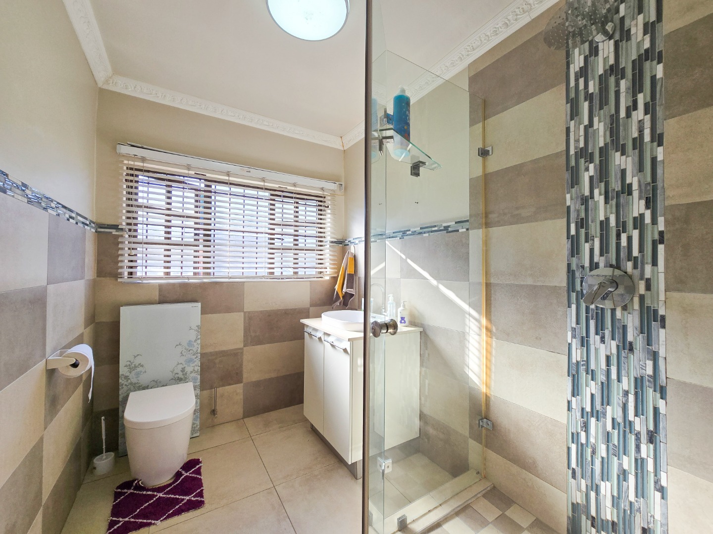 Downstairs, a revamped guest loo adds convenience to the living space. Ascend the stairs to find three bedrooms, including a master suite that has carpeted flooring and built in cupboards with a luxurious ensuite bathroom. The ensuite bathroom boasts a full suite of amenities, including a toilet, basin, bathtub, and shower, all finished to perfection. A family bathroom on this level offers a shower, along with a toilet and basin, providing comfort and convenience for all residents. Airconditioned throughout and nicely tiled floors. Outside, a scullery or washing area ensures practicality in household chores. Parking is provided with a garage and an open bay, both accessible via remote-controlled gates for added security. The complex is further safeguarded by electric fencing, offering peace of mind to residents.