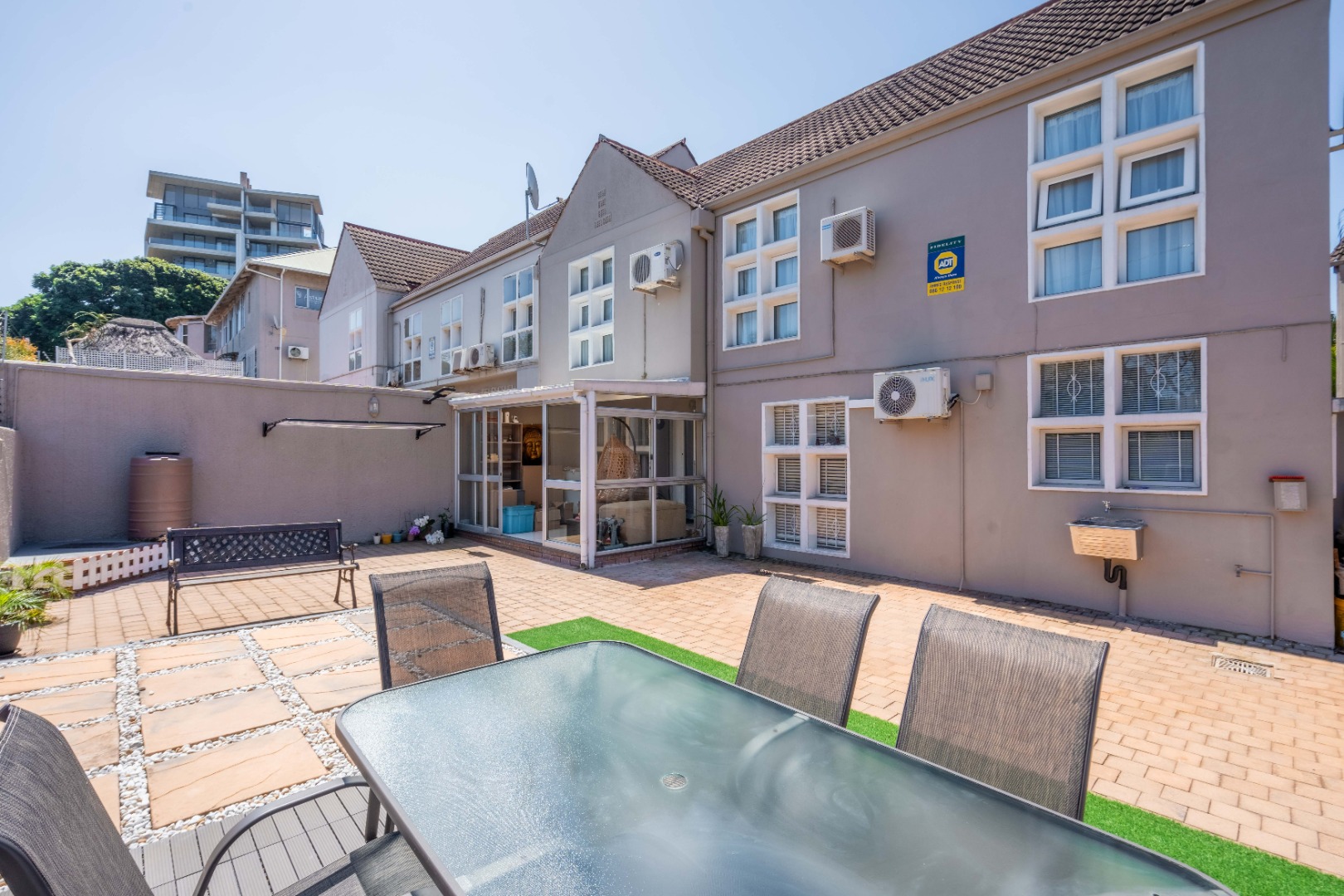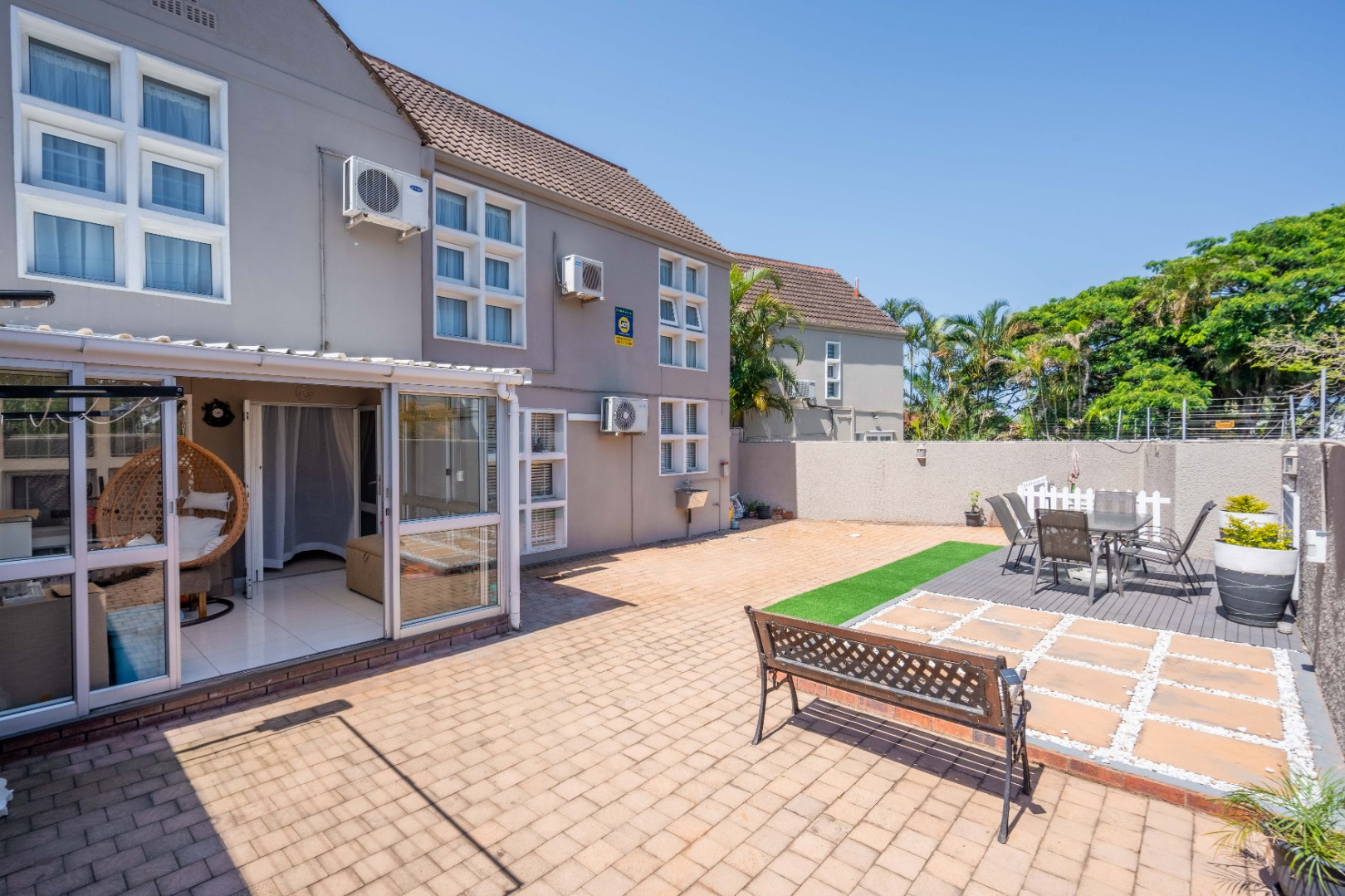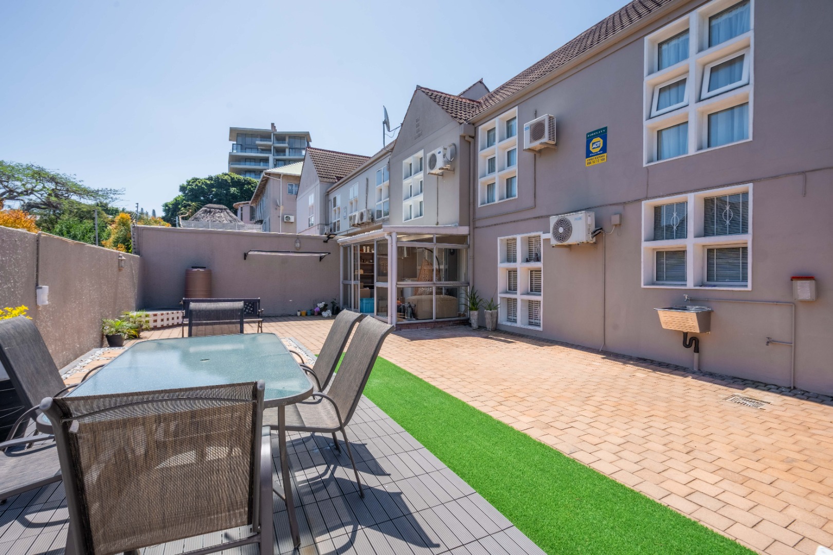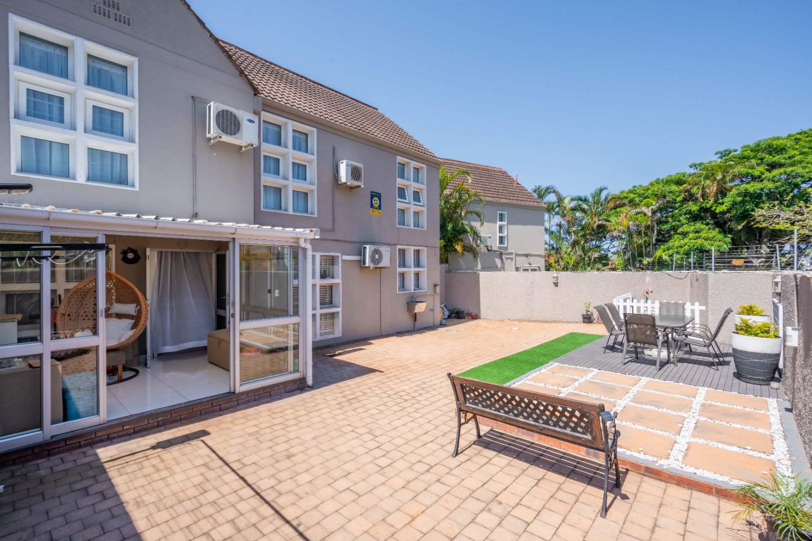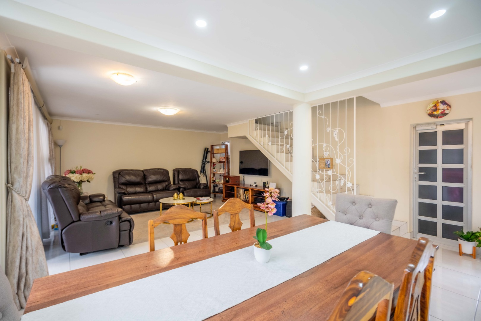 Upstairs, the property offers three spacious bedrooms, all with built-in cupboards. The fully tiled family bathroom includes a shower, basin, and toilet. The main bedroom boasts generous cupboard space, tiled flooring, and a full en-suite bathroom with a shower, basin, toilet, and bathtub. The second bedroom features high-gloss wooden cupboards. Additional features include electric fencing around the complex, a double garage, air conditioning in all bedrooms, and CCTV cameras. The property is conveniently located close to top restaurants on Florida Road and within walking distance of excellent schools such as Clifton, DPHS, and Gordon Girls.