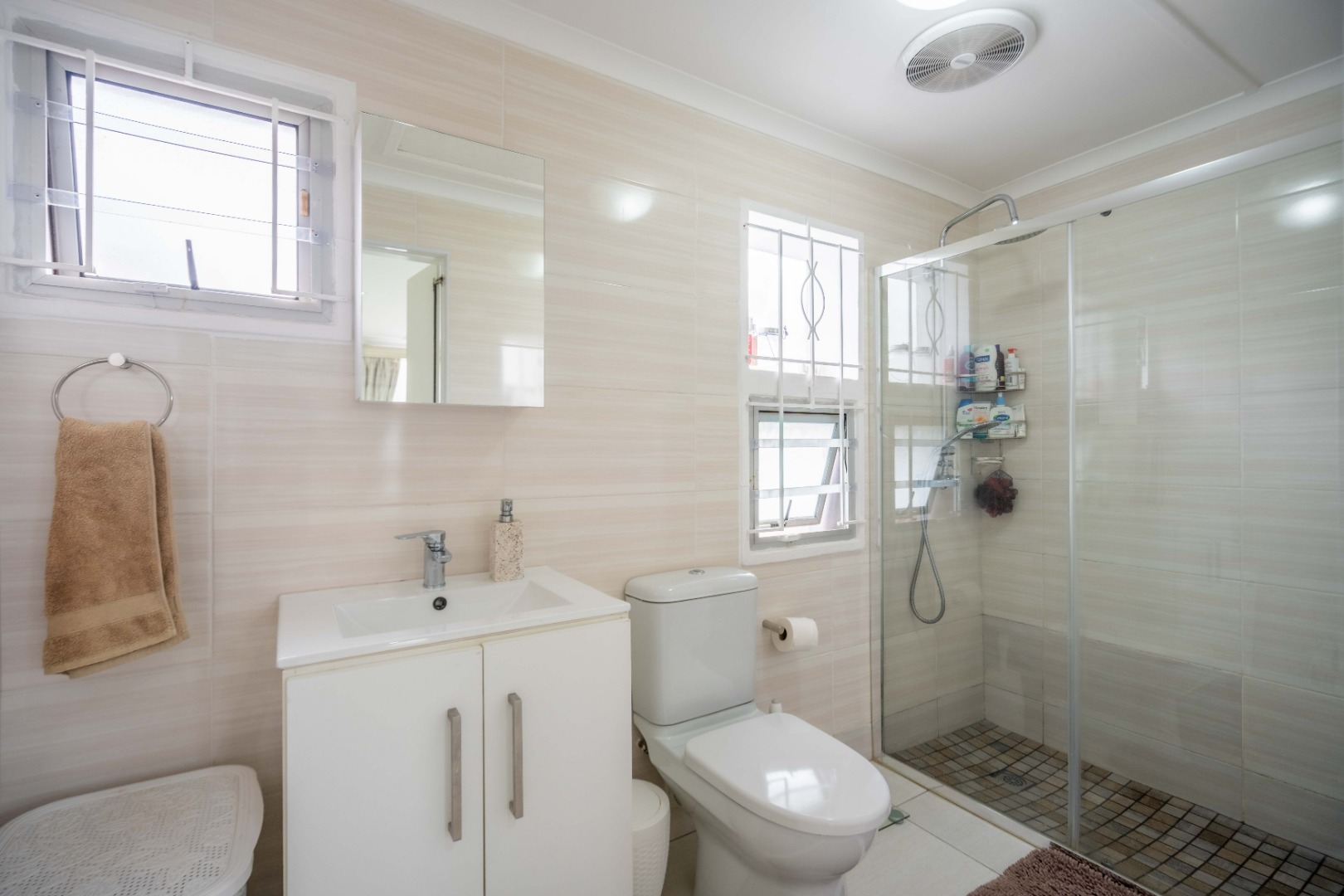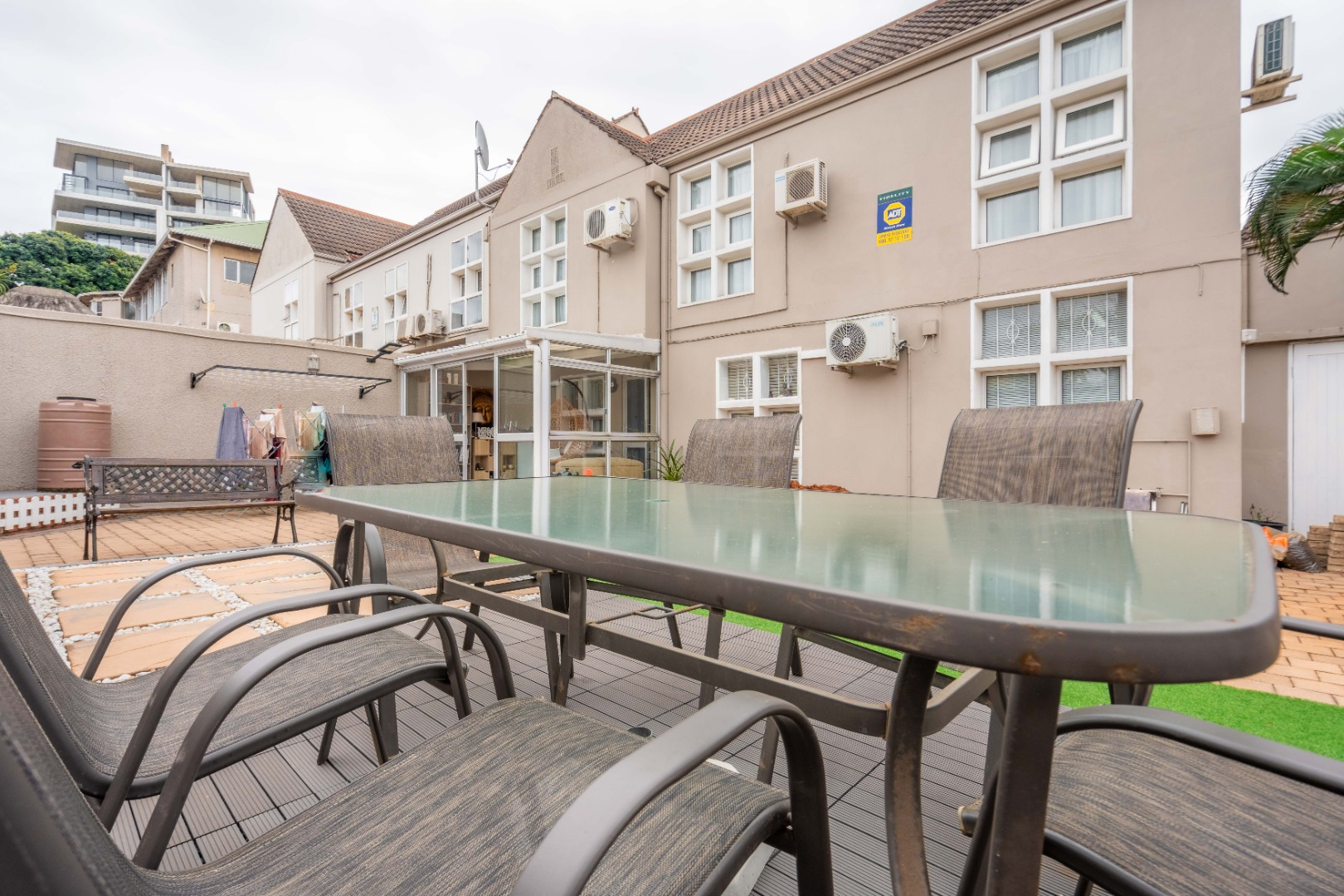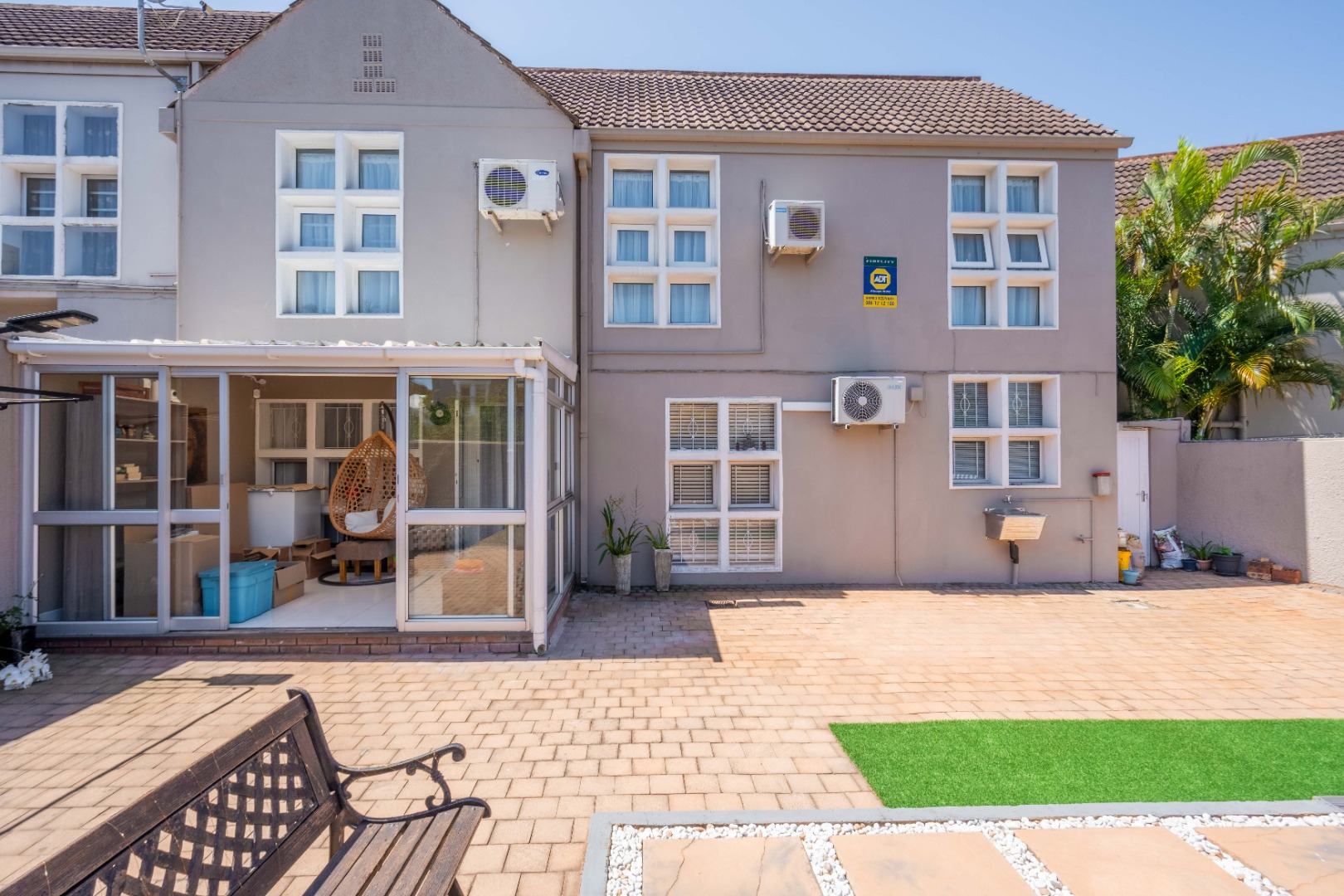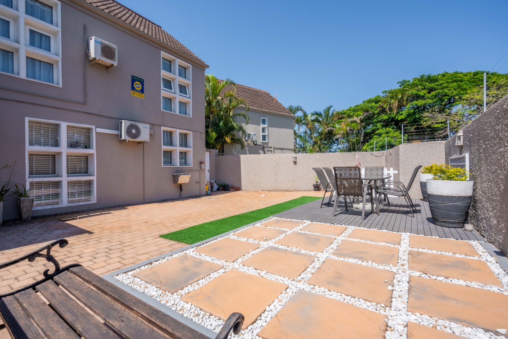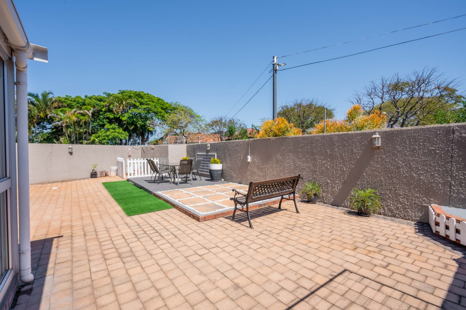 Upstairs, the property offers three spacious bedrooms, all with built-in cupboards. The fully tiled family bathroom includes a shower, basin, and toilet. The main bedroom boasts generous cupboard space, tiled flooring, and a full en-suite bathroom with a shower, basin, toilet, and bathtub. The second bedroom features high-gloss wooden cupboards. Additional features include electric fencing around the complex, a double garage, air conditioning in all bedrooms, and CCTV cameras. The property is conveniently located close to top restaurants on Florida Road and within walking distance of excellent schools such as Clifton, DPHS, and Gordon Girls.