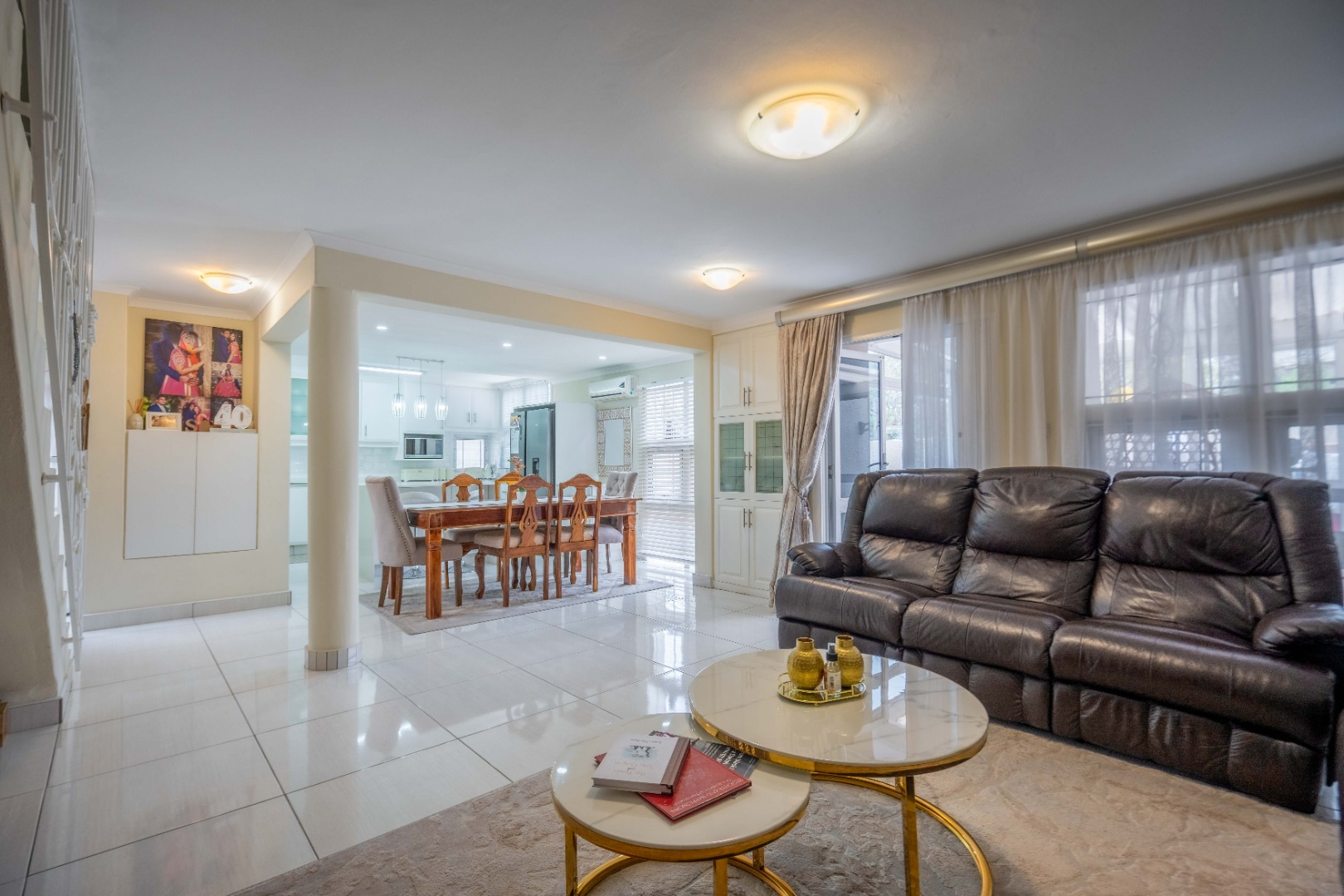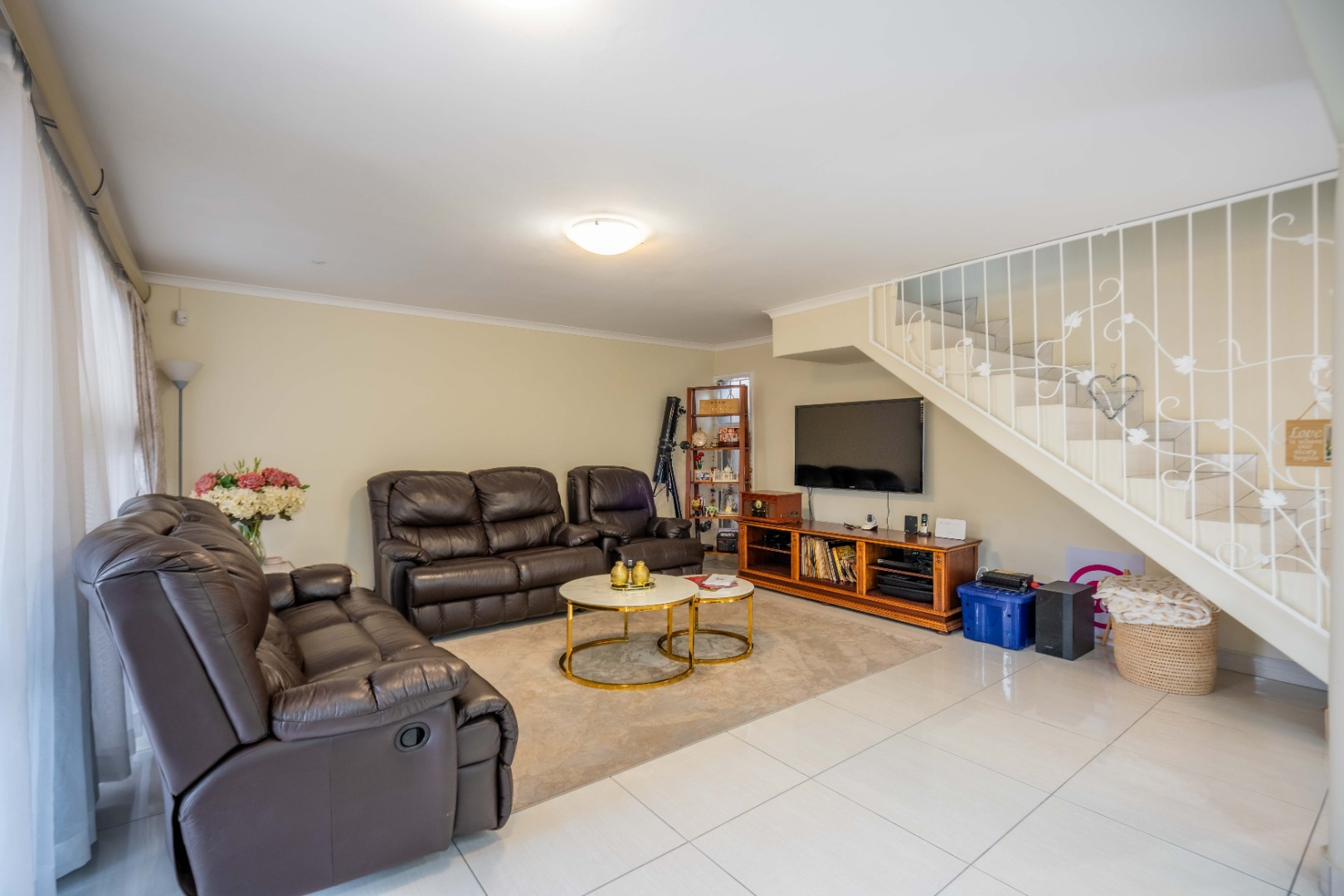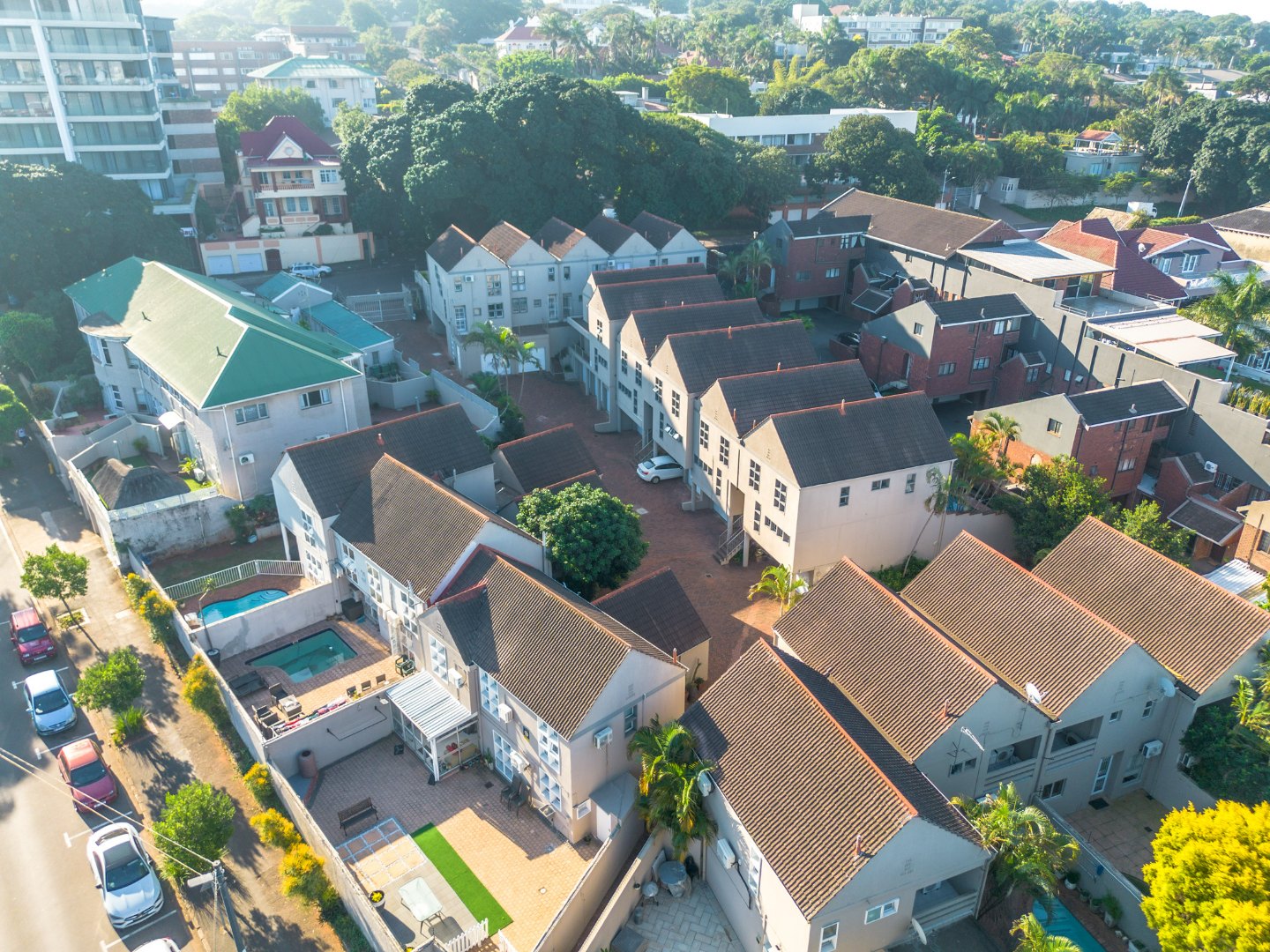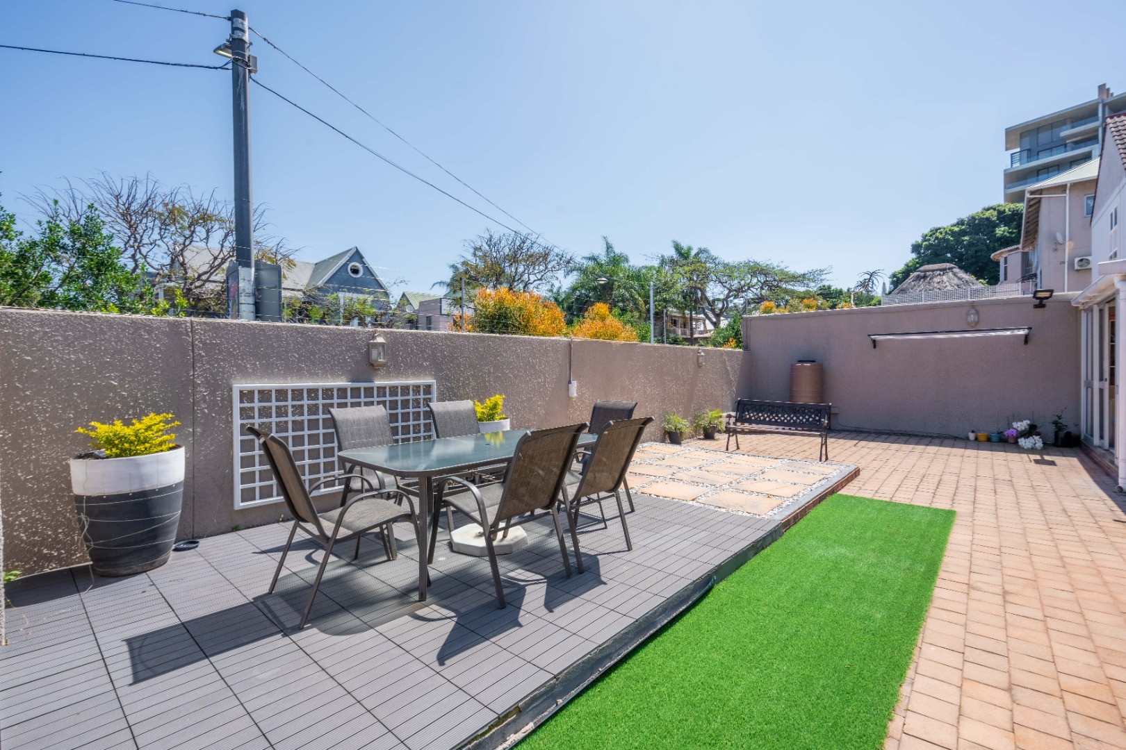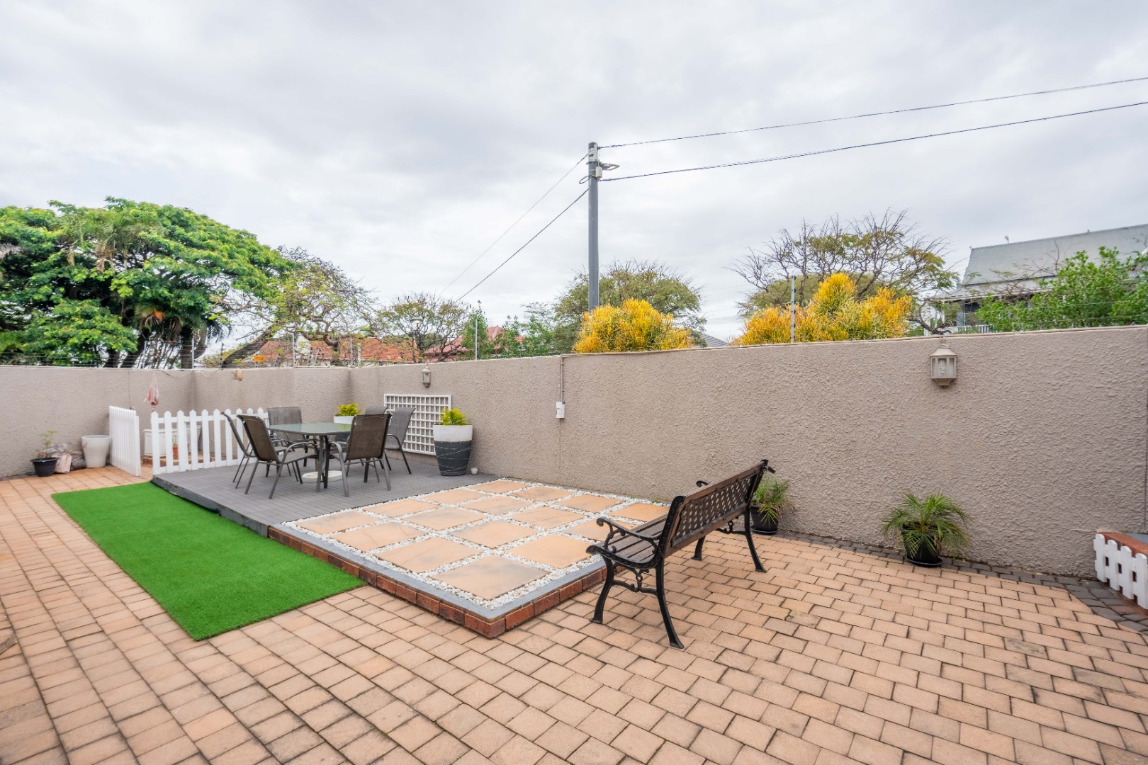 Upstairs, the property offers three spacious bedrooms, all with built-in cupboards. The fully tiled family bathroom includes a shower, basin, and toilet. The main bedroom boasts generous cupboard space, tiled flooring, and a full en-suite bathroom with a shower, basin, toilet, and bathtub. The second bedroom features high-gloss wooden cupboards. Additional features include electric fencing around the complex, a double garage, air conditioning in all bedrooms, and CCTV cameras. The property is conveniently located close to top restaurants on Florida Road and within walking distance of excellent schools such as Clifton, DPHS, and Gordon Girls.