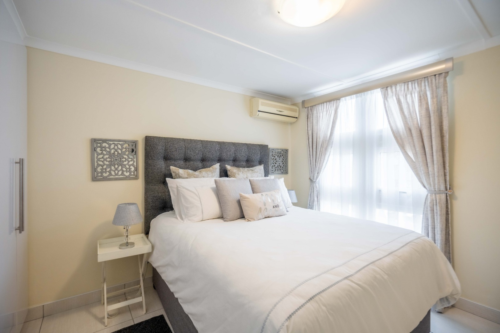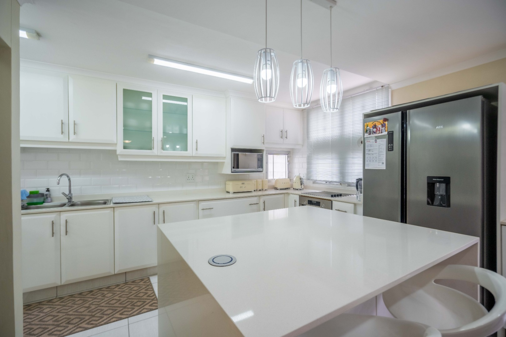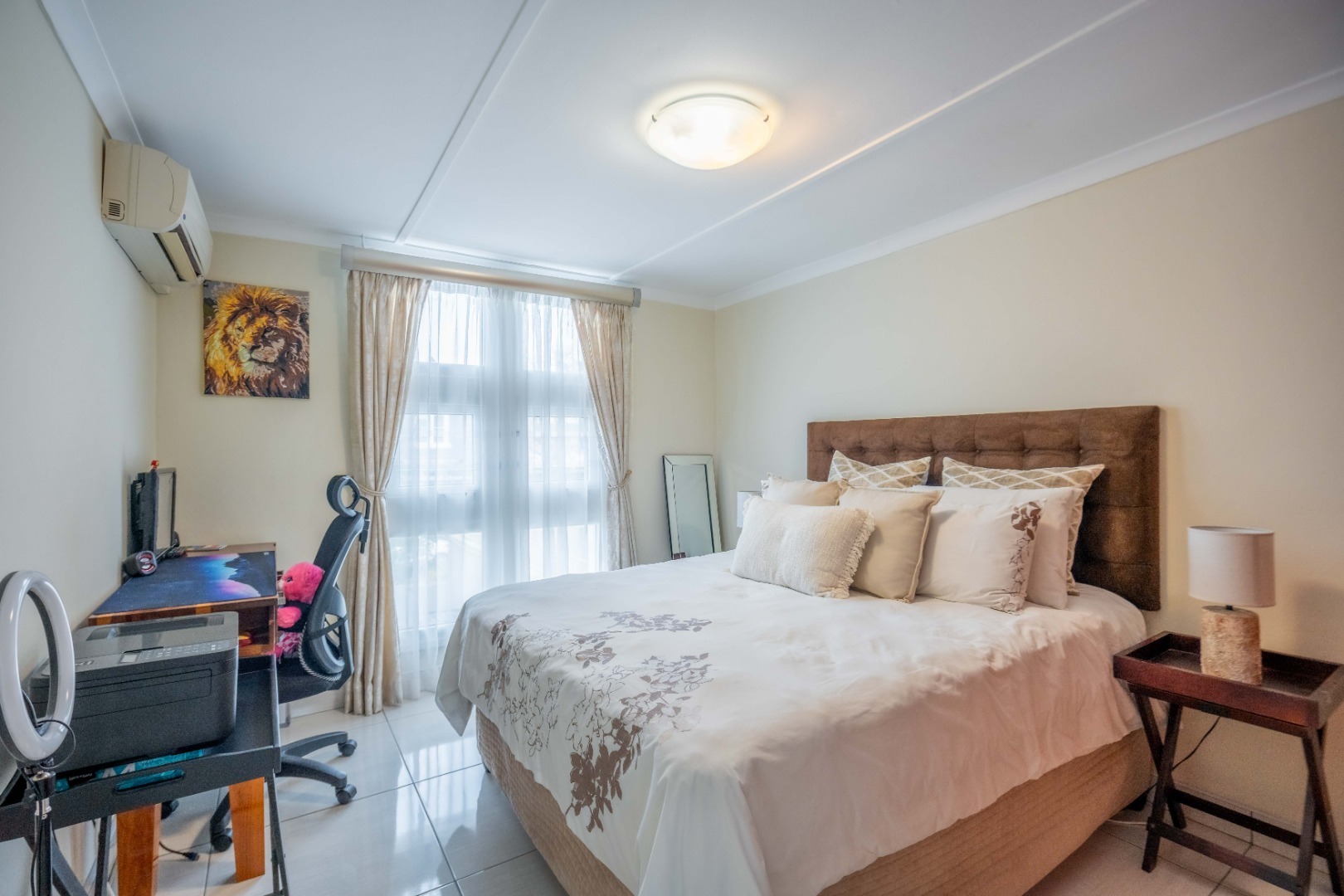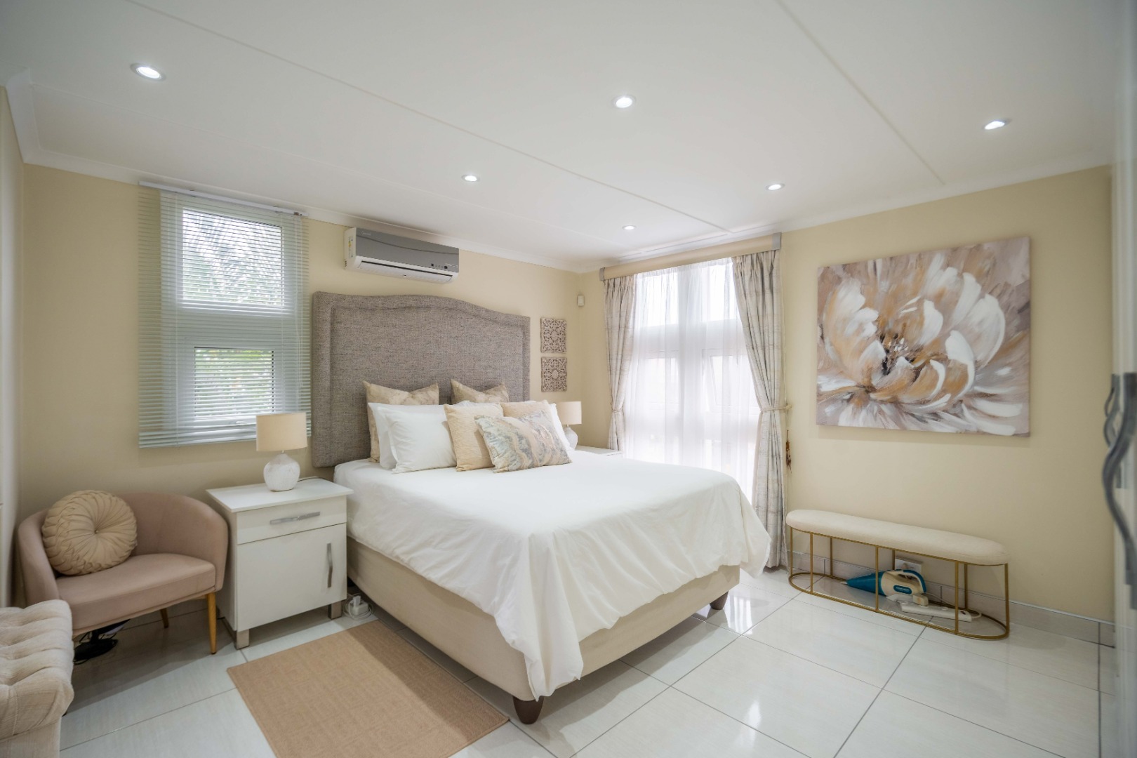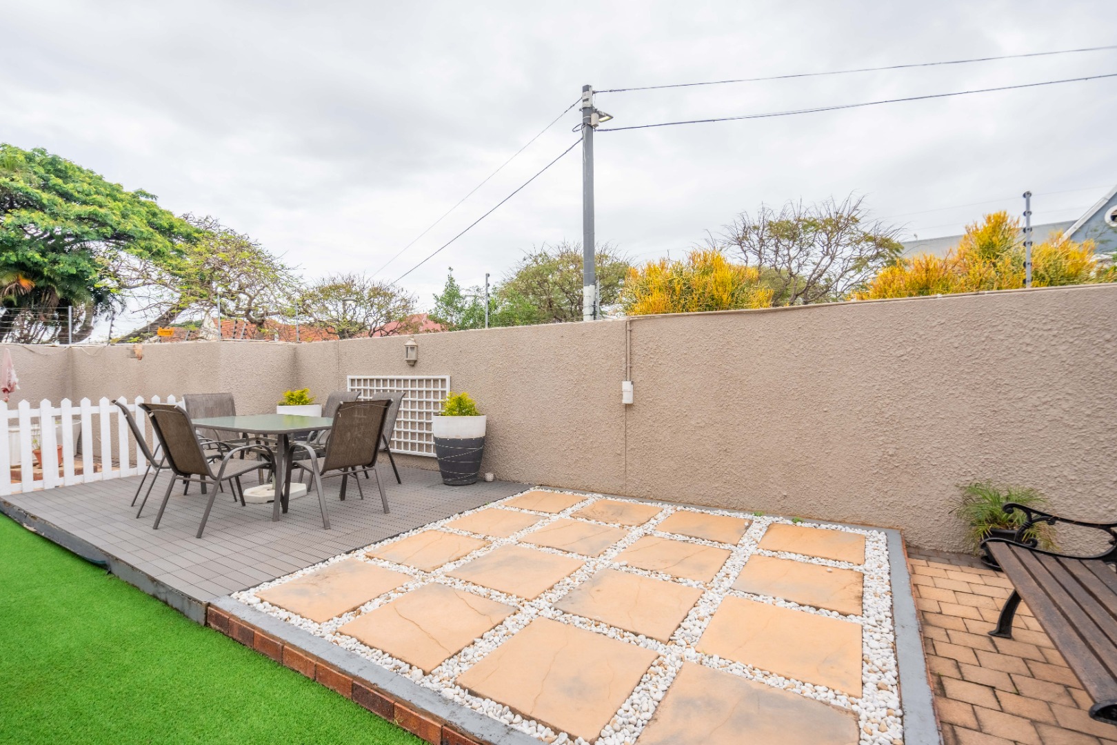 Upstairs, the property offers three spacious bedrooms, all with built-in cupboards. The fully tiled family bathroom includes a shower, basin, and toilet. The main bedroom boasts generous cupboard space, tiled flooring, and a full en-suite bathroom with a shower, basin, toilet, and bathtub. The second bedroom features high-gloss wooden cupboards. Additional features include electric fencing around the complex, a double garage, air conditioning in all bedrooms, and CCTV cameras. The property is conveniently located close to top restaurants on Florida Road and within walking distance of excellent schools such as Clifton, DPHS, and Gordon Girls.