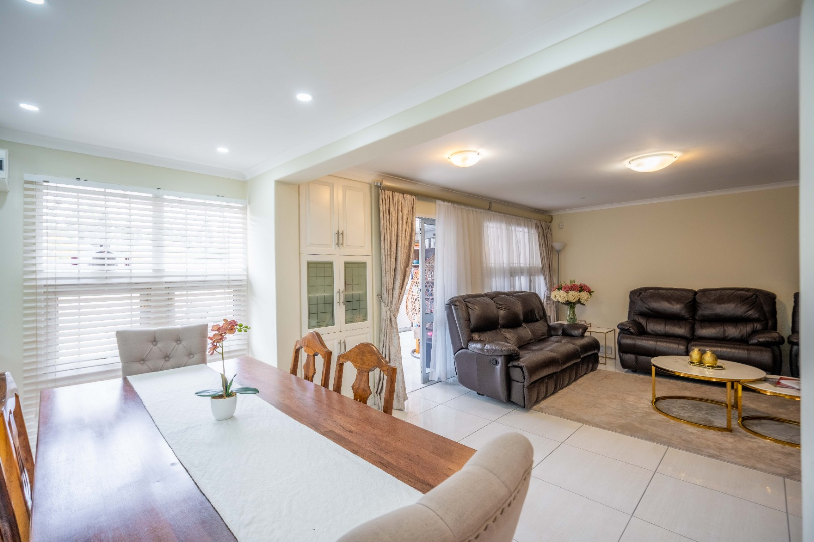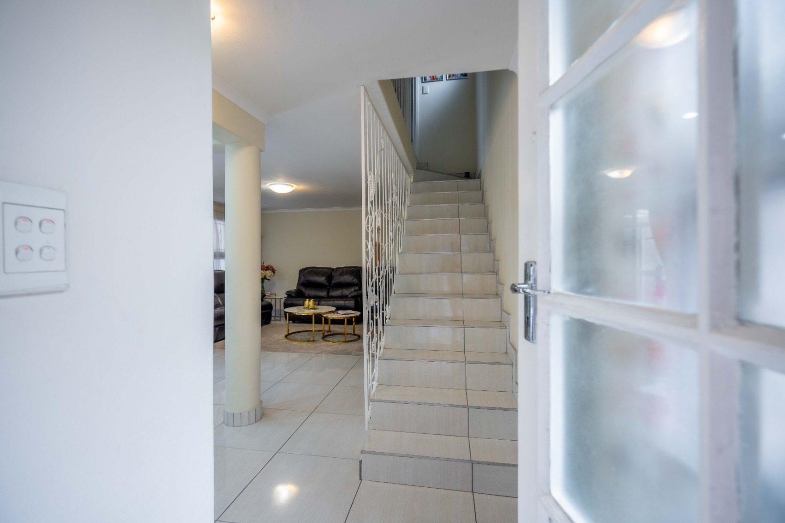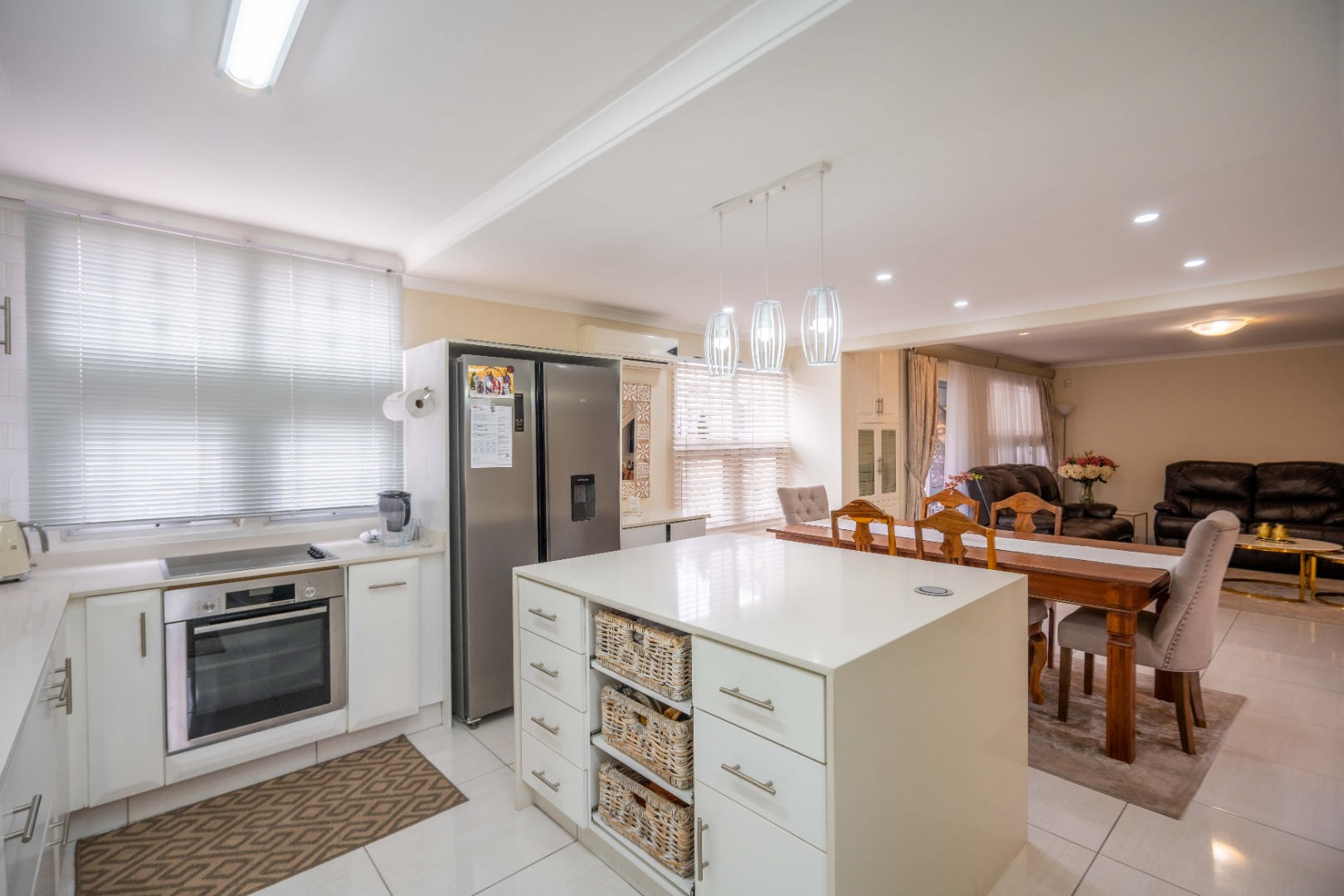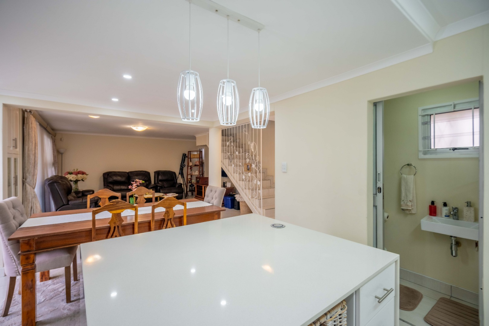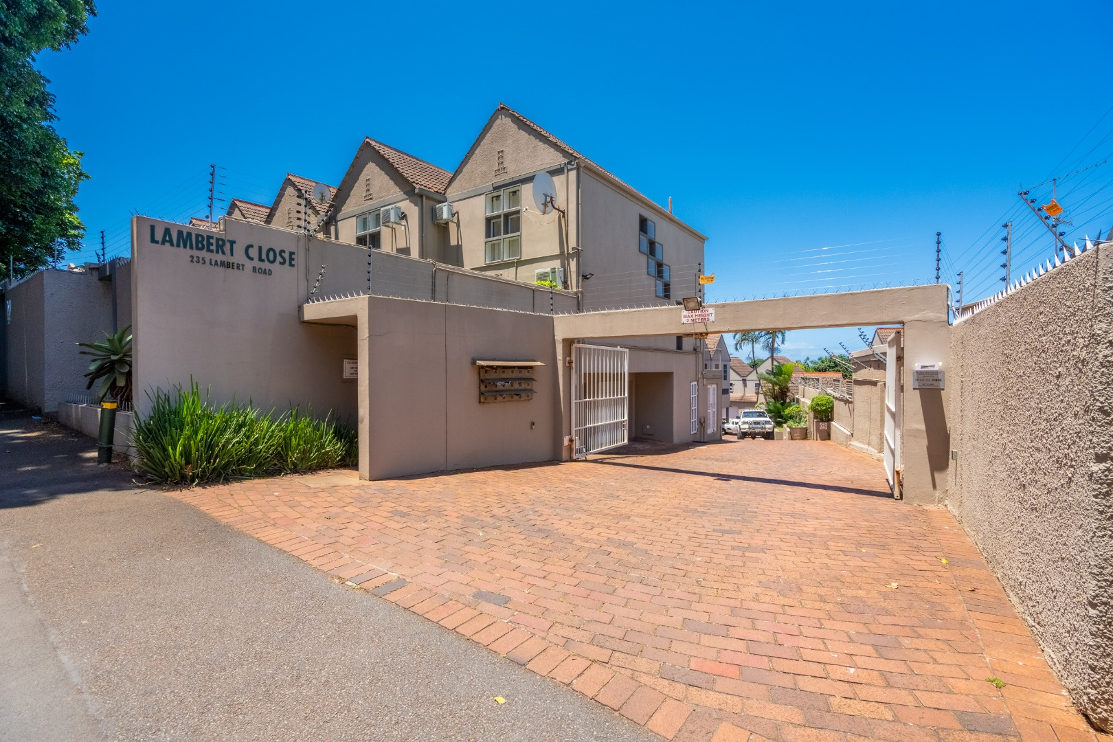 Stunning property with modern finishes, located in a safe and secure complex on Lambert Road. This home offers the perfect lock-up-and-go lifestyle. Upon entry, you are welcomed into an open-plan kitchen, dining area, and lounge. The kitchen features a centre island, Caesarstone countertops, space for a double-door fridge, and ample cupboard space. The kitchen flows seamlessly into the dining area and spacious lounge, which opens onto an aluminium-enclosed patio with sliding doors leading to a large courtyard—ideal for entertaining guests. A guest toilet is conveniently located downstairs.
