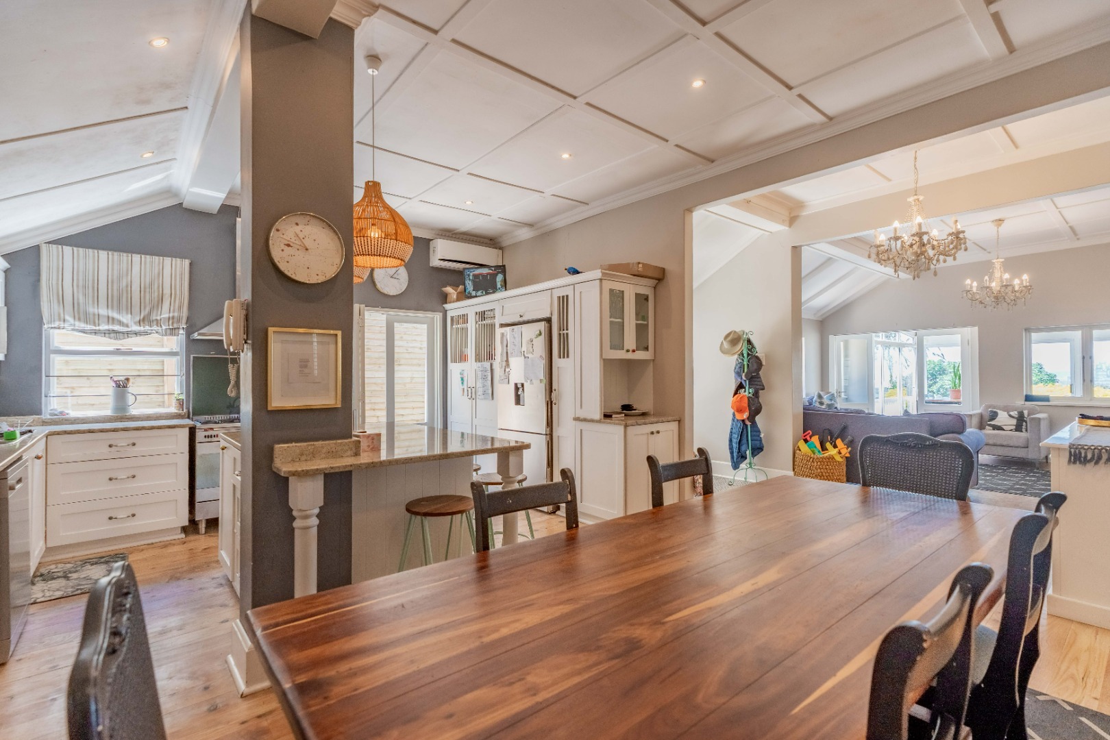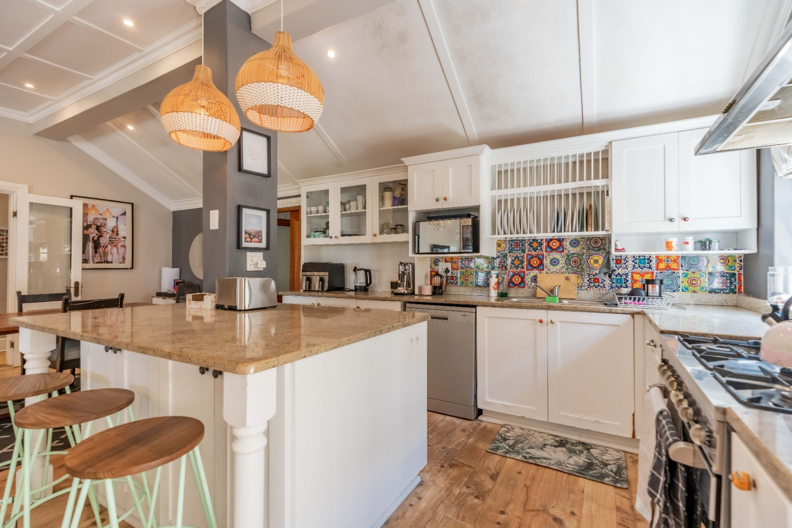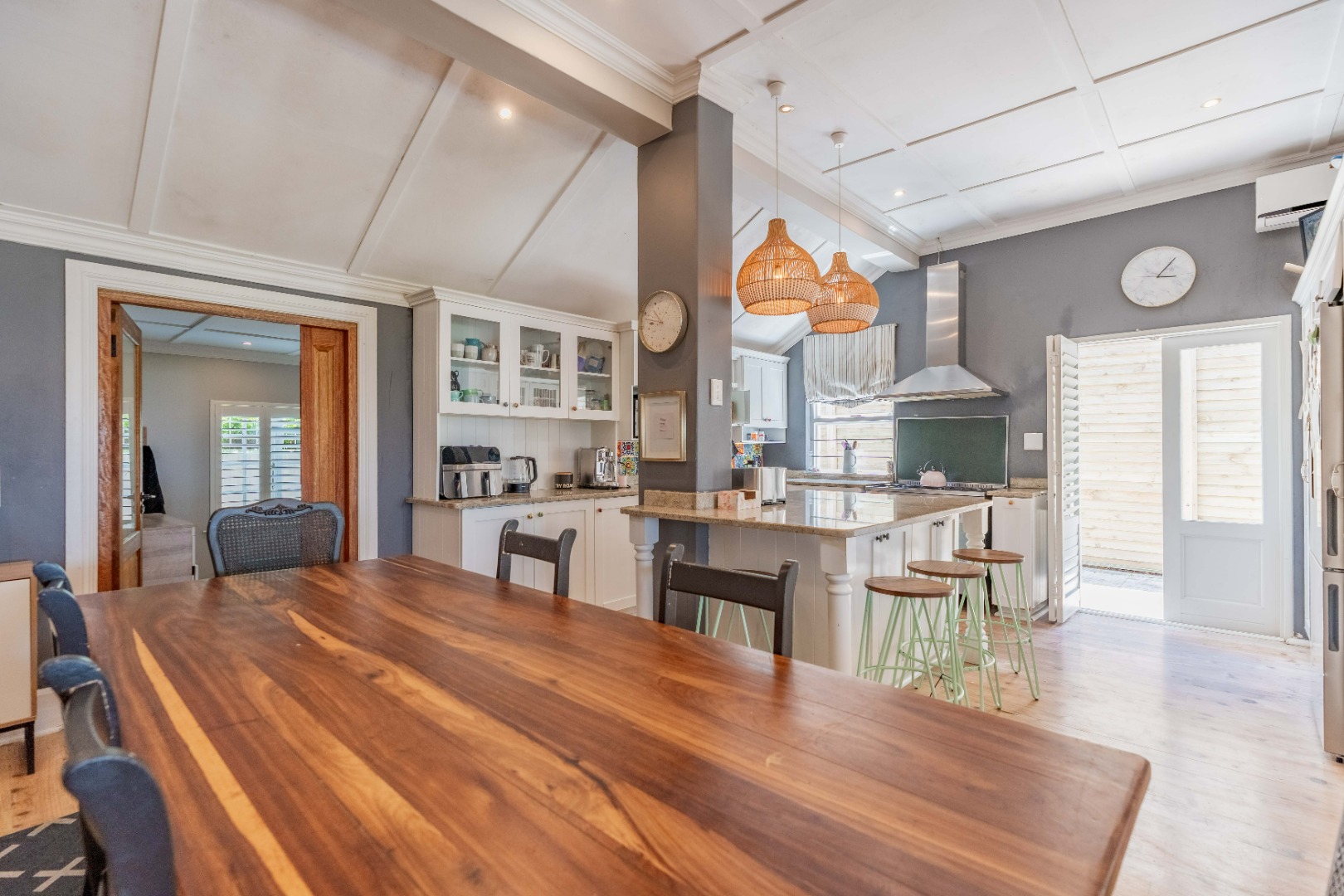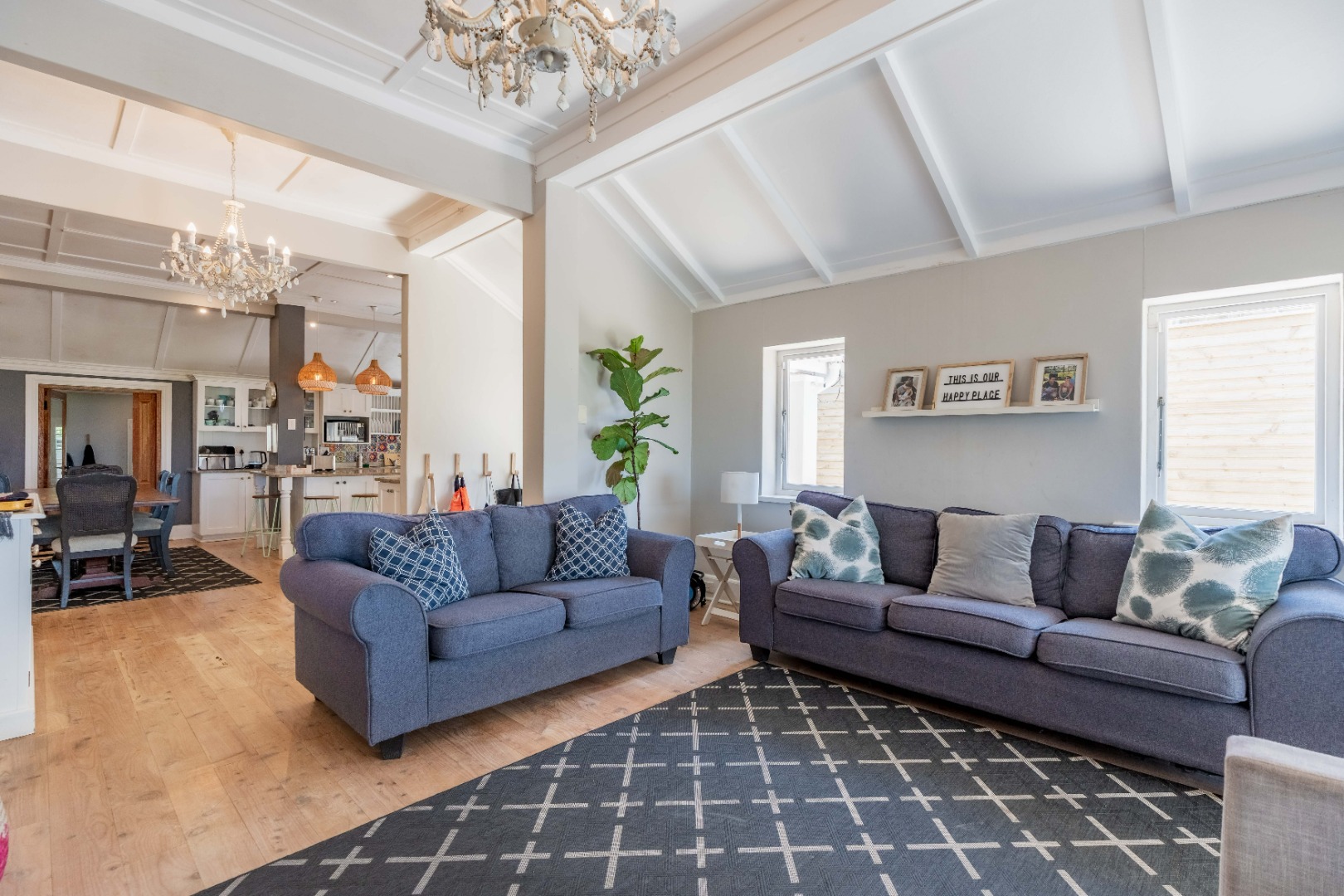 The interior features an inviting open-plan design, seamlessly connecting the living spaces. The heart of the home is a modern kitchen, equipped with white cabinetry, granite countertops, a large central island with seating, and a vibrant tiled backsplash. Further enhanced by vaulted ceilings, woven pendant lighting, and air conditioning. Two distinct lounges and two dining areas provide versatile options for relaxation and entertaining, all set on elegant hardwood flooring.