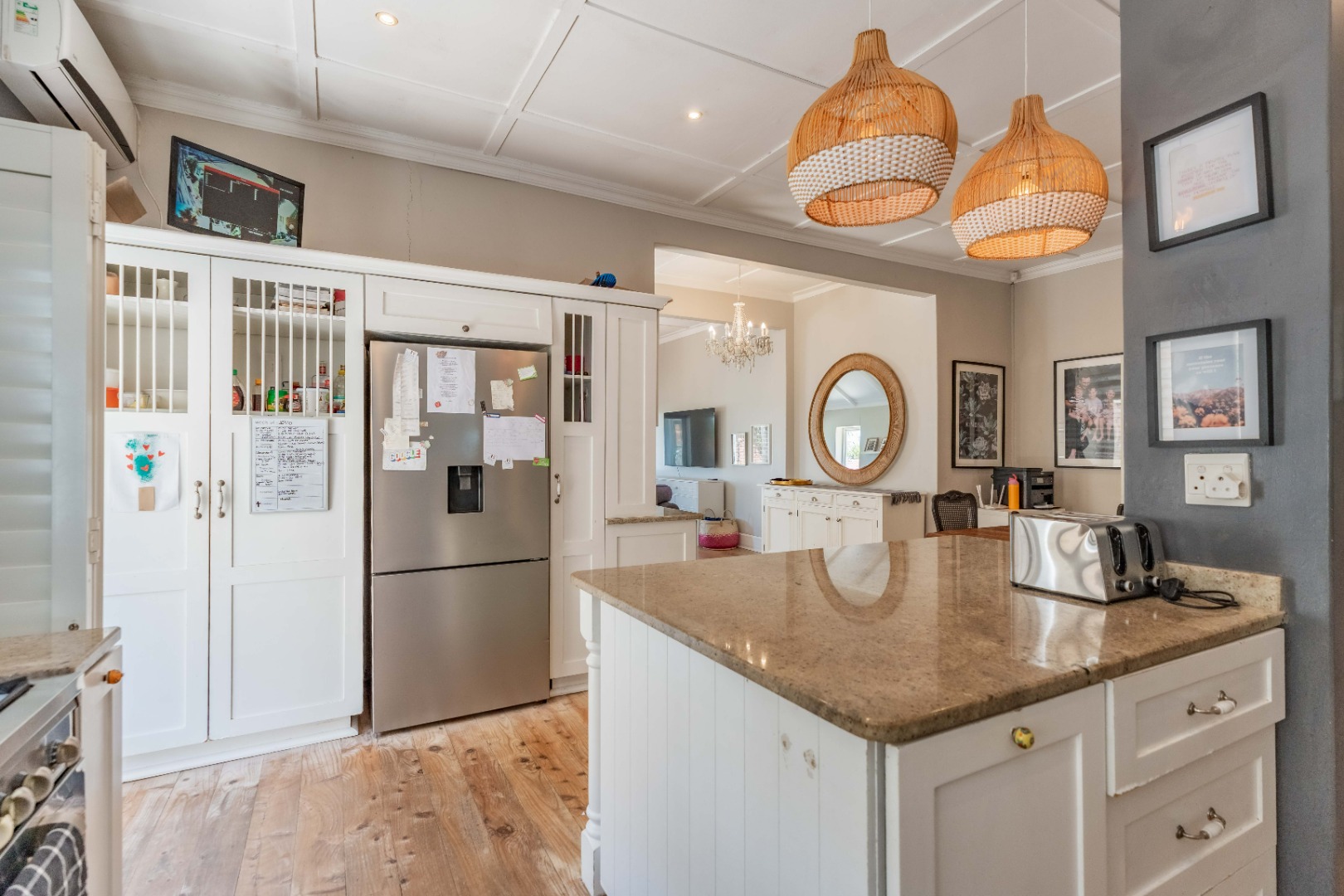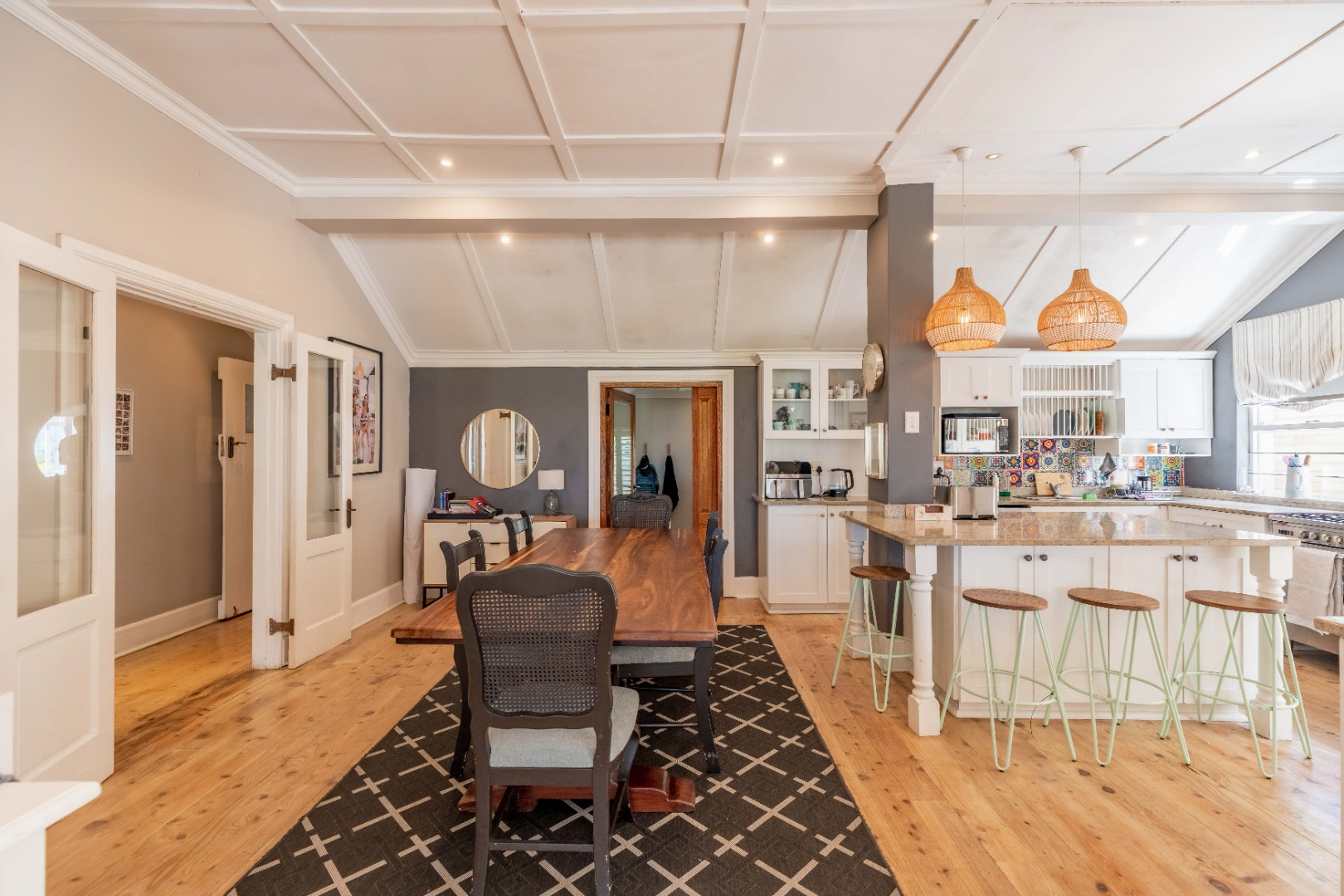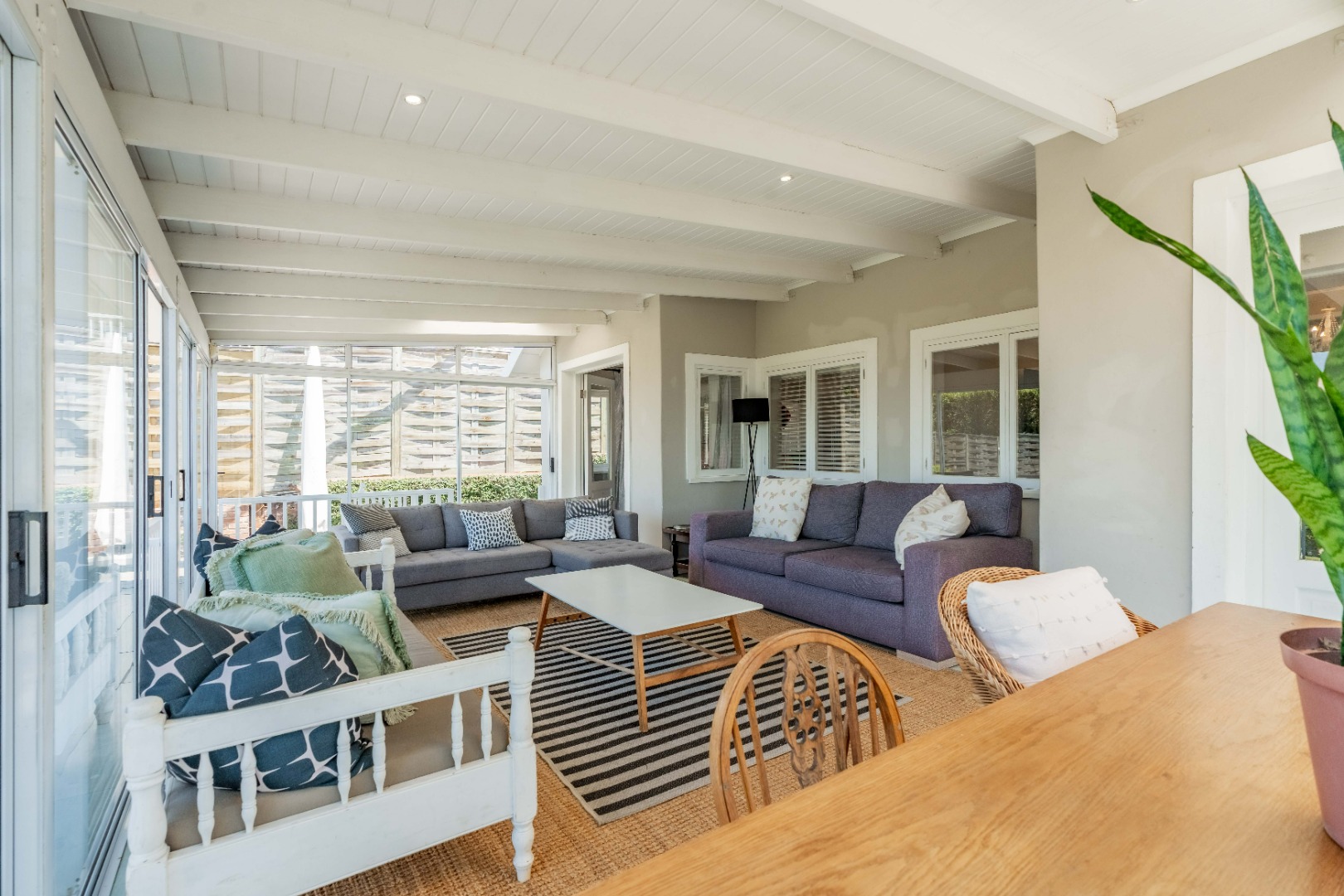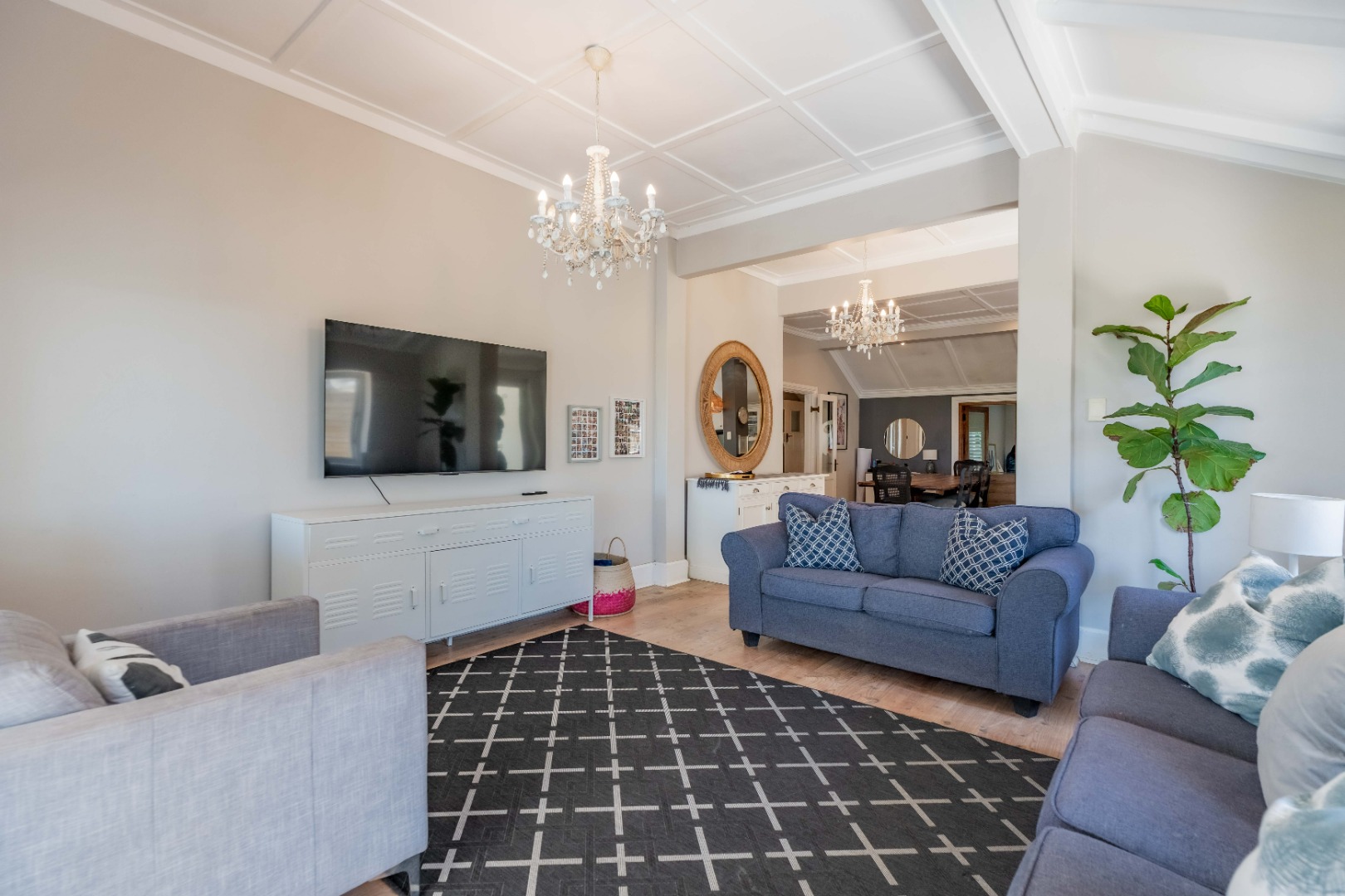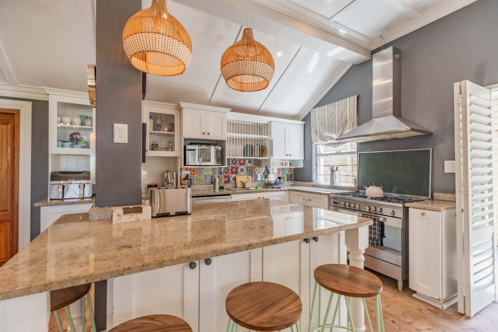The interior features an inviting open-plan design, seamlessly connecting the living spaces. The heart of the home is a modern kitchen, equipped with white cabinetry, granite countertops, a large central island with seating, and a vibrant tiled backsplash. Further enhanced by vaulted ceilings, woven pendant lighting, and air conditioning. Two distinct lounges and two dining areas provide versatile options for relaxation and entertaining, all set on elegant hardwood flooring.