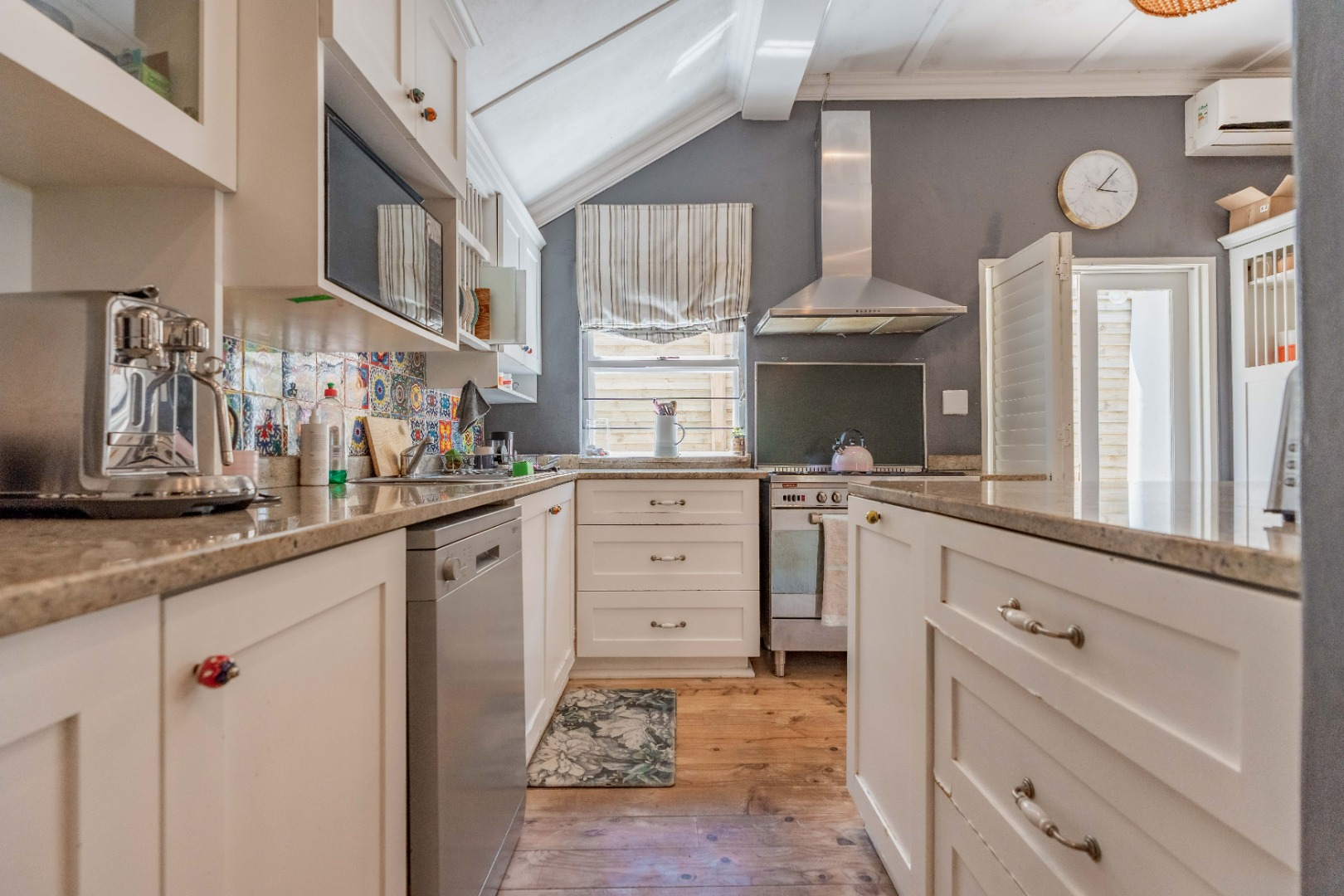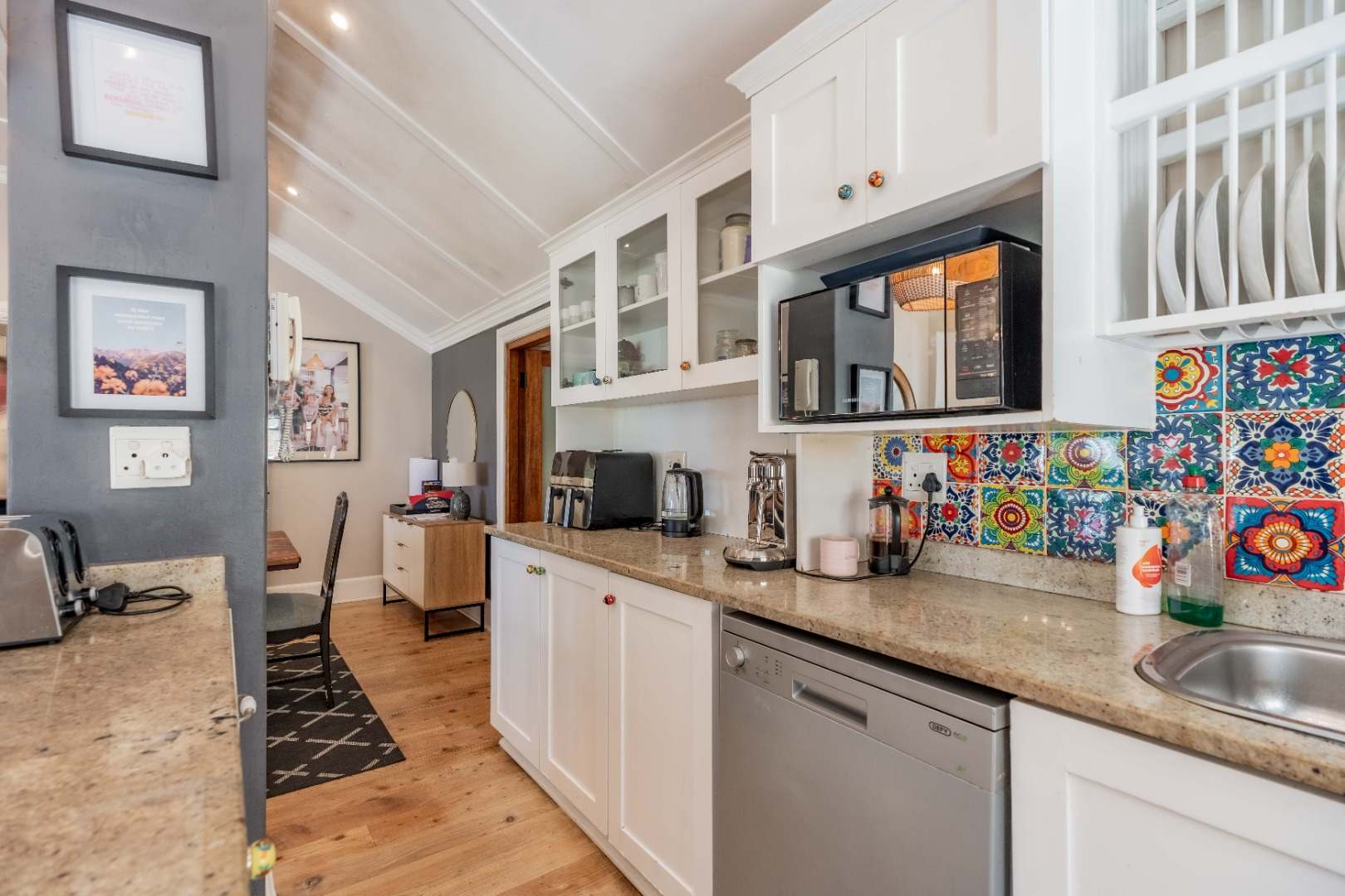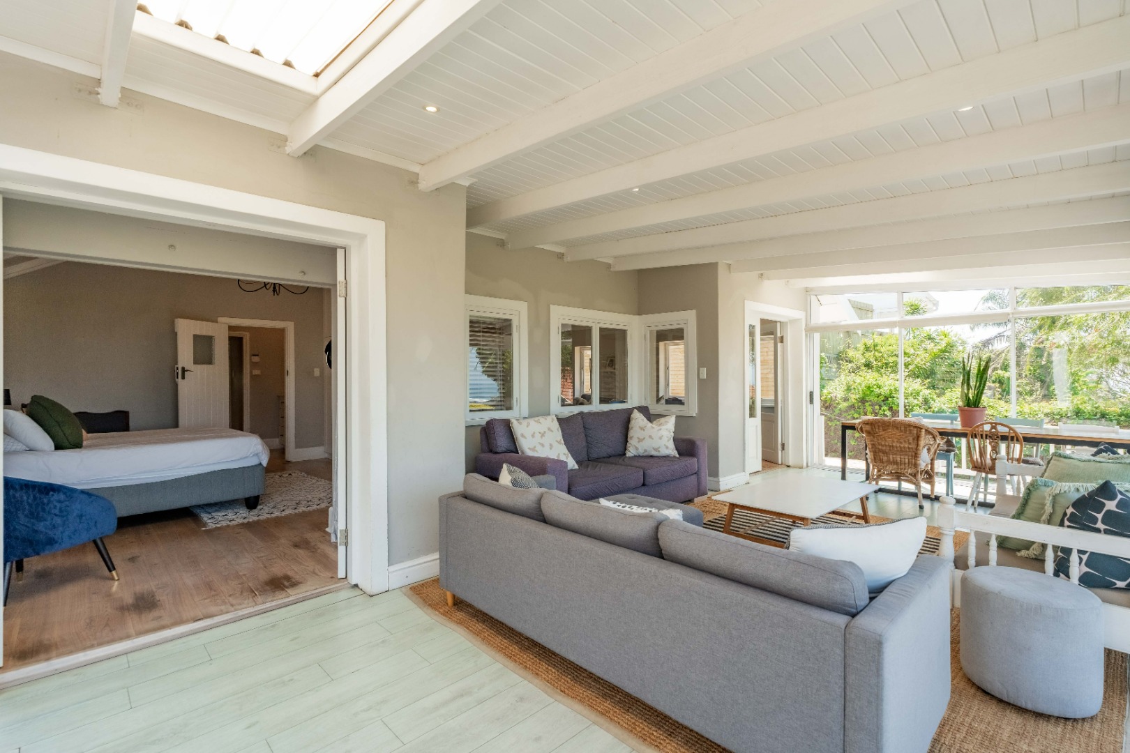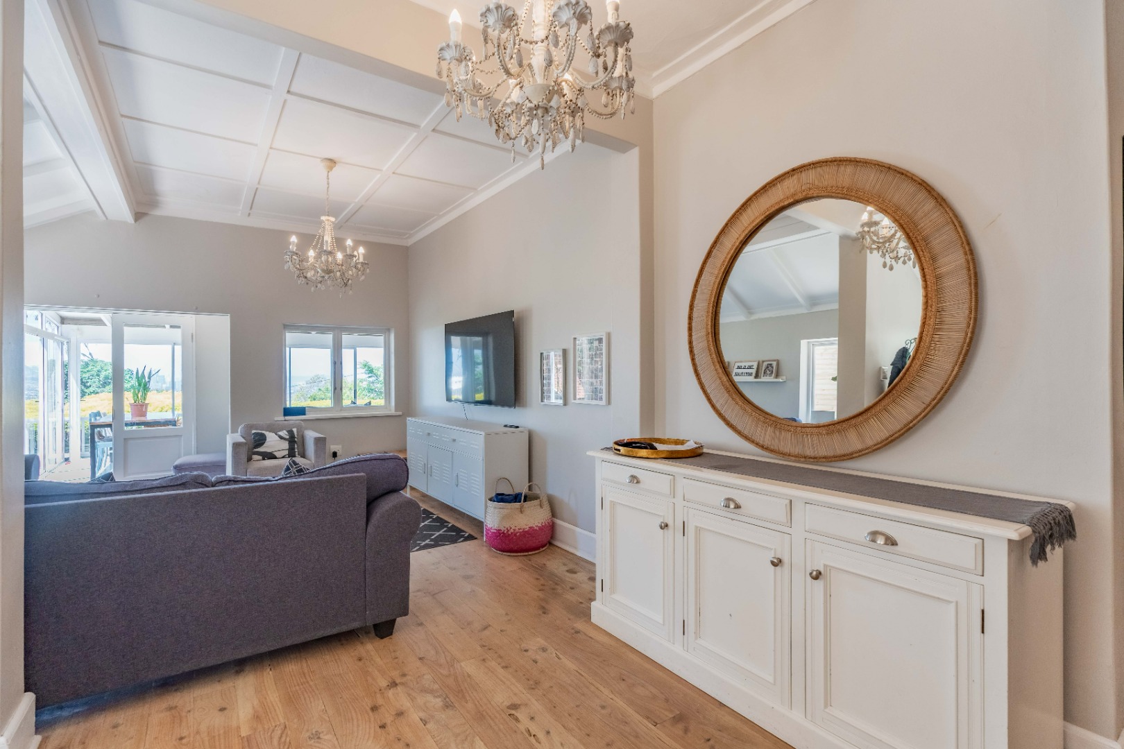 The interior features an inviting open-plan design, seamlessly connecting the living spaces. The heart of the home is a modern kitchen, equipped with white cabinetry, granite countertops, a large central island with seating, and a vibrant tiled backsplash. Further enhanced by vaulted ceilings, woven pendant lighting, and air conditioning. Two distinct lounges and two dining areas provide versatile options for relaxation and entertaining, all set on elegant hardwood flooring.