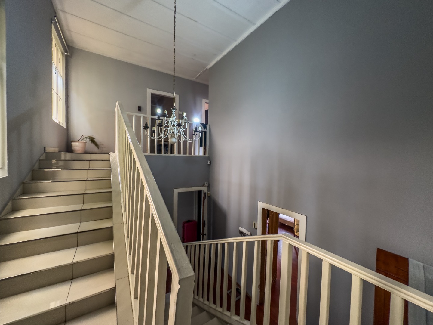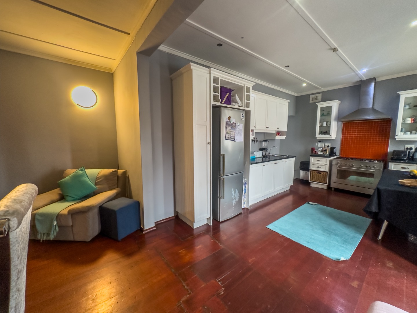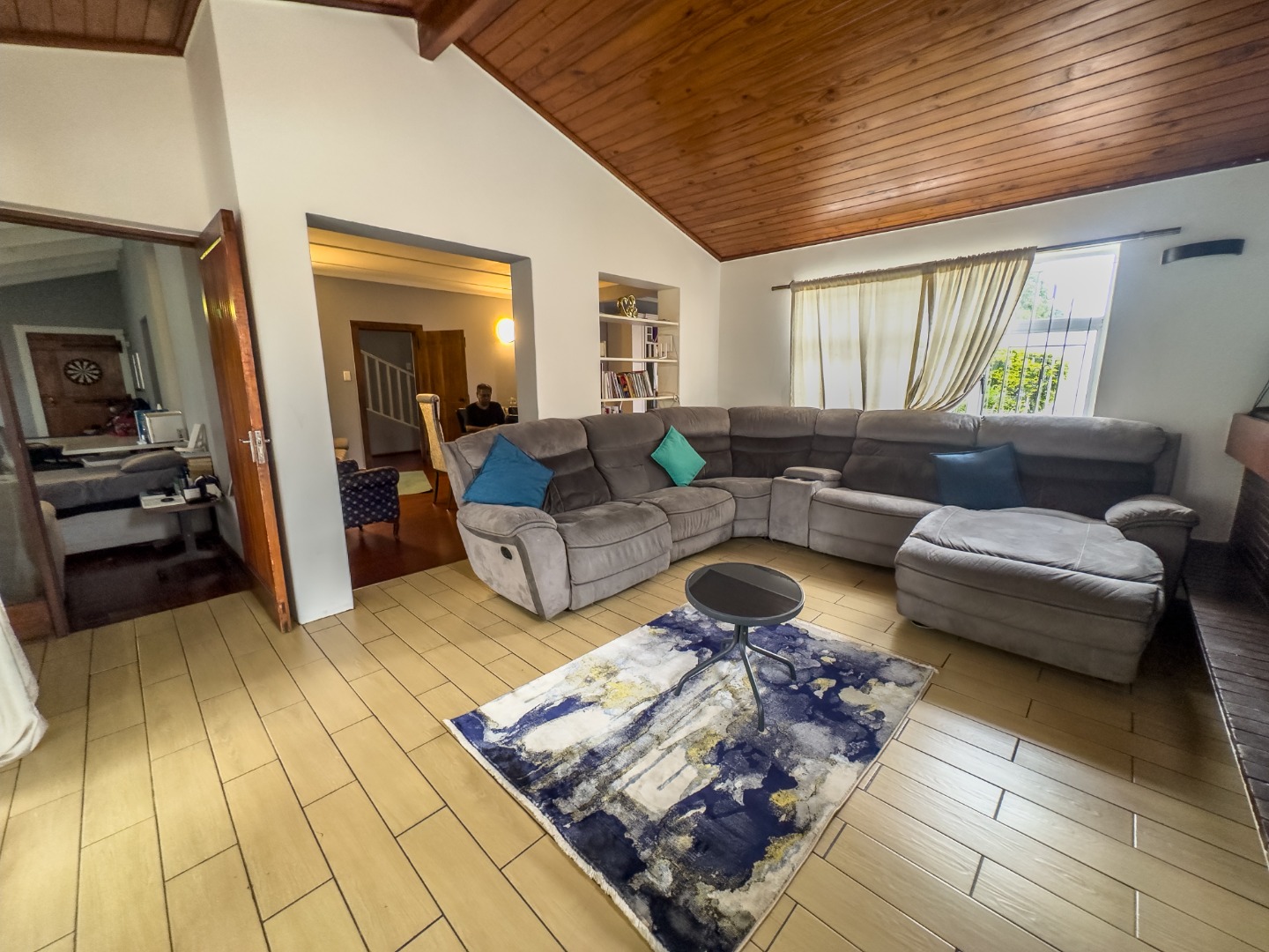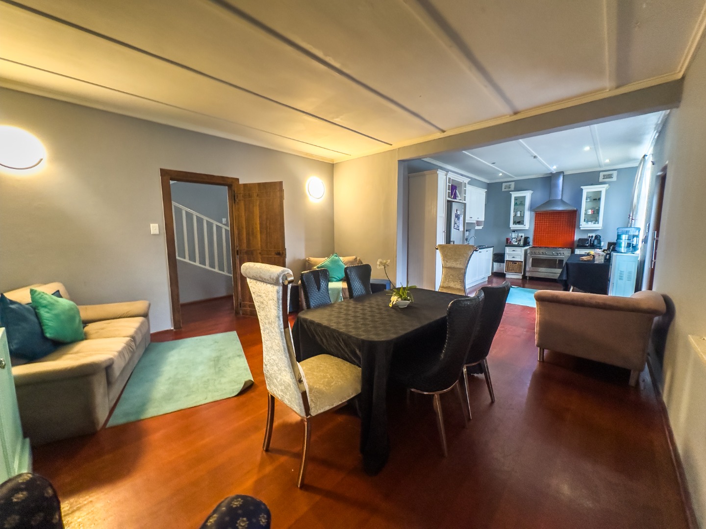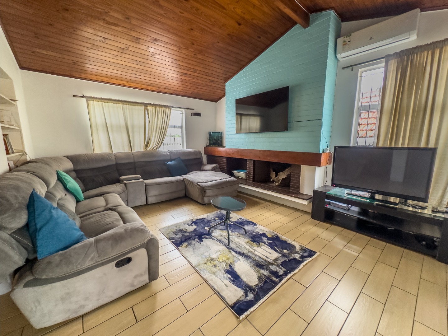 The kitchen stands out with its rustic finish, fitted with a gas stove, oven, and extractor fan. It flows effortlessly into an open-plan dining, living, and family room – perfect for both quiet nights in and entertaining. A built-in fireplace, pine ceilings, and wooden floors in the main lounge add a cozy, warm touch. Downstairs features a generously sized bedroom with space for a shared setup or study nook, and a stylish bathroom with a sunk-in shower. The wide hallway leads to a striking wooden staircase lit by a stunning chandelier.